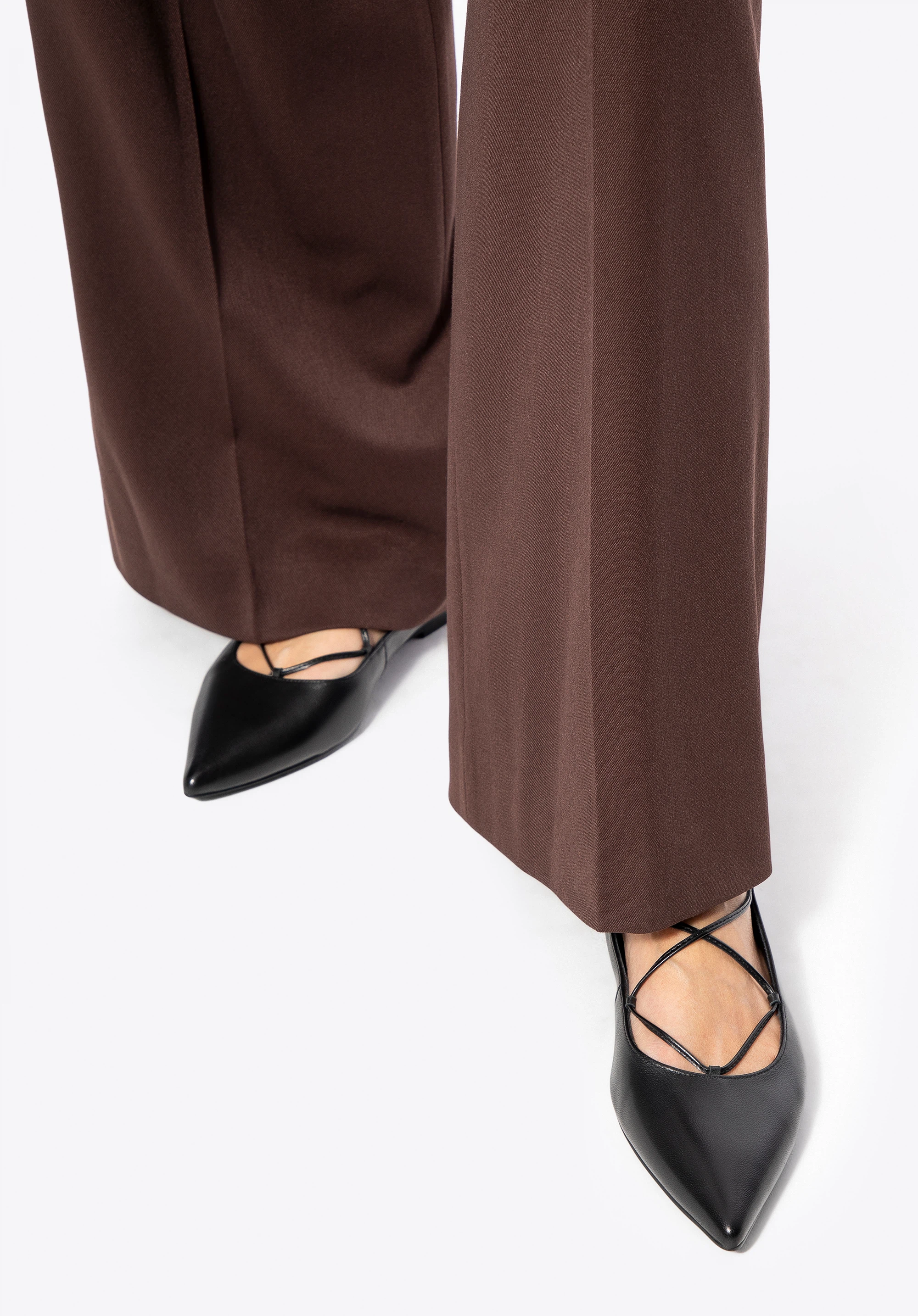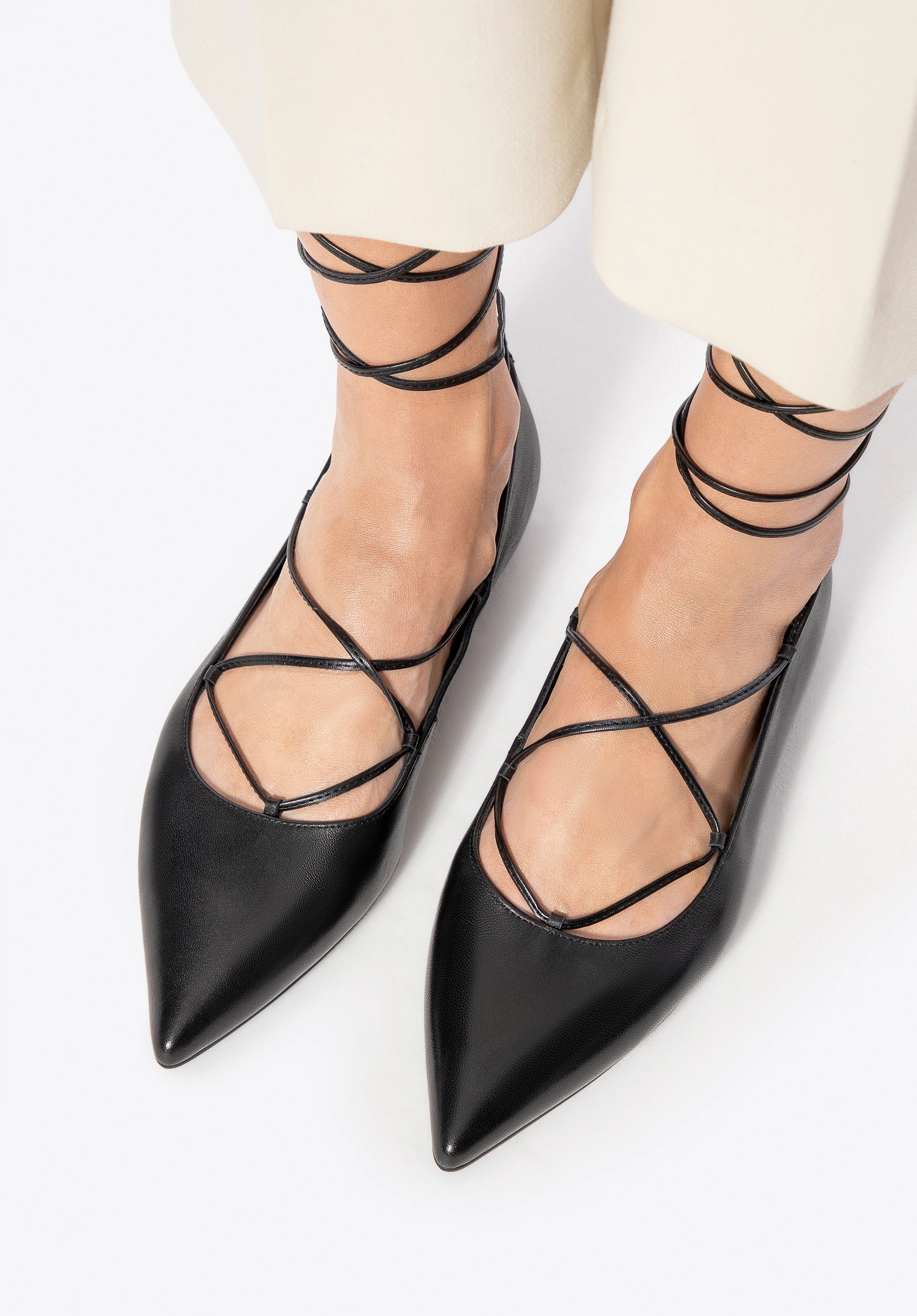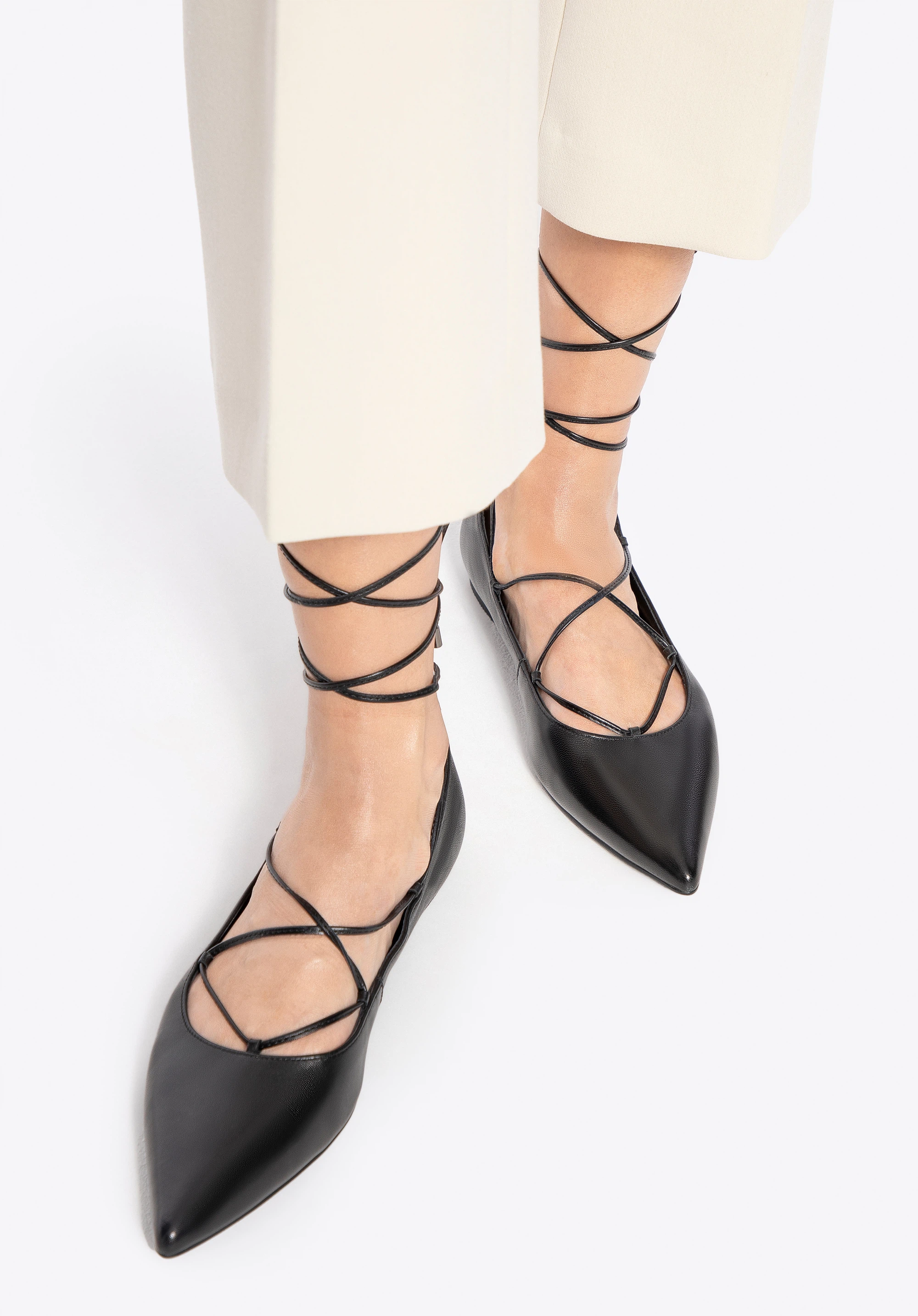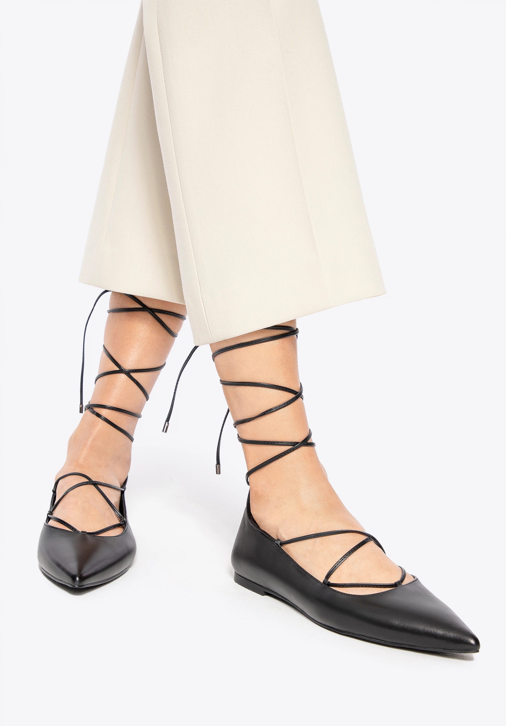 Eleganța și feminitatea se întâlnesc aici într-un echilibru perfect. Acești balerini din piele naturală se remarcă printr-un design subtil, dar ferm. Vârful ascuțit adaugă lejeritate siluetei și alungește optic piciorul, iar șireturile de legat și înfășurat în jurul gleznei introduc o notă de senzualitate și stil personal. Căptușeala și branțul din piele asigură un confort plăcut la purtare, iar talpa din cauciuc oferă flexibilitate și stabilitate la fiecare pas.