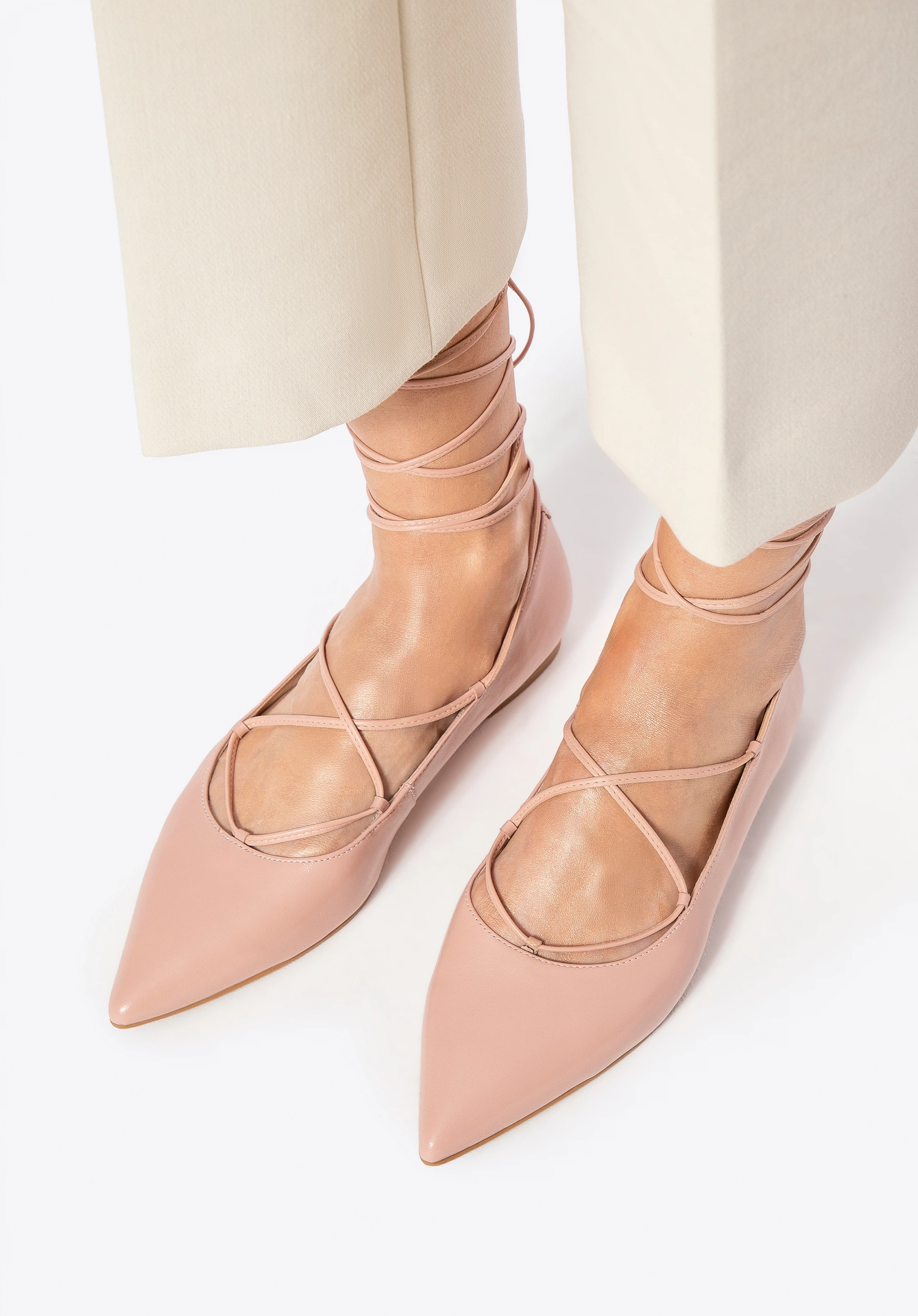 Eleganța și feminitatea se întâlnesc aici într-un echilibru perfect. Acești balerini din piele naturală se remarcă printr-un design subtil, dar ferm. Vârful ascuțit adaugă lejeritate siluetei și alungește optic piciorul, iar șireturile de legat și înfășurat în jurul gleznei introduc o notă de senzualitate și stil personal. Căptușeala și branțul din piele asigură un confort plăcut la purtare, iar talpa din cauciuc oferă flexibilitate și stabilitate la fiecare pas.