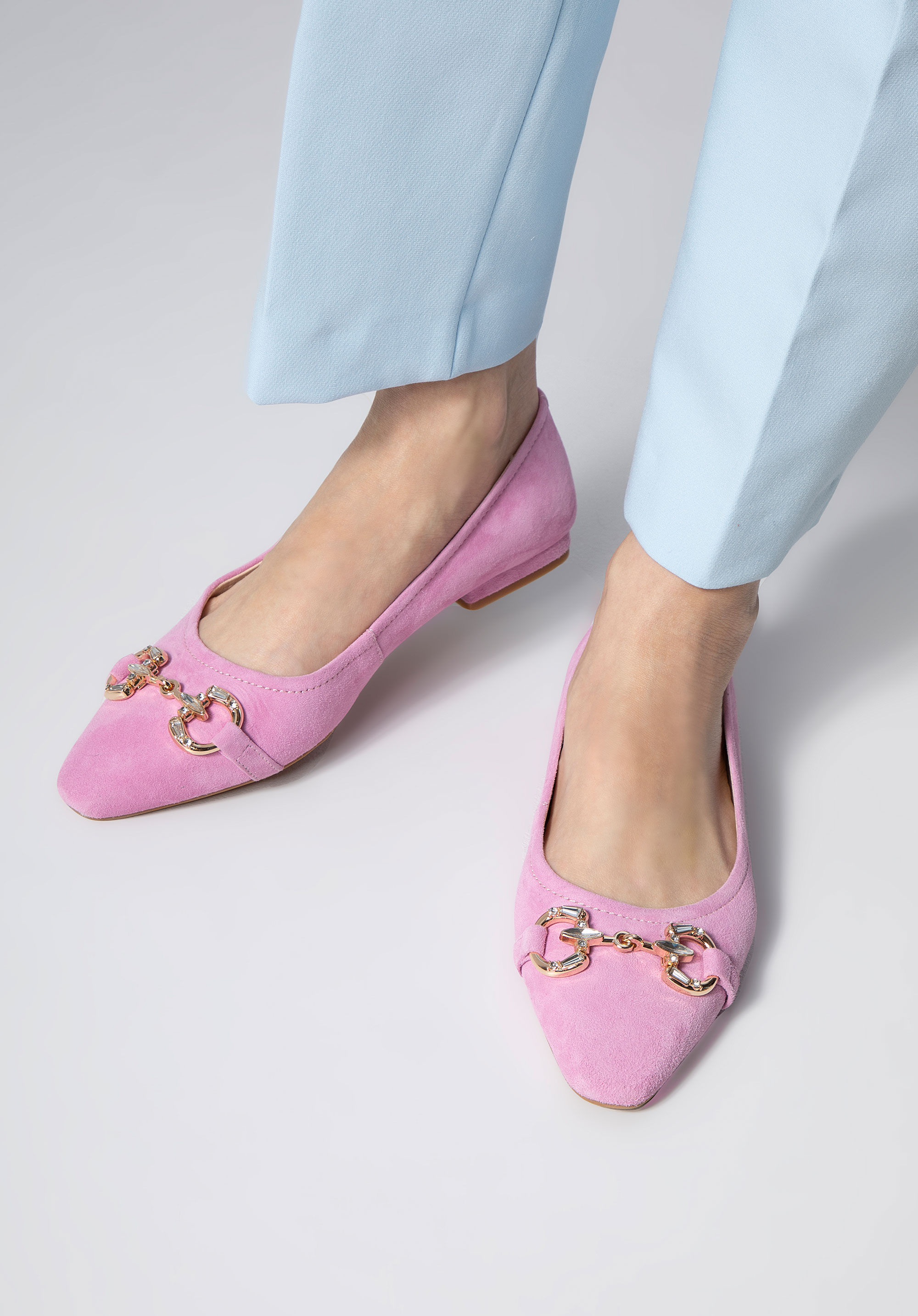 Balerinii eleganți sunt o alegere excelentă atât pentru muncă, cât și pentru după serviciu. Sunt confecționați din piele de căprioară de înaltă calitate. Strălucirea este adăugată de catarama smocks, care este decorată cu cristale strălucitoare. Datorită tălpii din piele, veți merge confortabil în ei ore întregi. În plus, vârful ascuțit va subția piciorul. Purtați-i cu rochia dvs. preferată sau adăugați o notă chic la blugi și o cămașă. Balerinii din piele întoarsă de căprioară cu cataramă îți vor pune în valoare aproape oricare dintre look-uri, așa că merită să îi ai în garderoba ta.