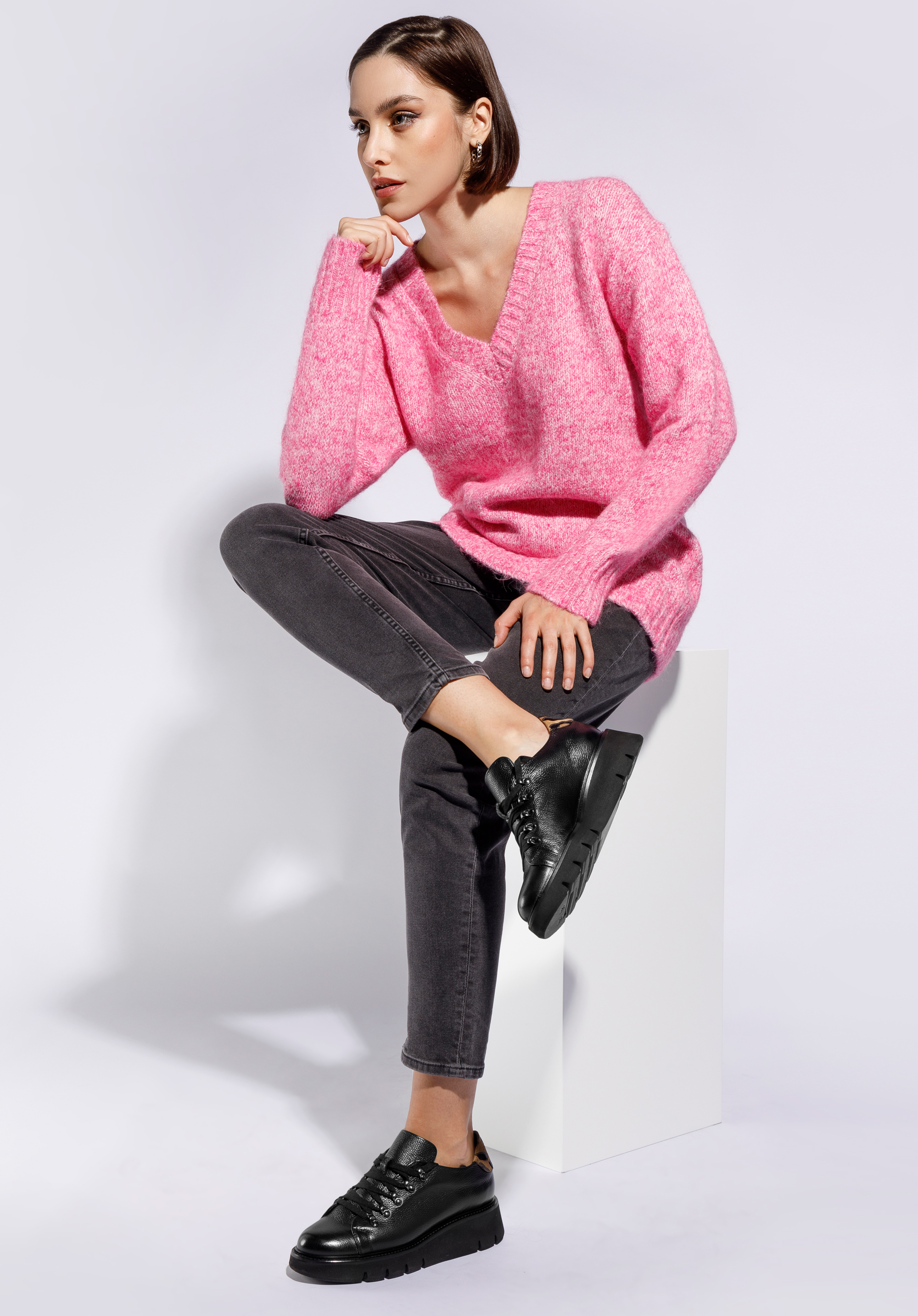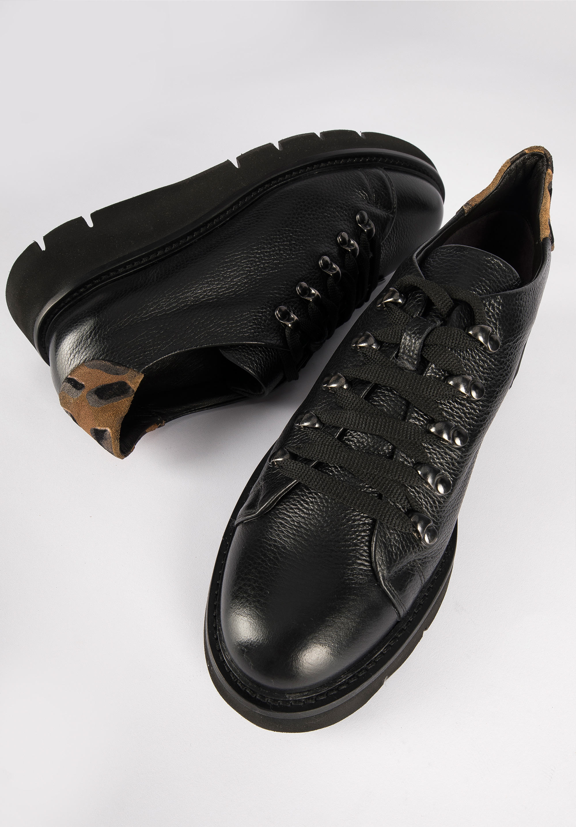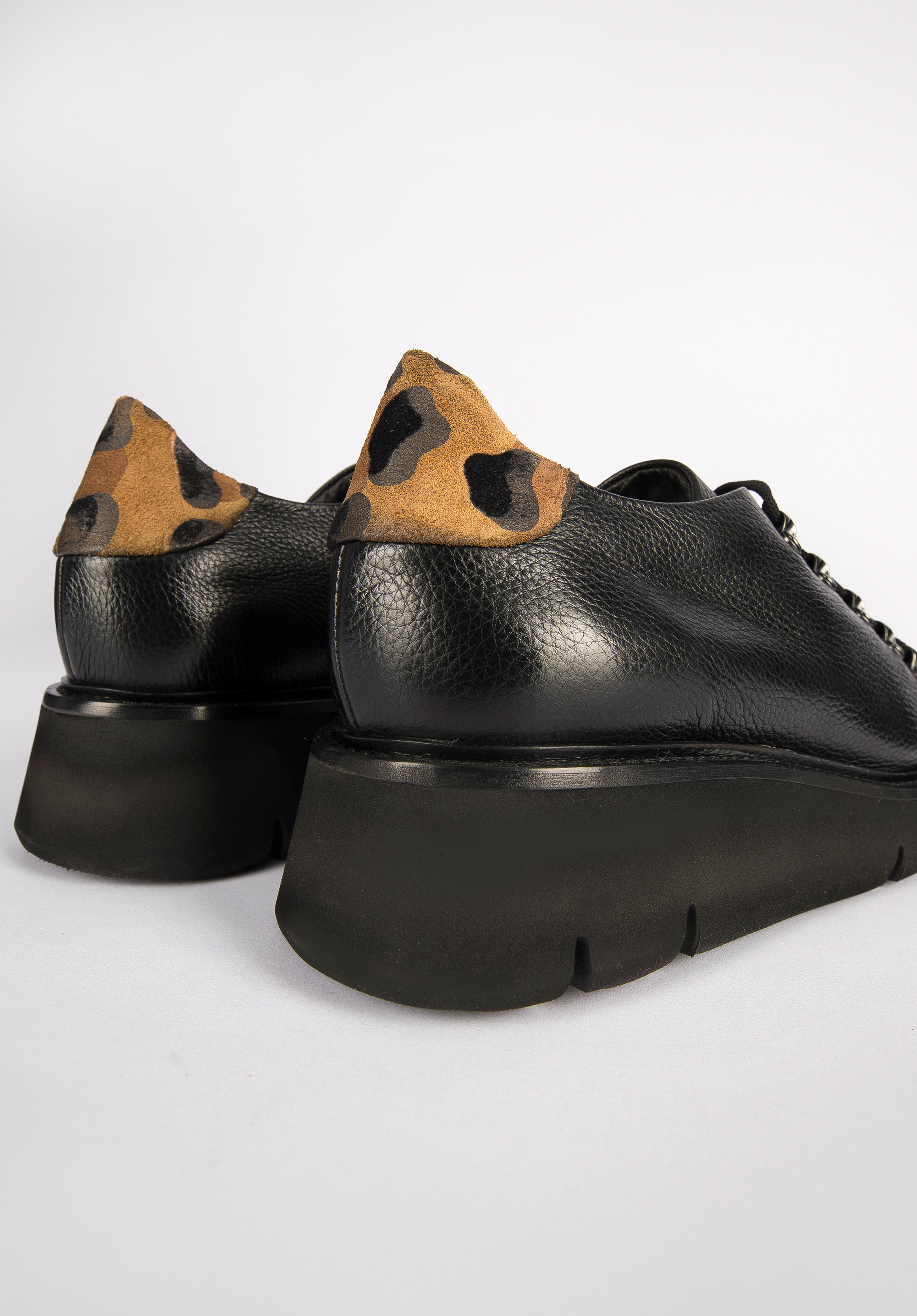 Acești pantofi eleganți vor fi pe placul iubitoarelor de clasic cu twist.Au un toc din piele întoarsă cu imprimeu leopard, care adaugă o notă de gheară.Partea de sus pantofului este simplă cu o tentă retro; amintind de încălțămintea clasică de drumeție.În acest sens, platforma groasă, dar ușoară este foarte modernă.De asemenea, vă va adăuga câțiva centimetri la înălțime.Pantofii au fost confecționați în Italia din piele naturală granulată de înaltă calitate.Îi puteți purta în fiecare zi atât cu pantaloni din catifea și un pulover, cât și cu rochii casual; vor adăuga o notă retro chic oricărei ținute.Pantofii de damă din piele cu inserție de leopard pot deveni pantofii dvs. favoriți de zi cu zi.