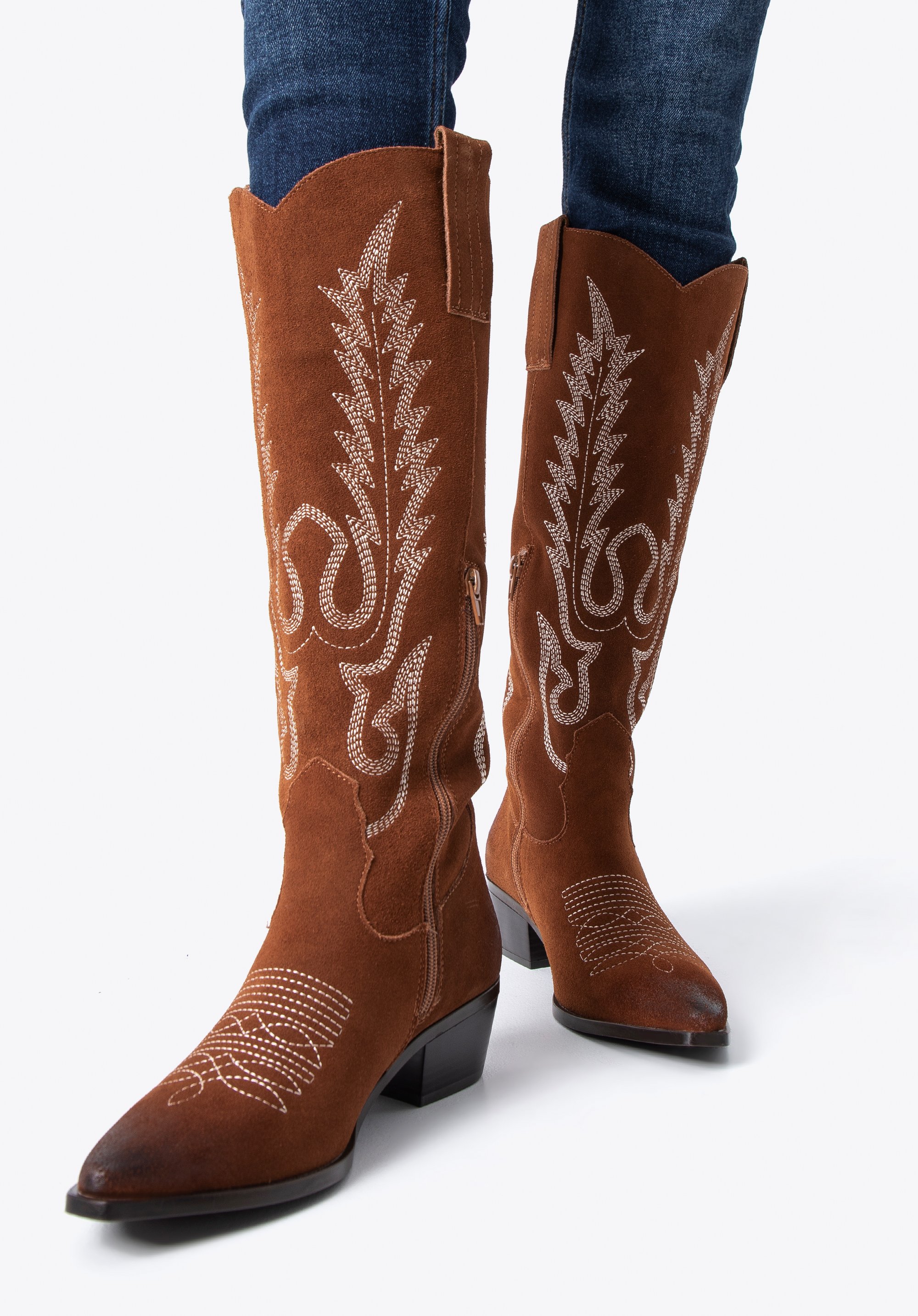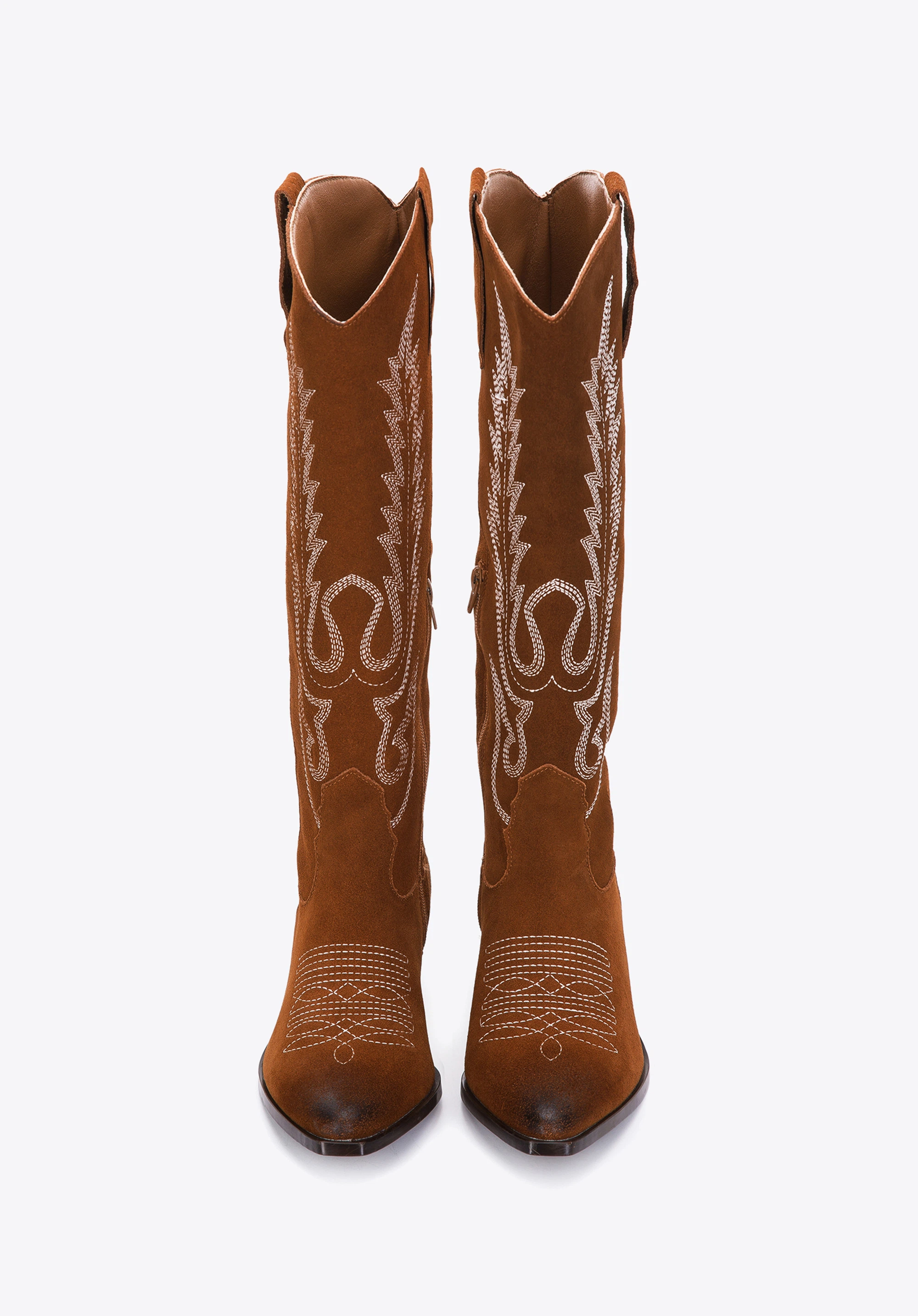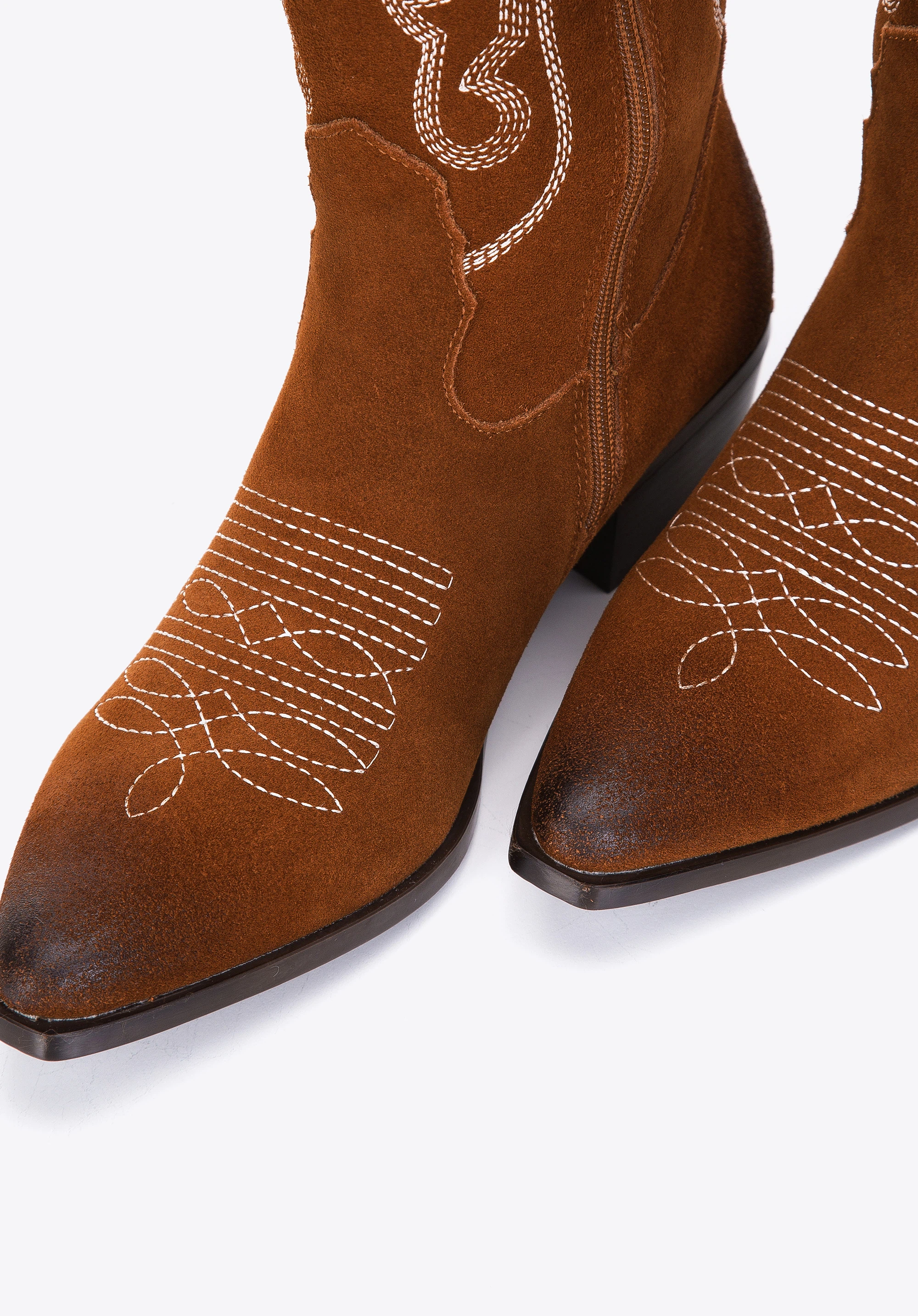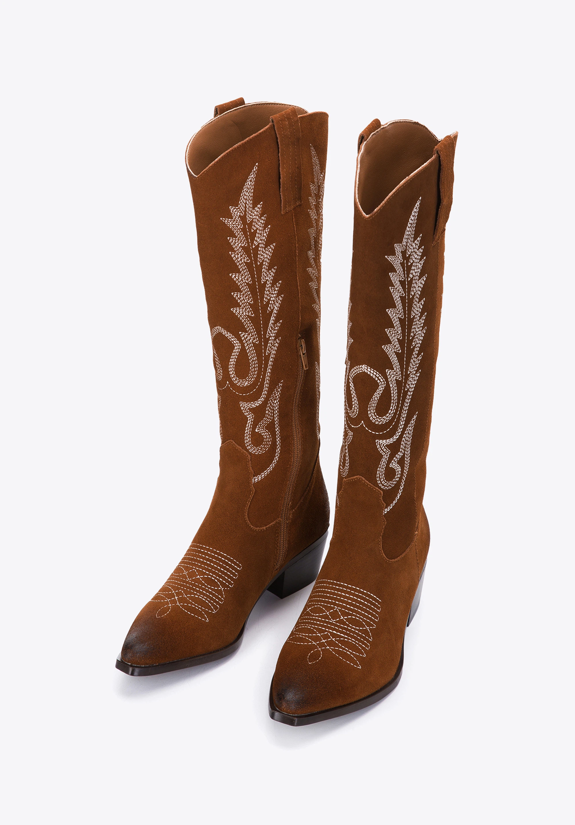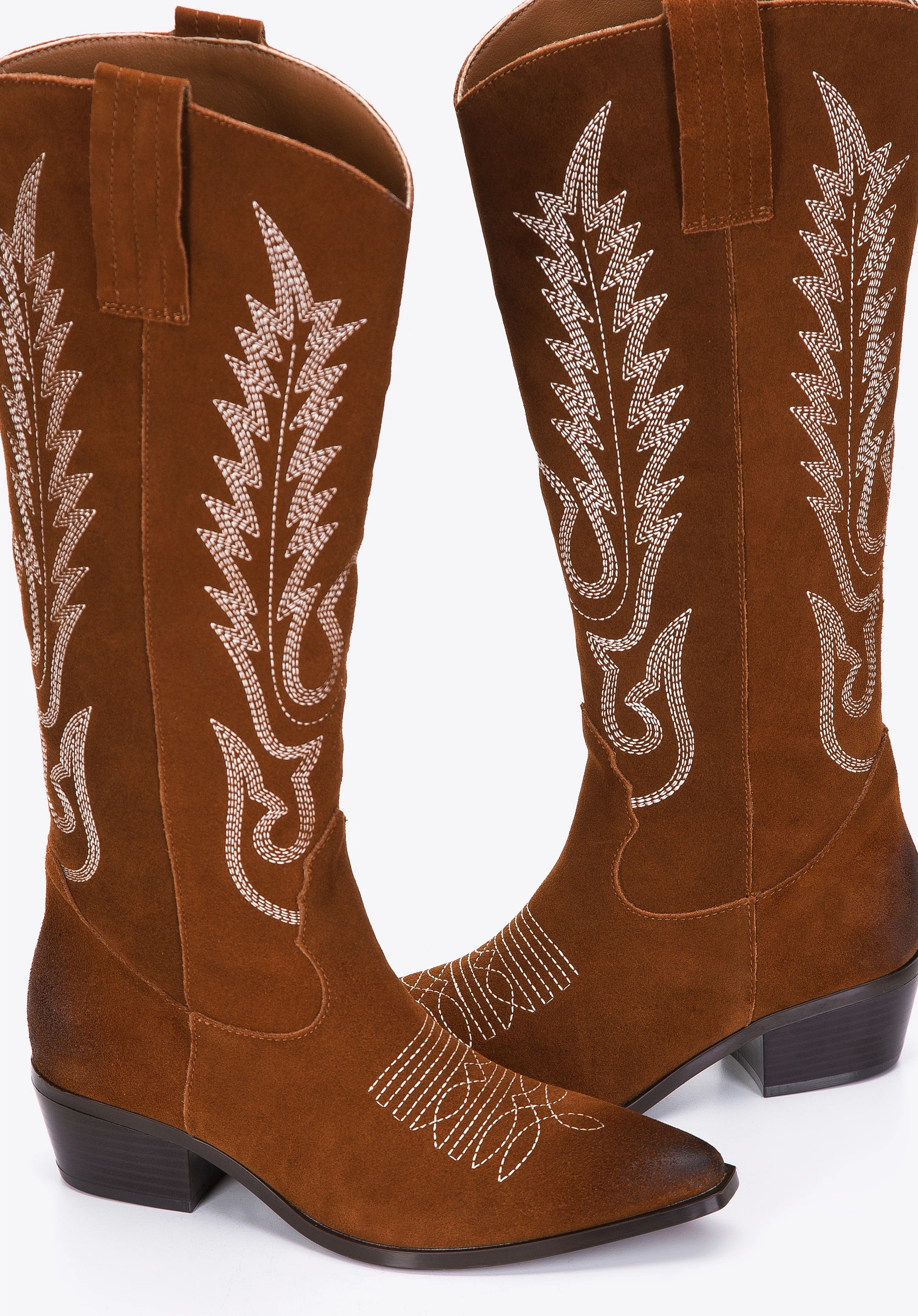 Cizme de cowboy înalte din piele întoarsă brodată maro