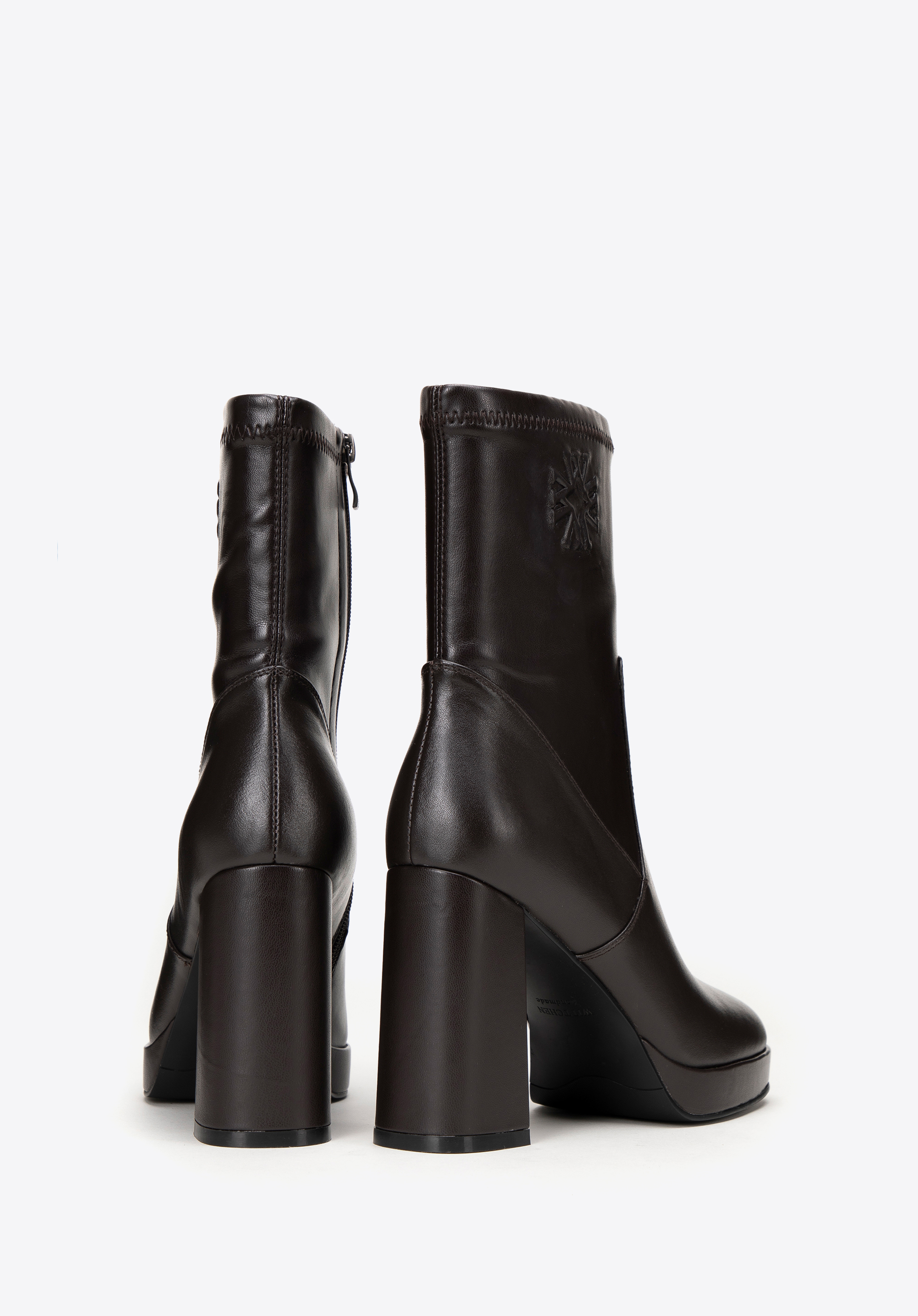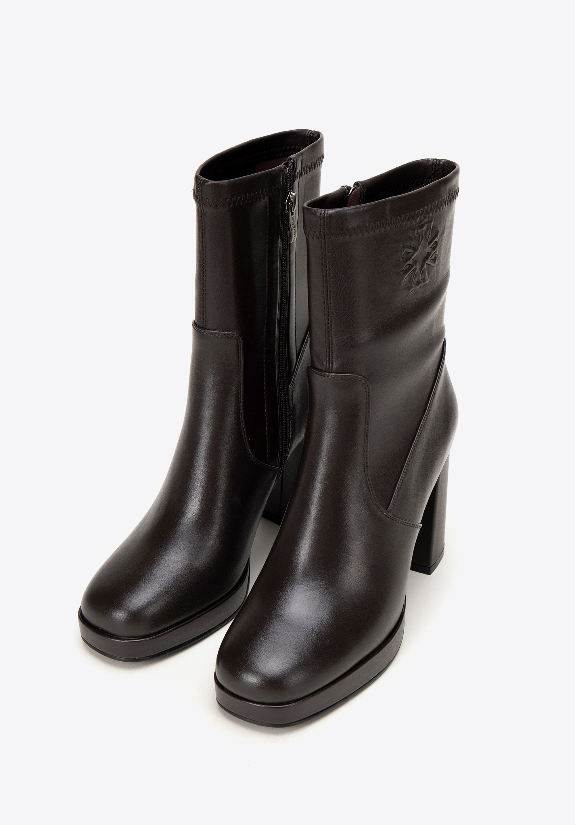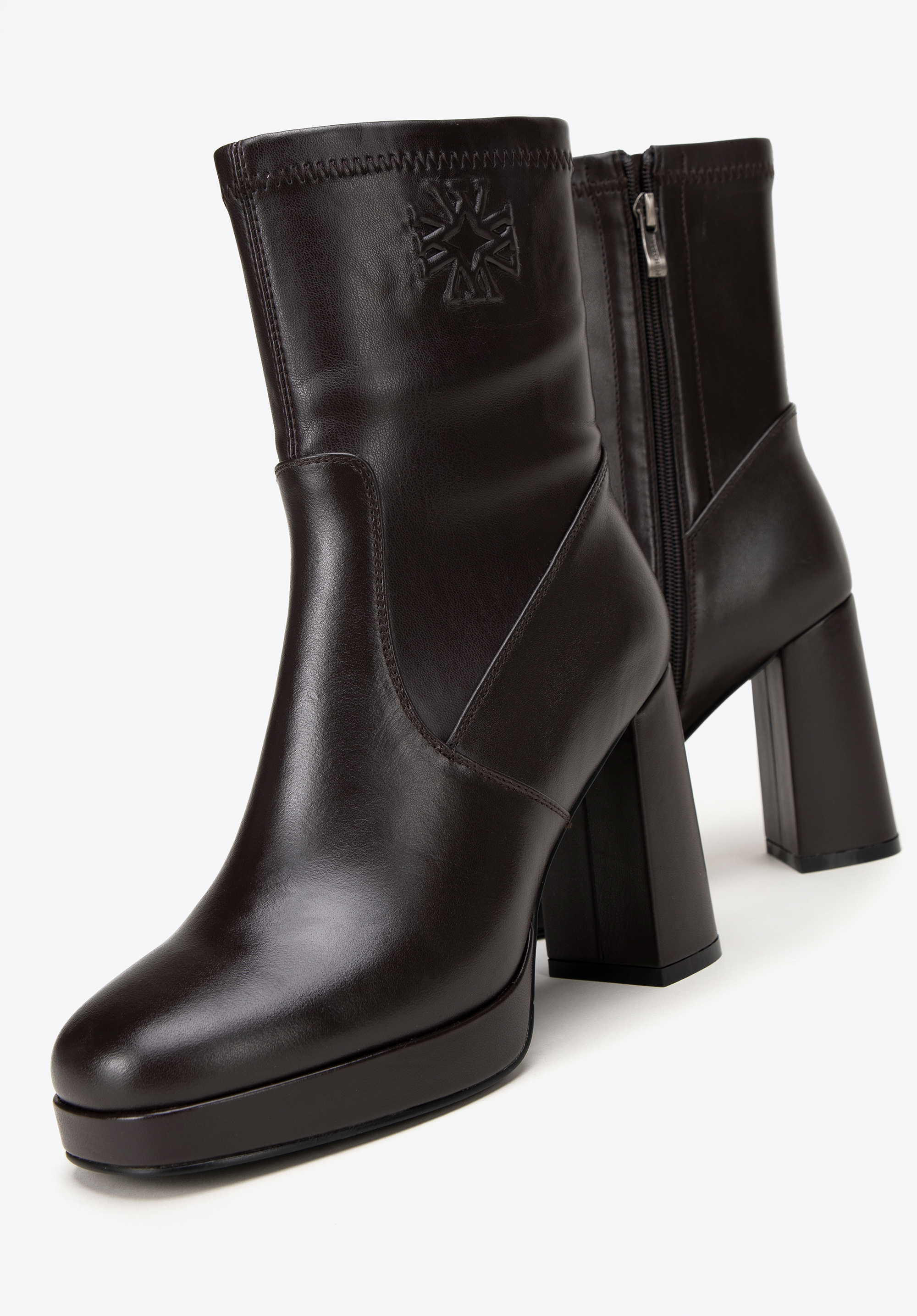 Descoperă luxul și stilul modern într-un singur pas cu botinele noastre elegante de damă din piele naturală de înaltă calitate, cu detalii subtile din imitație de piele. Acești pantofi unici combină designul clasic cu un accent modern, oferind nu doar stil, ci și confort. Acest pantof este echipat cu un vârf pătrat, garantând nu numai un aspect unic, ci și un confort extraordinar de purtare. O monogramă subtilă în relief la gleznă adaugă un aspect rafinat. Tocul bloc foarte înalt, elegant, subțiază optic piciorul, iar platforma încorporată mărește confortul la purtare și un aspect la modă.