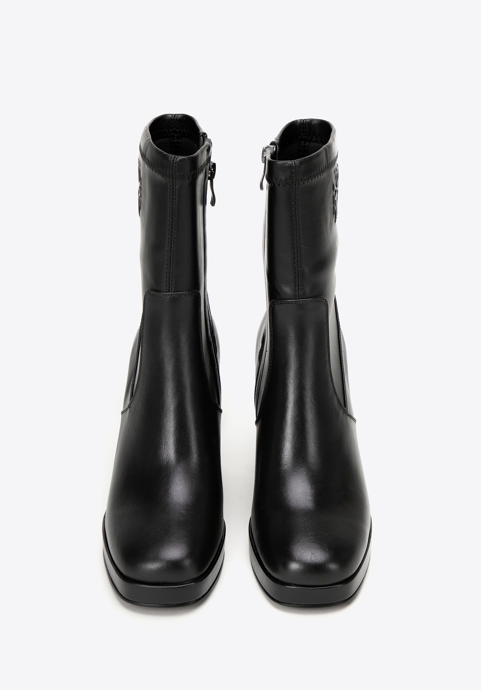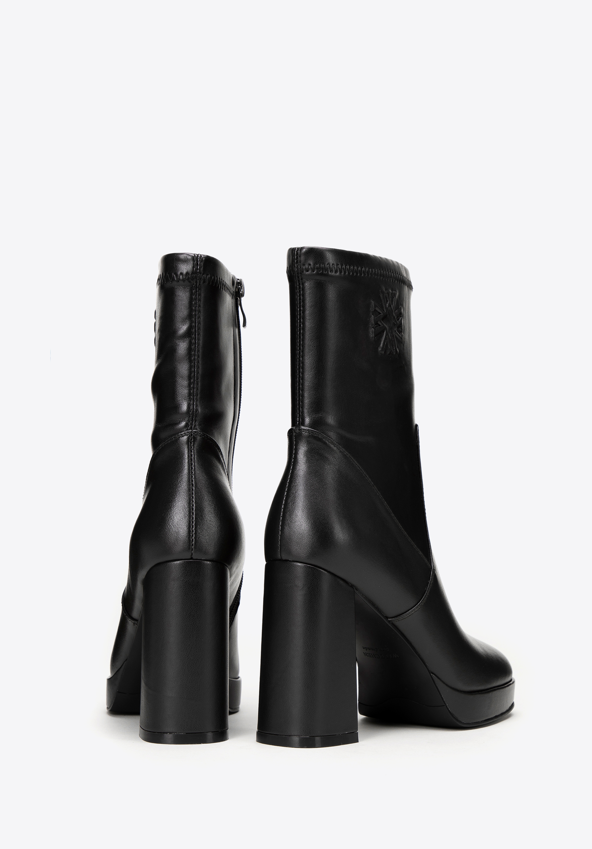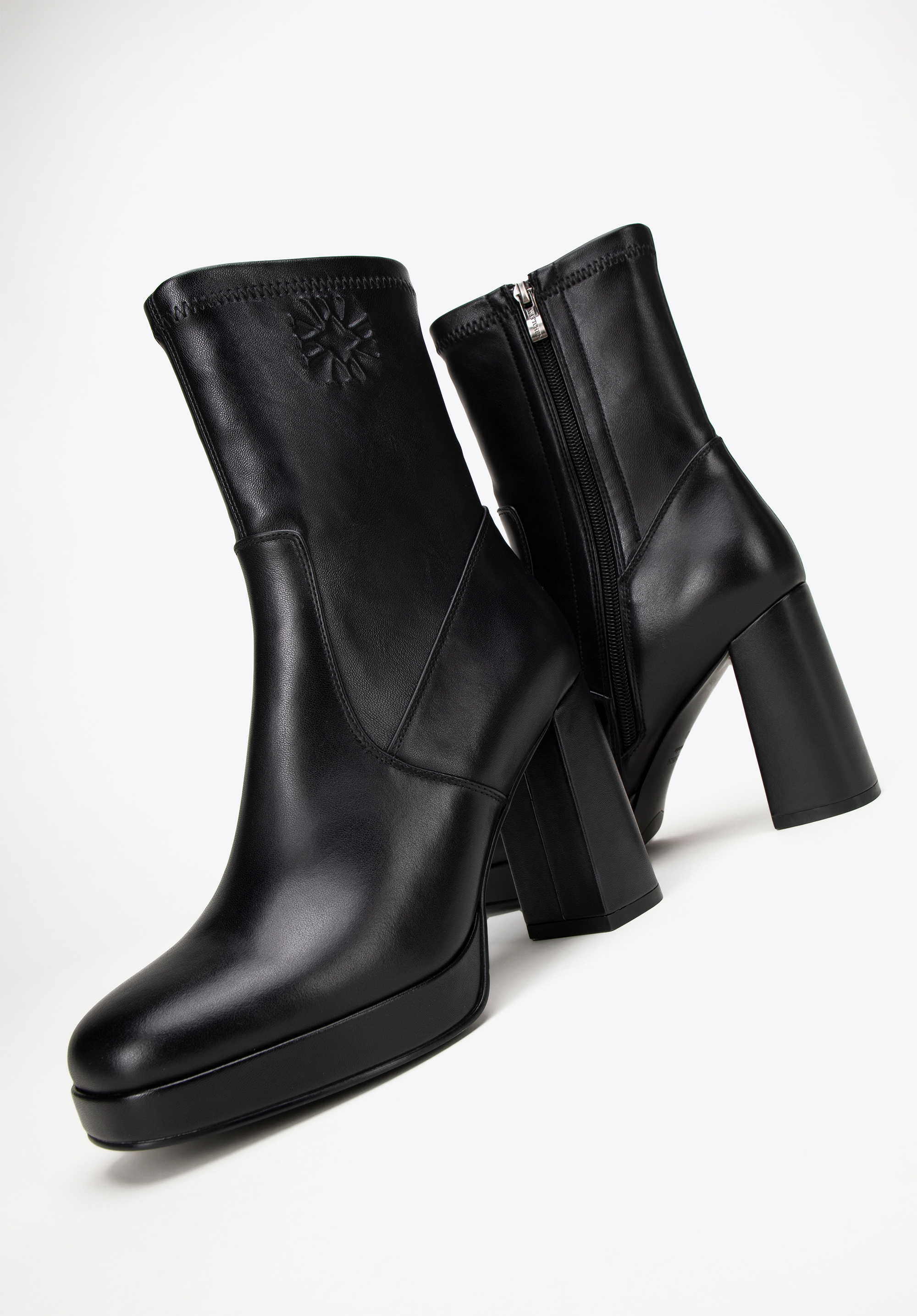 Descoperă luxul și stilul modern într-un singur pas cu botinele noastre elegante de damă din piele naturală de înaltă calitate, cu detalii subtile din imitație de piele. Acești pantofi unici combină designul clasic cu un accent modern, oferind nu doar stil, ci și confort. Acest pantof este echipat cu un vârf pătrat, garantând nu numai un aspect unic, ci și un confort extraordinar de purtare. O monogramă subtilă în relief la gleznă adaugă un aspect rafinat. Tocul bloc foarte înalt, elegant, subțiază optic piciorul, iar platforma încorporată mărește confortul la purtare și un aspect la modă.