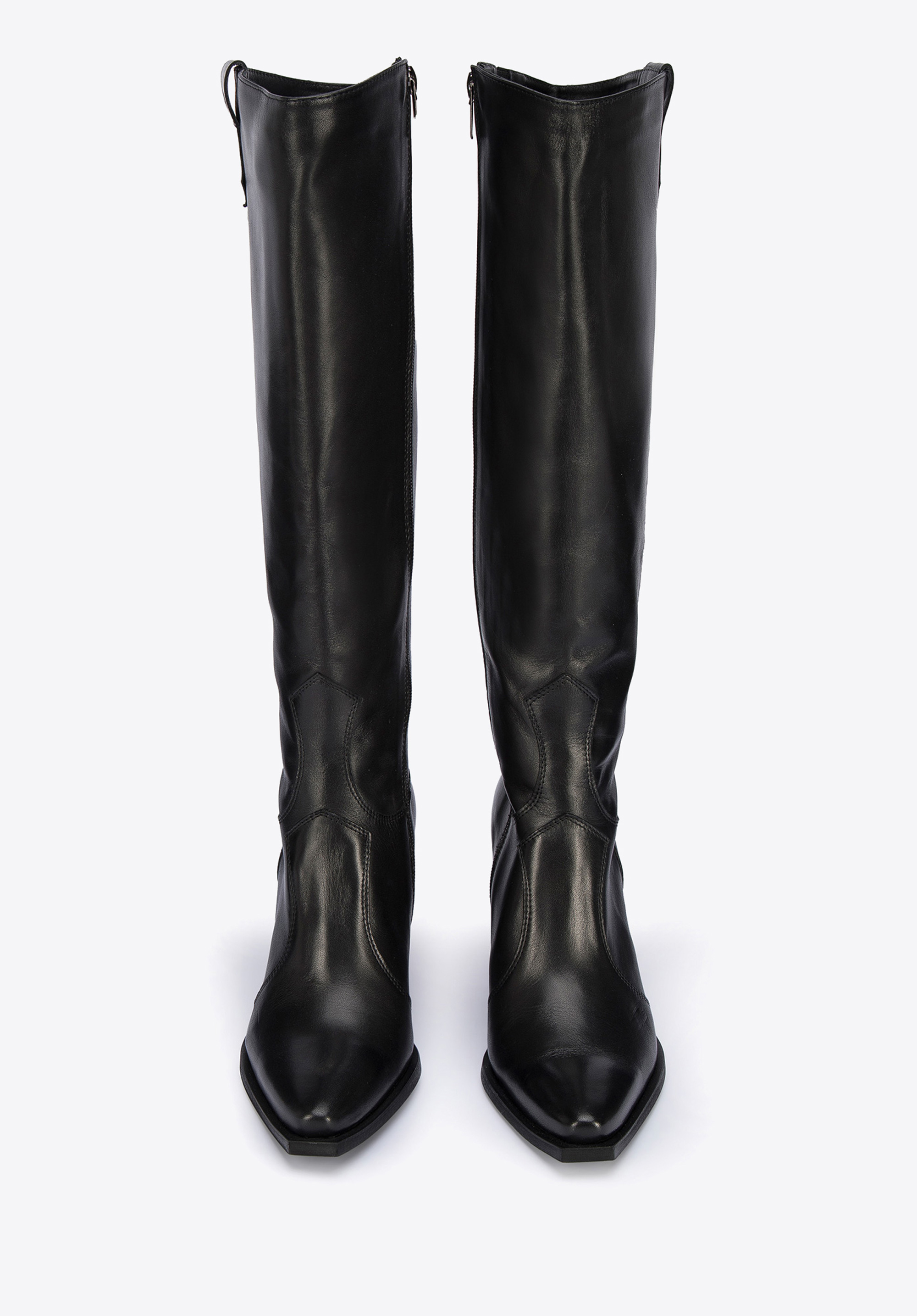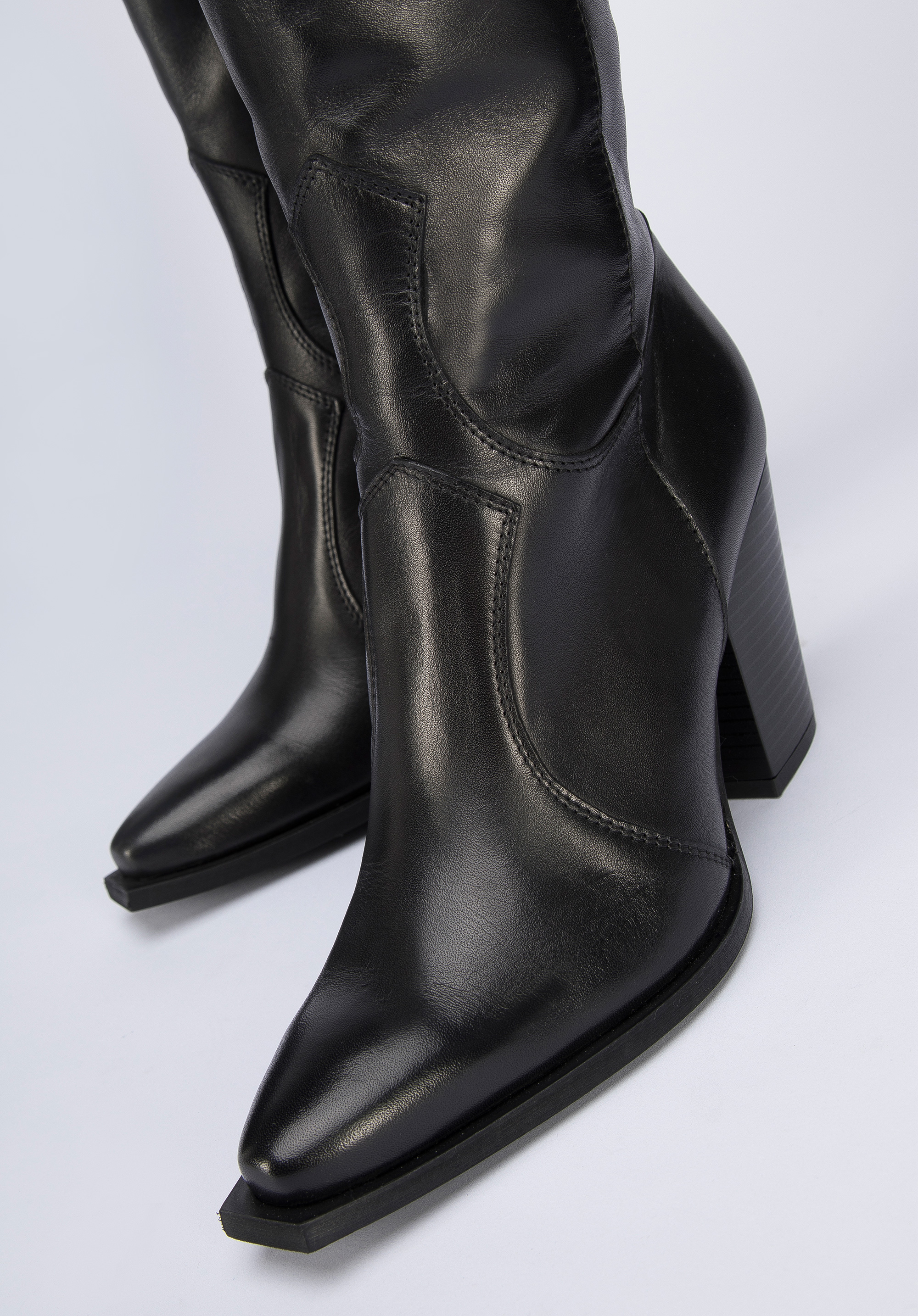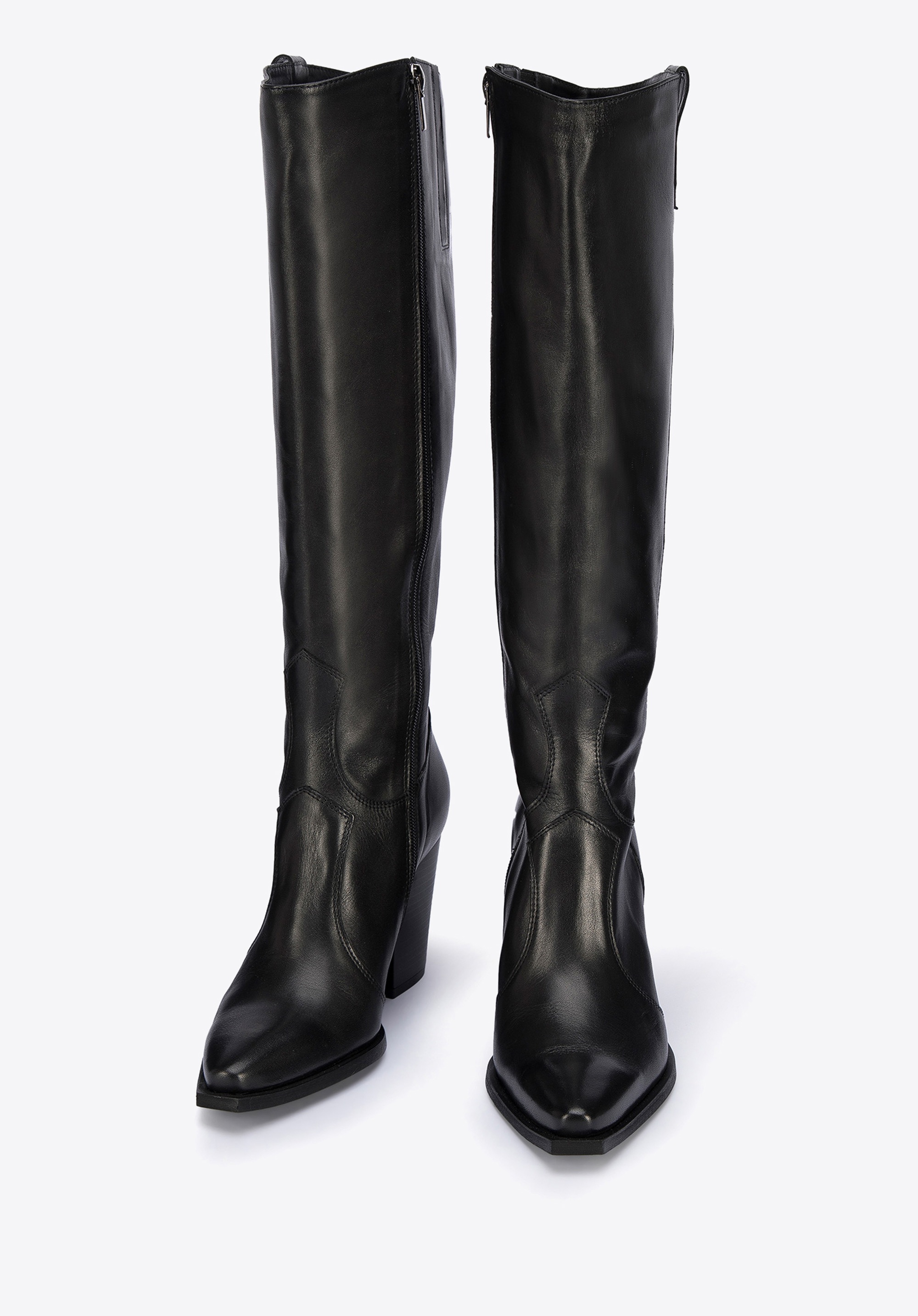 Partea superioară lungă va accentua piciorul, iar aceștia sunt ușor de purtat datorită fermoarului intern.Cizmele de cowboy din piele cu toc înalt sunt o completare excelentă atât la rochiile feminine cu volane, cât și cu blugi și o jachetă din piele;