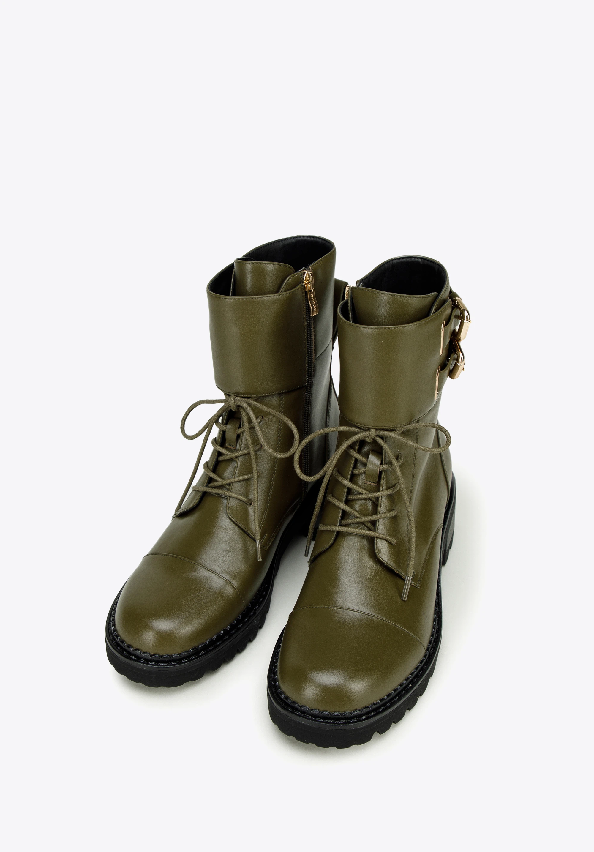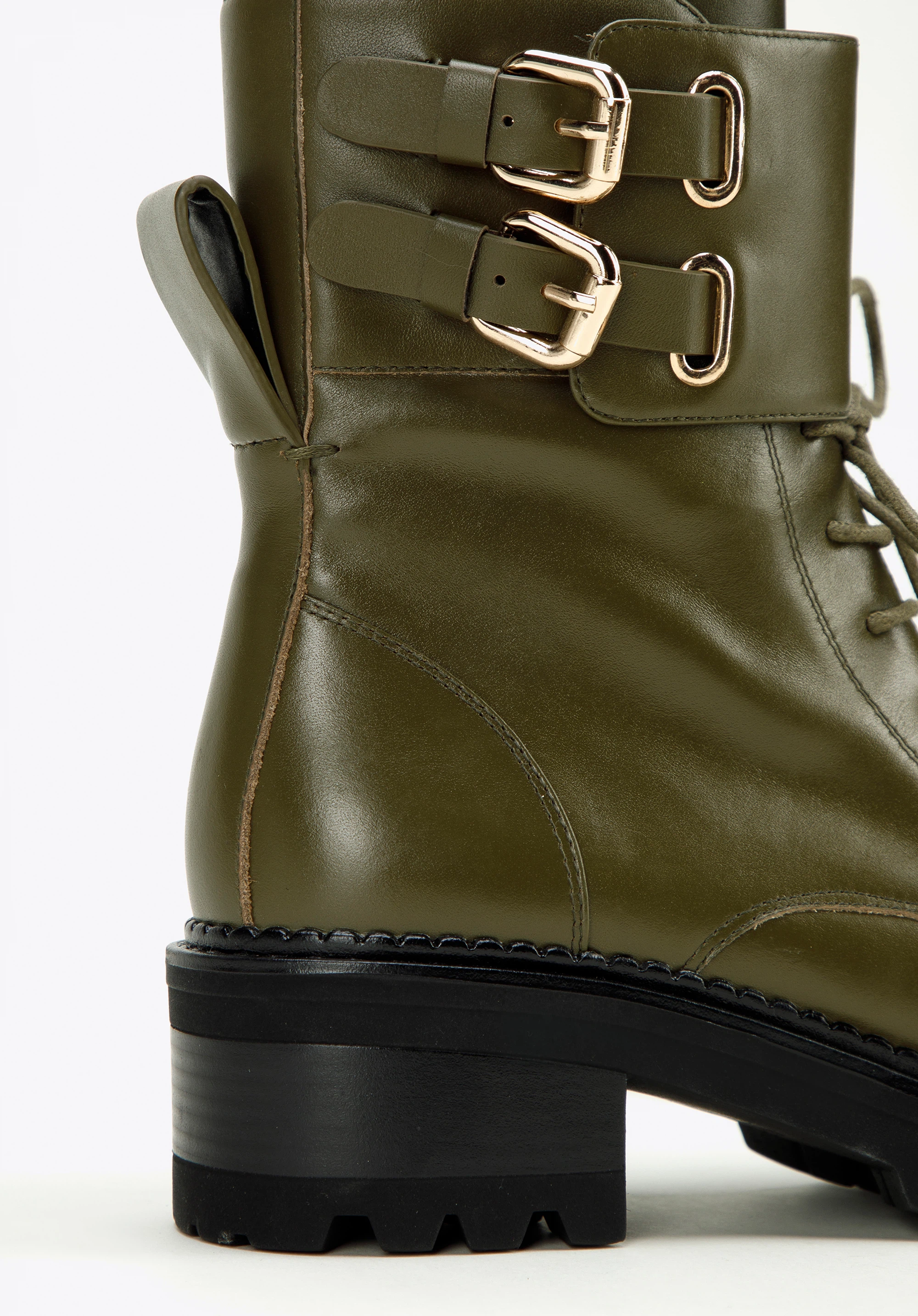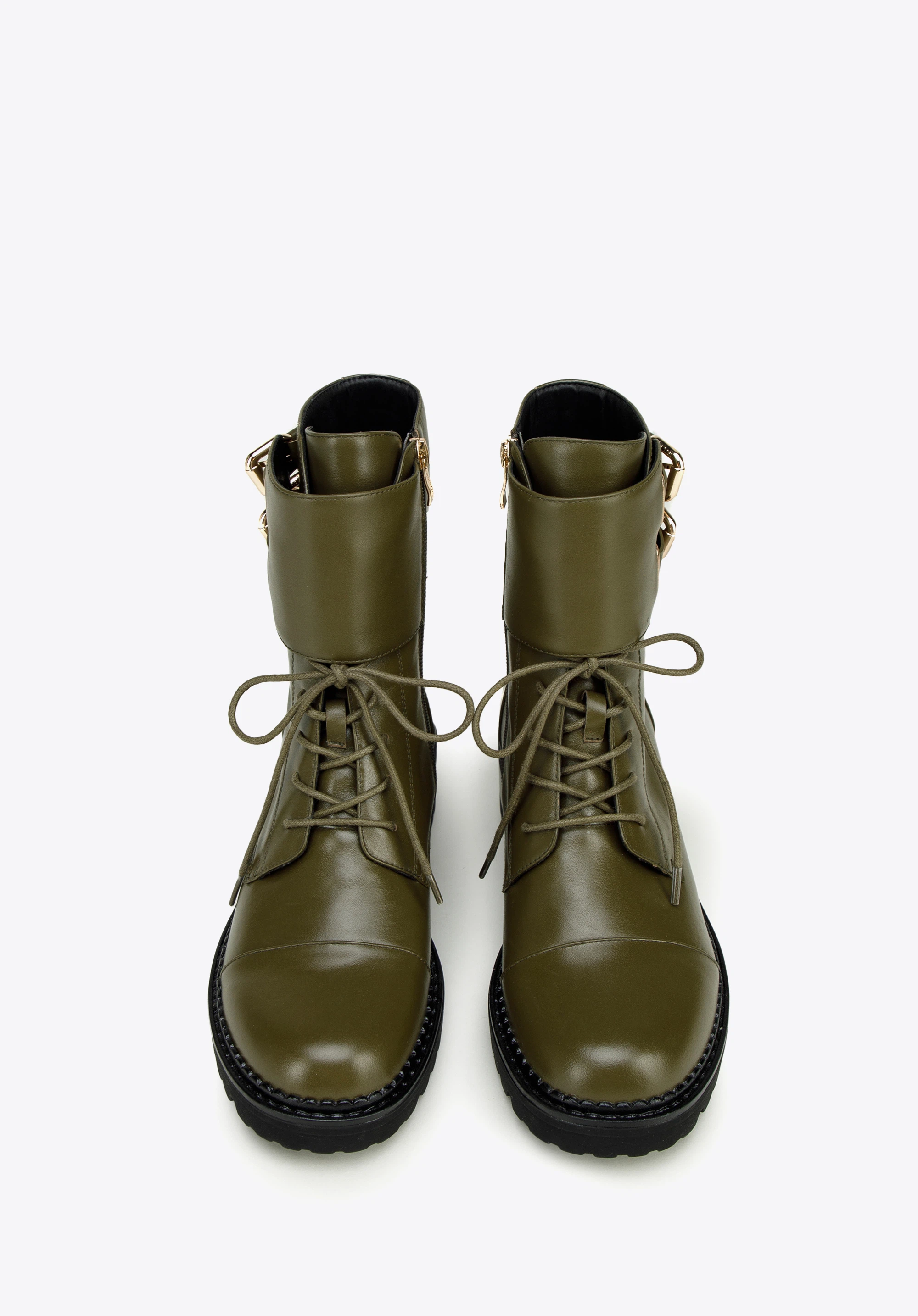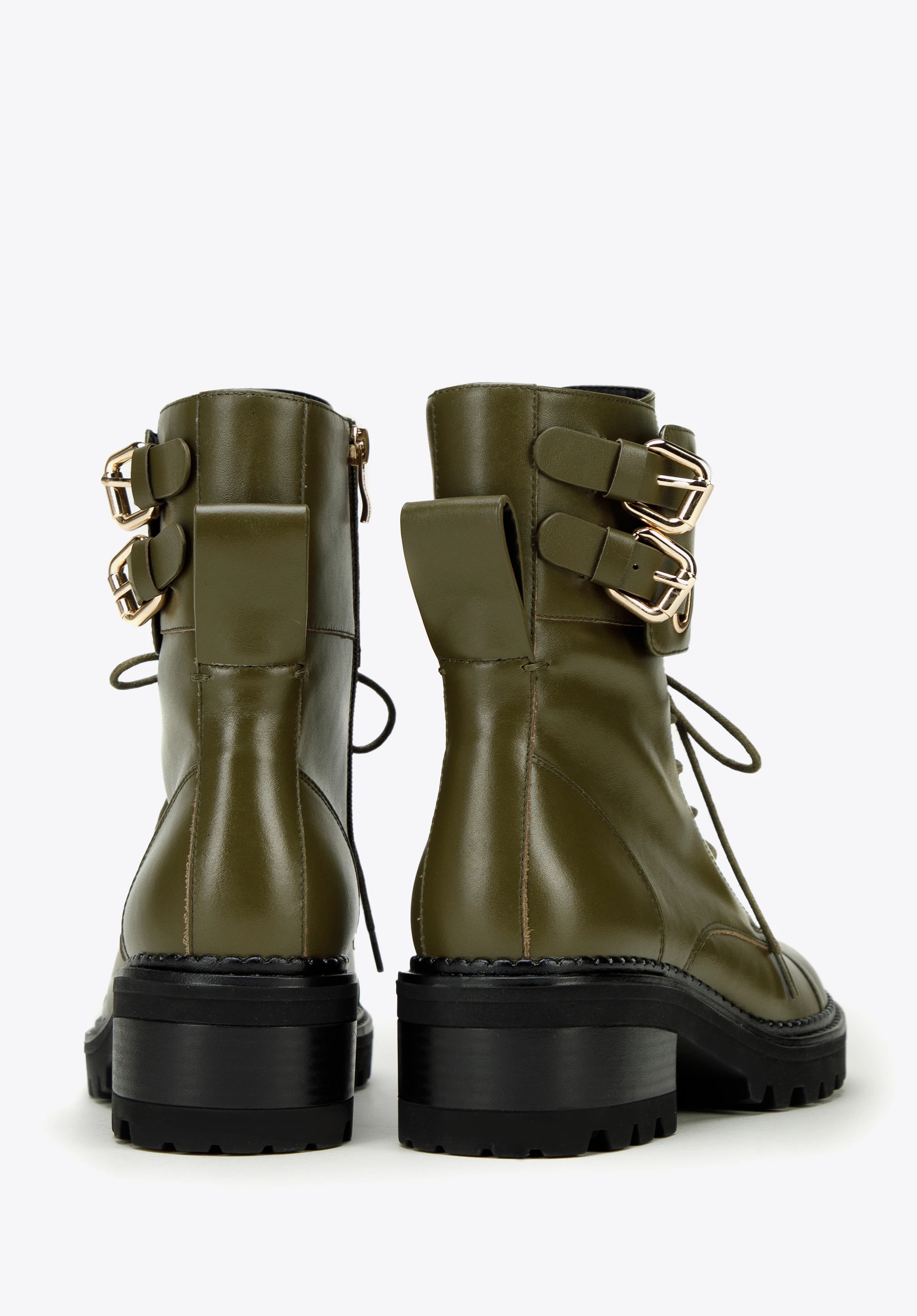 Aceste botine elegante cu șireturi sunt concepute pentru aventurile pe vreme de iarnă. Confecționat din piele naturală de calitate superioară , stilul inspirat de drumeții. Cu o talpă de cauciuc groasă și o clemă practică pentru călcâi. Cu o cataramă cu curea dublă la gleznă , aceste botine vor aduce cantitatea potrivită de atitudine și rafinament oricărei ținute. Având fermoar practic în lateral și închidere cu curele cu cataramă dublă, aceste cizme sunt însoțitorul ideal pentru picioarele tale în zilele de iarnă. Adaugă un plus în colecția ta de pantofi cu o pereche de cizme de luptă groase.