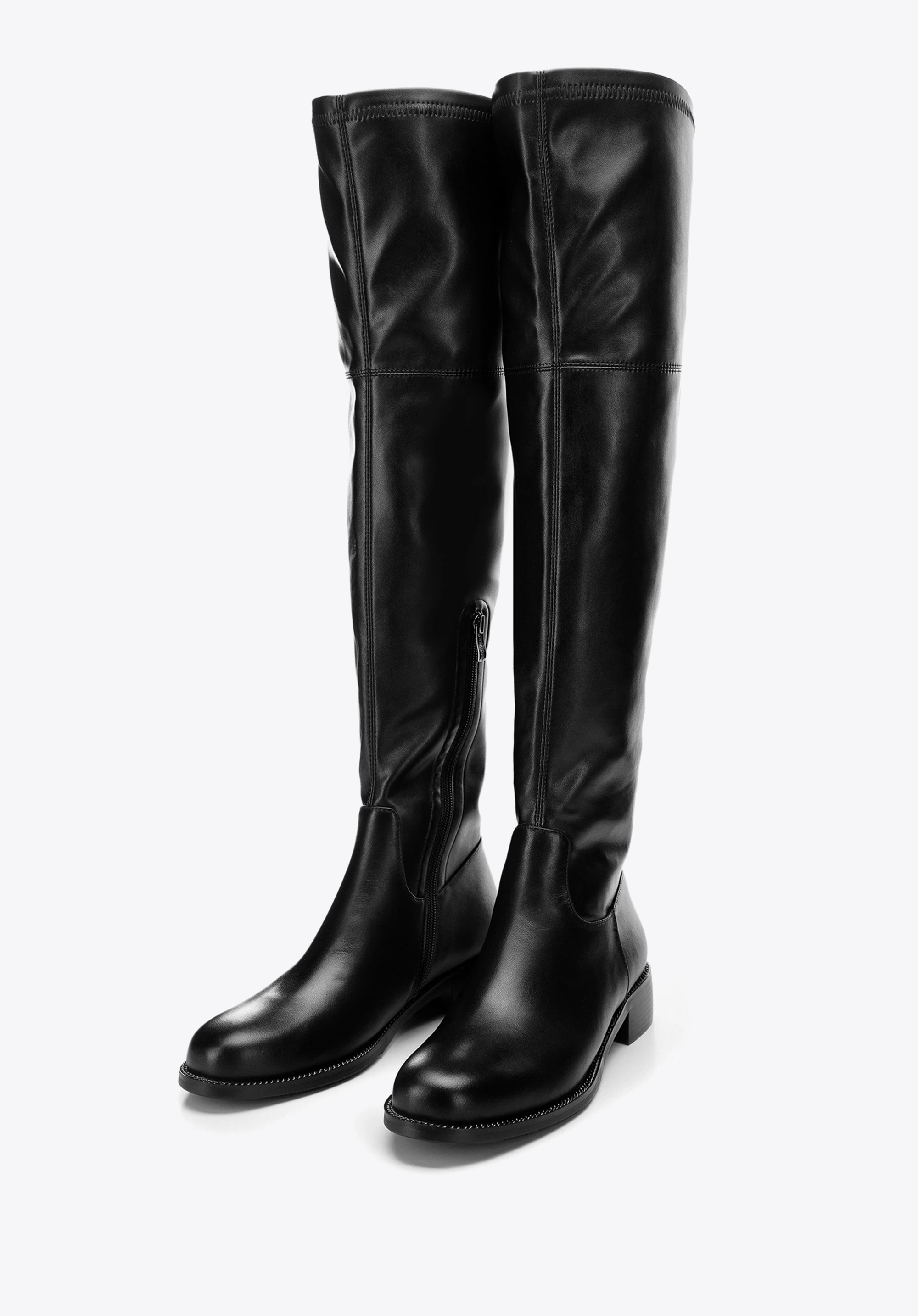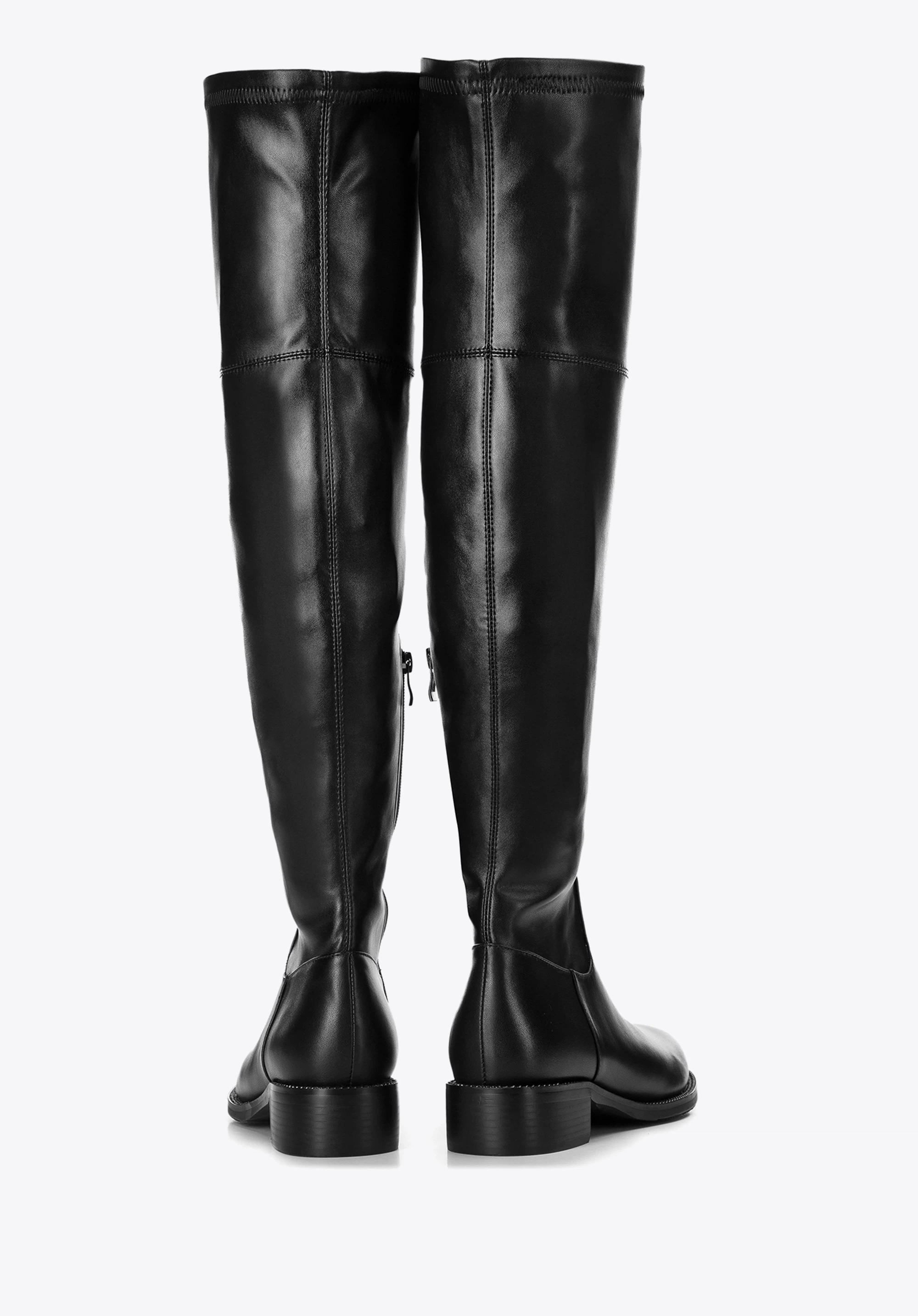 Aceste cizme peste genunchi de culoare neagră intens vor aduce un plus chic colecției dvs. de încălțăminte. Cu finișaj din piele, se sprijină pe un toc bloc așezat pentru confort pe tot parcursul zilei și sunt modelate cu un vârf rotund pentru o senzație clasică. Concepute cu fermoar lateral pentru o potrivire îmbunătățită, aceste cizme Musketeers vor arăta mereu ca aspect.