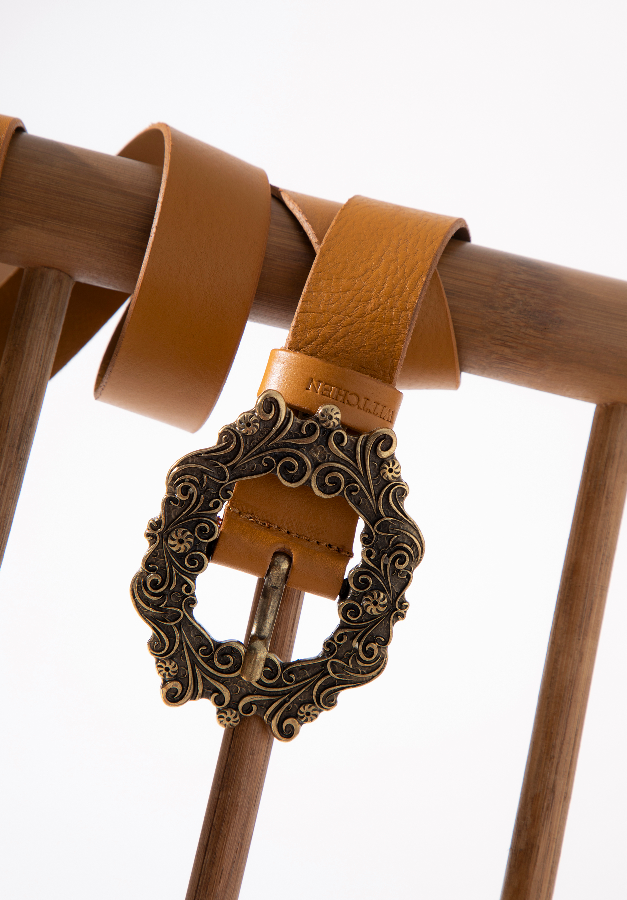 Curelele din piele pentru femei cu detalii interesante sunt un element indispensabil în garderoba fiecărei femei elegante. Acest model este decorat cu o cataramă mare, originală, în culoarea alamei, decorată cu ornamente fanteziste. Este greu de negat că un astfel de accesoriu iese în evidență în mulțime și atrage atenția! Puteți purta cureaua cu pantaloni sau vă puteți accentua talia cu ea. Oricum ar fi, ea va conferi ținutei tale un caracter trendy și original.