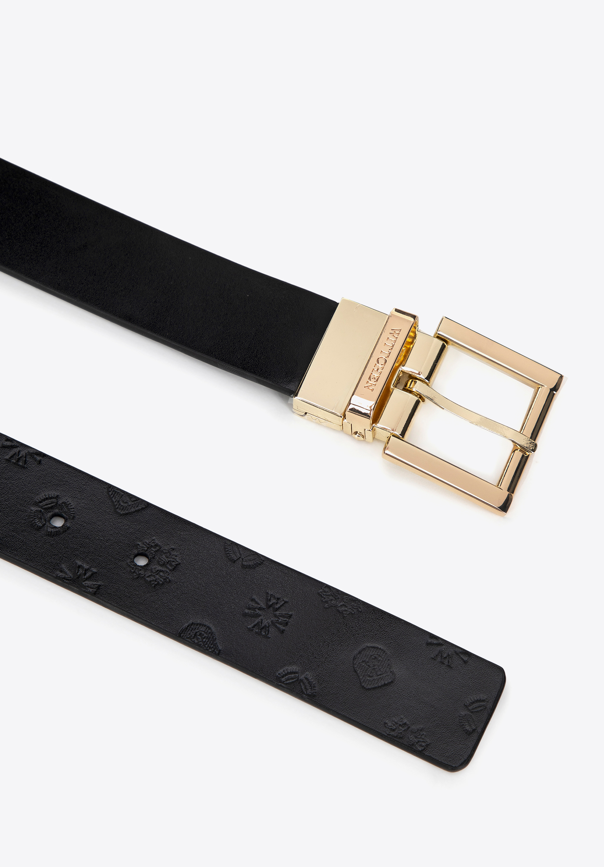 - Partea interioară: Partea corpului prezintă o reliefare elegantă în monograma producătorului. Acest detaliu subliniază natura luxoasă a centurii și adaugă un farmec unic, vizibil doar pentru tine.