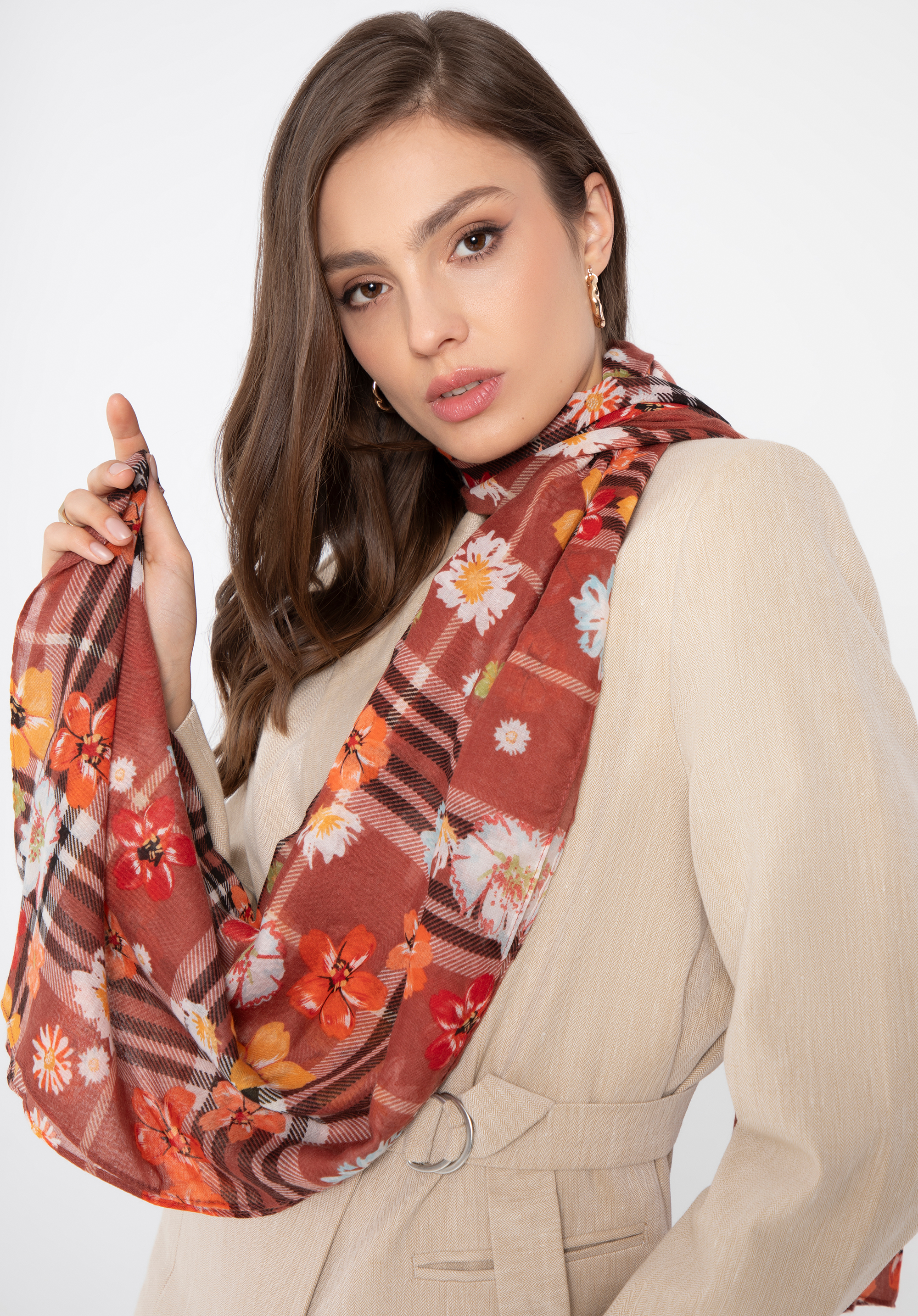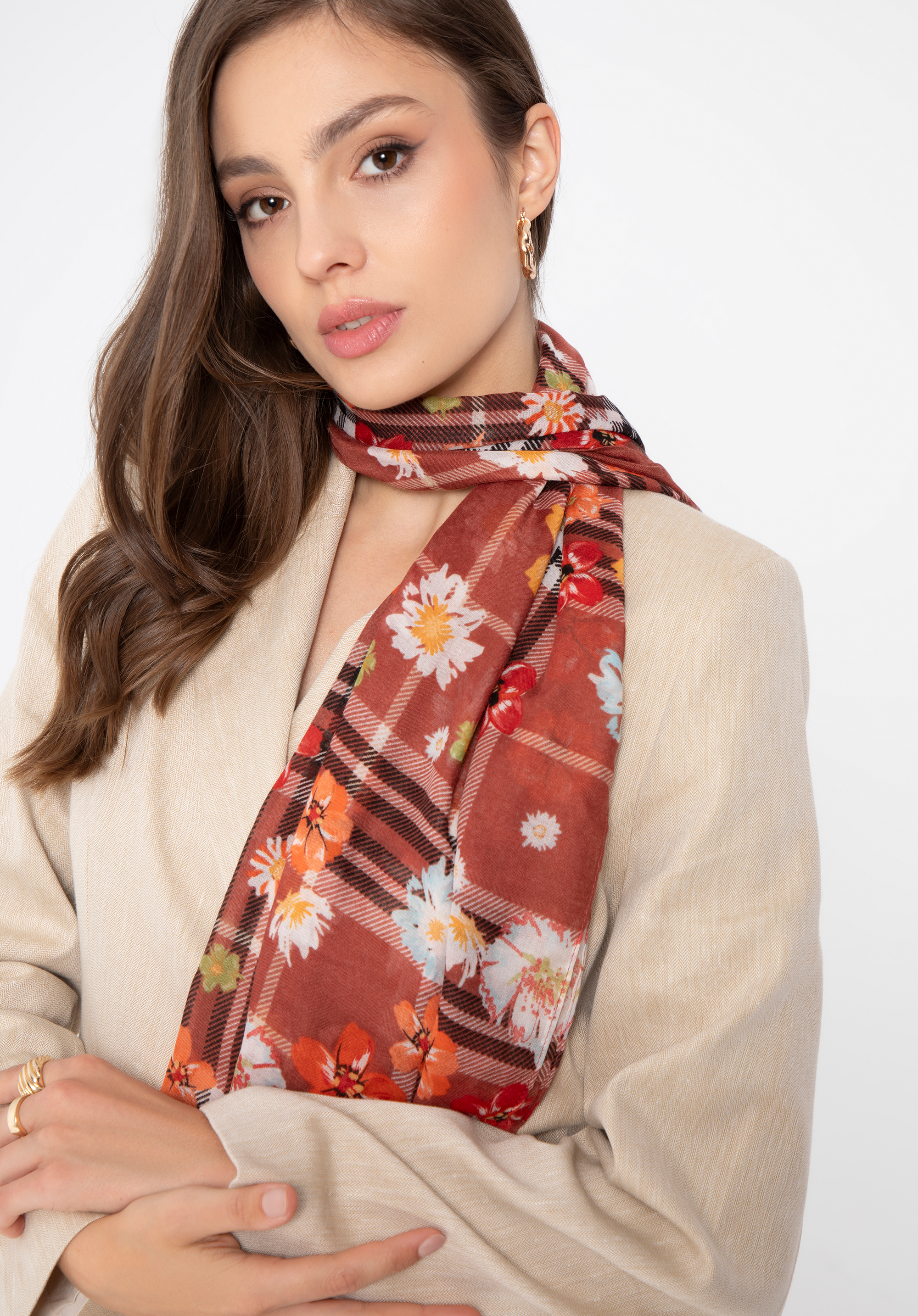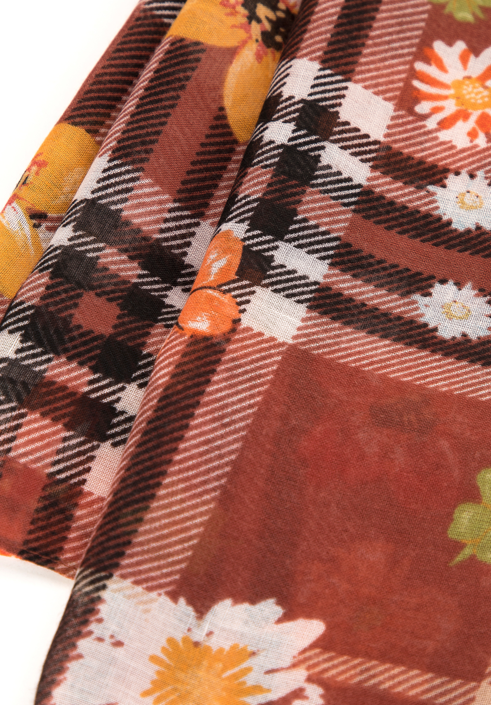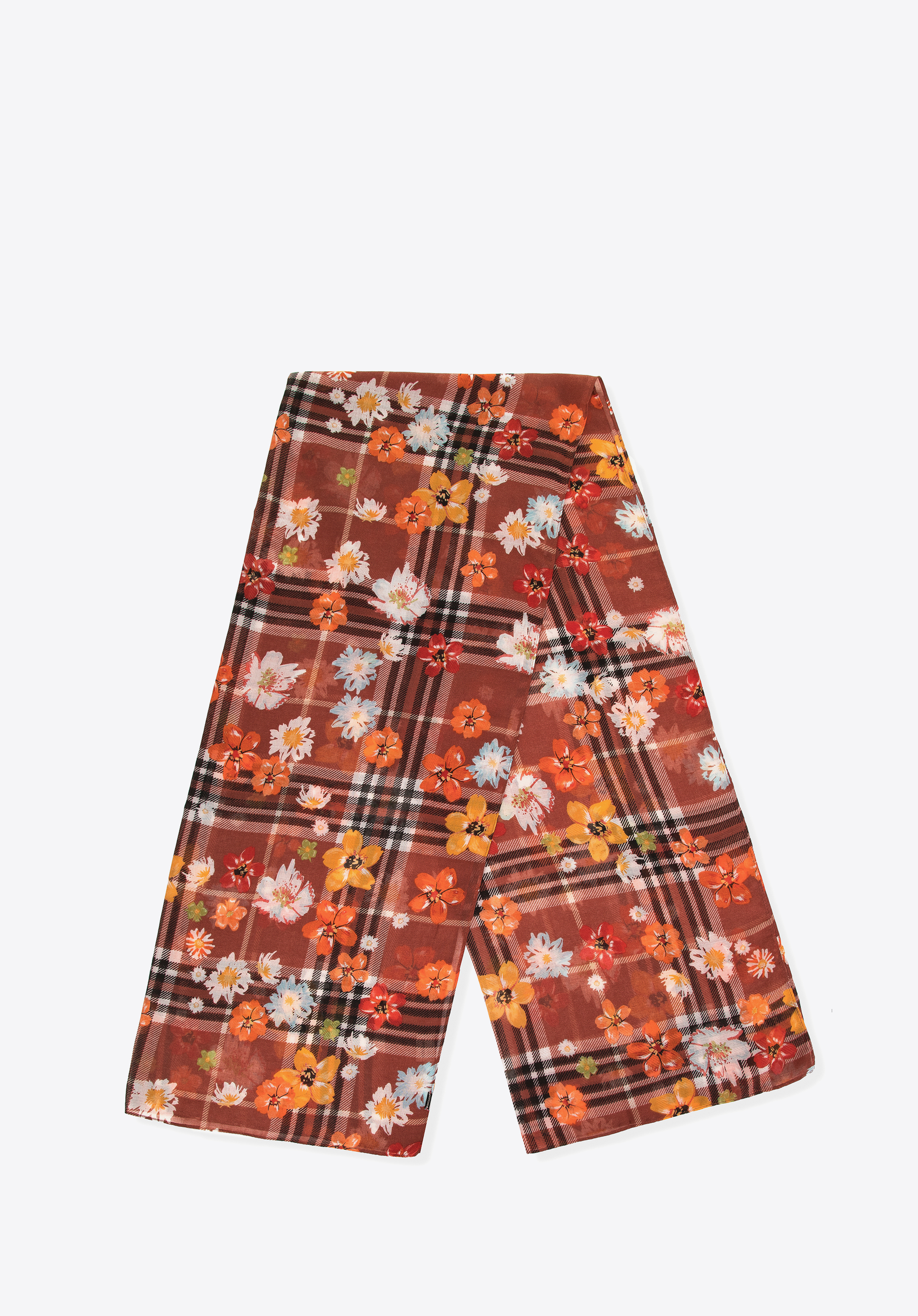 Acest șal ultra-moale și ușor este un accesoriu indispensabil în garderoba fiecărei femei moderne curioase să experimenteze în materie de modă. Șalul combină două modele în tendințe: carouri elegante și motive florale, creând un întreg coerent și izbitor. În plus, interacțiunea armonioasă a diferitelor culori și nuanțe și modele creează un accesoriu original de o frumusețe fascinantă.