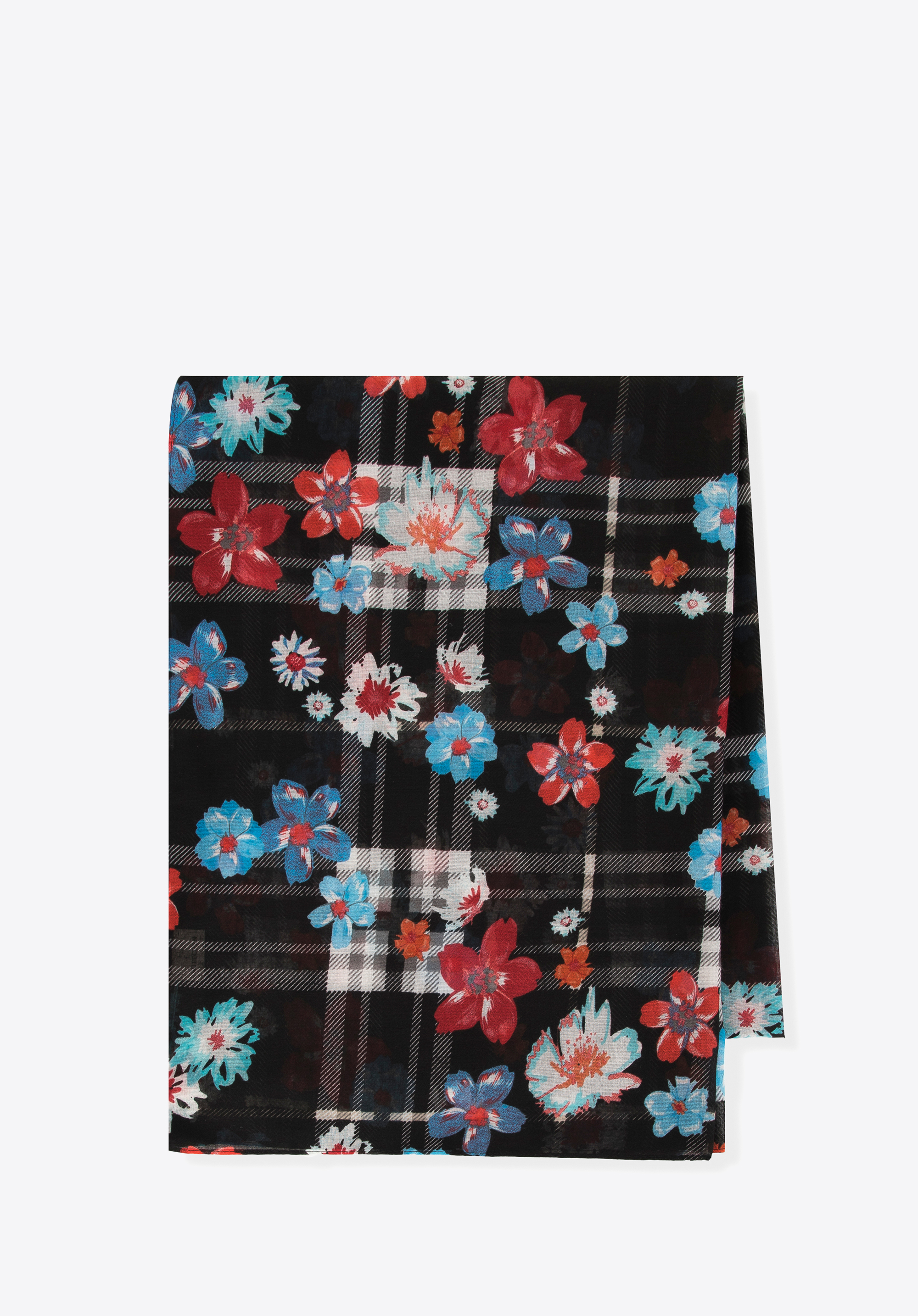 Acest șal ultra-moale și ușor este un accesoriu indispensabil în garderoba fiecărei femei moderne curioase să experimenteze în materie de modă. Șalul combină două modele în tendințe: carouri elegante și motive florale, creând un întreg coerent și izbitor. În plus, interacțiunea armonioasă a diferitelor culori și nuanțe și modele creează un accesoriu original de o frumusețe fascinantă.