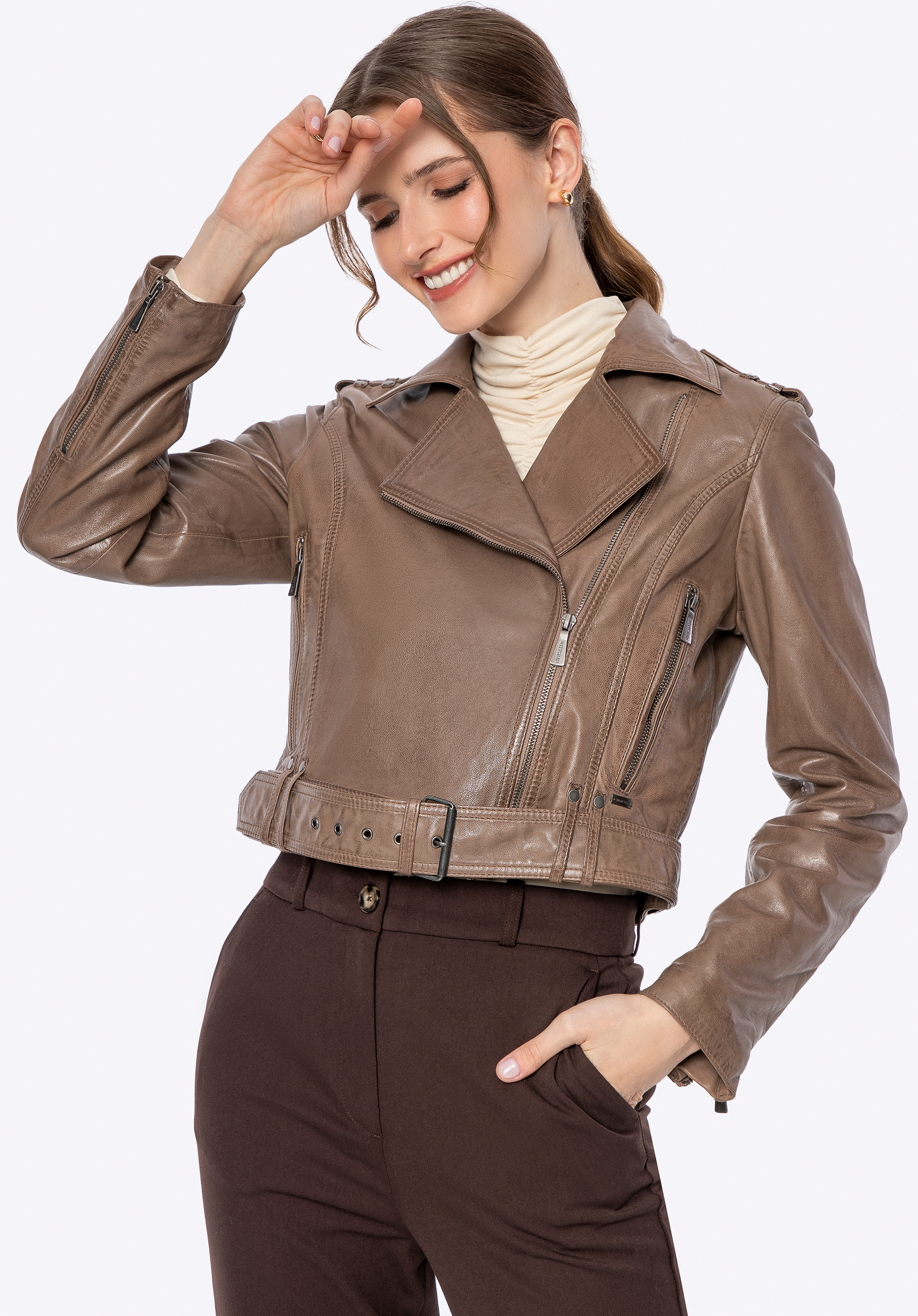 Transformă-ți ținutele de zi cu zi într-un statement de stil cu aceastăgeacă biker, care îmbină eleganța cu un aer rebel. Confecţionată din piele naturală de oaie, este nu doar stilată, ci și extrem de confortabilă. Croiala cambrată, cureaua reglabilă în talie cu cataramă metalică și mânecile ajustabile cu fermoar evidențiază silueta și îți permit să personalizezi look-ul după bunul plac.