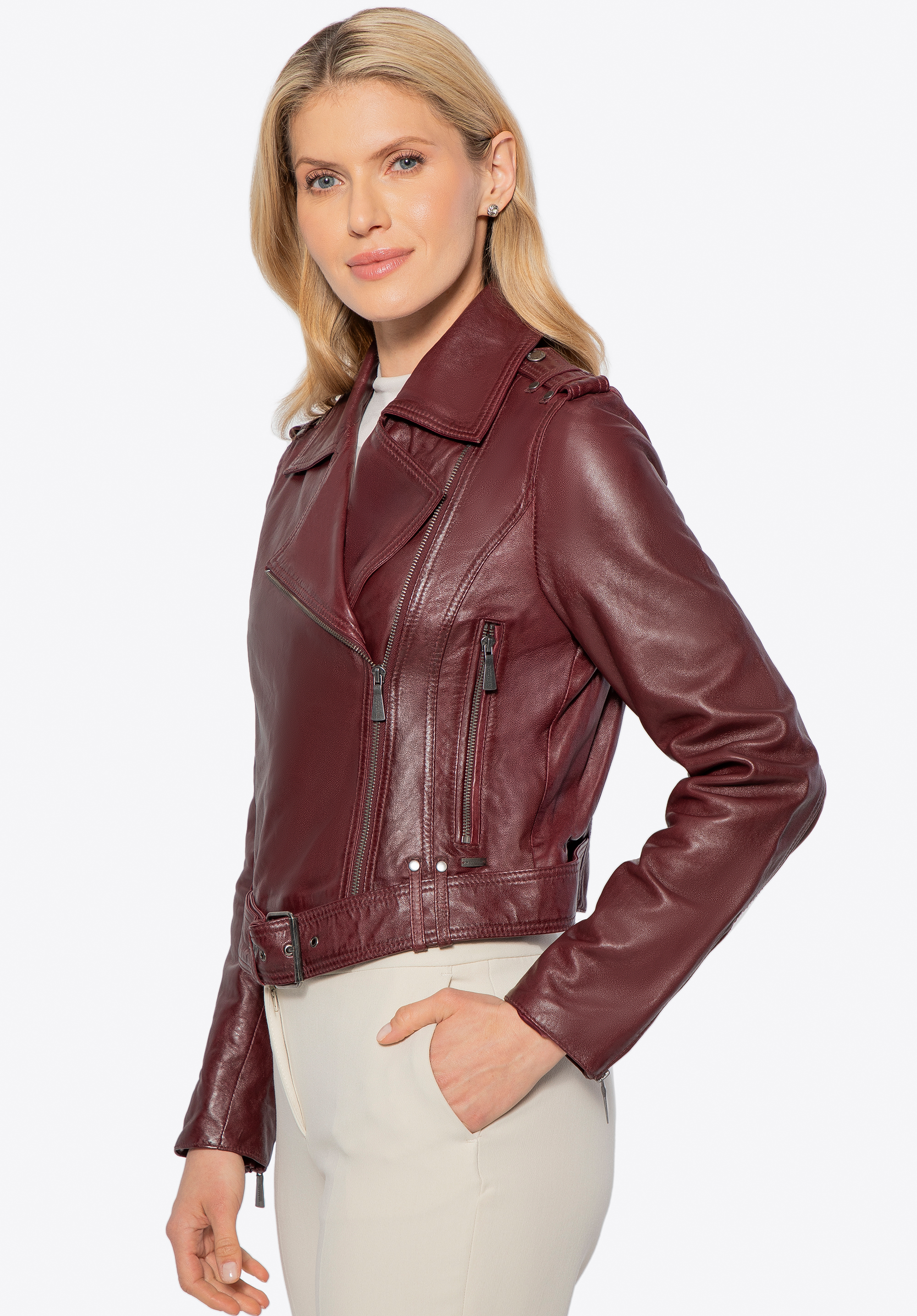 Transformă-ți ținutele de zi cu zi într-un statement de stil cu aceastăgeacă biker, care îmbină eleganța cu un aer rebel. Confecţionată din piele naturală de oaie, este nu doar stilată, ci și extrem de confortabilă. Croiala cambrată, cureaua reglabilă în talie cu cataramă metalică și mânecile ajustabile cu fermoar evidențiază silueta și îți permit să personalizezi look-ul după bunul plac.