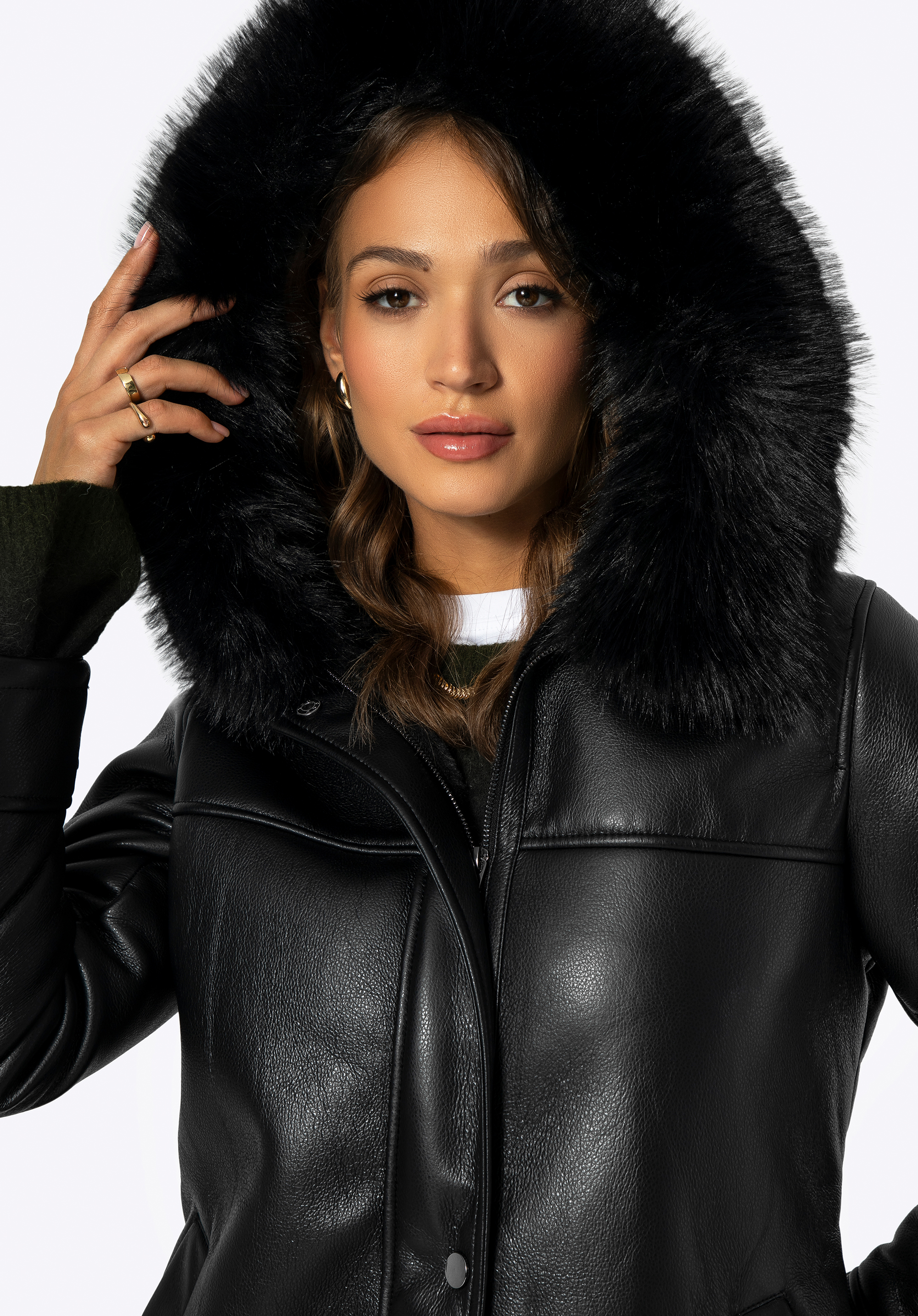 Jachetă elegantă cu glugă din blană artificială