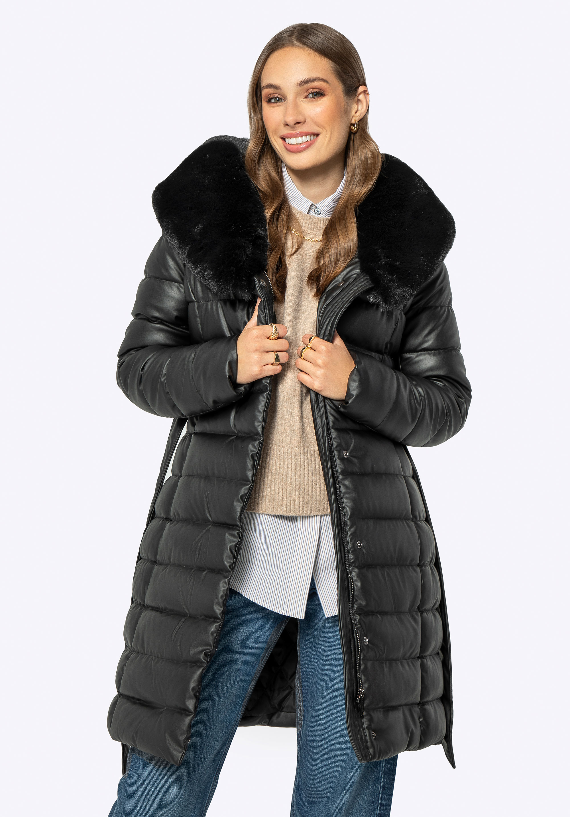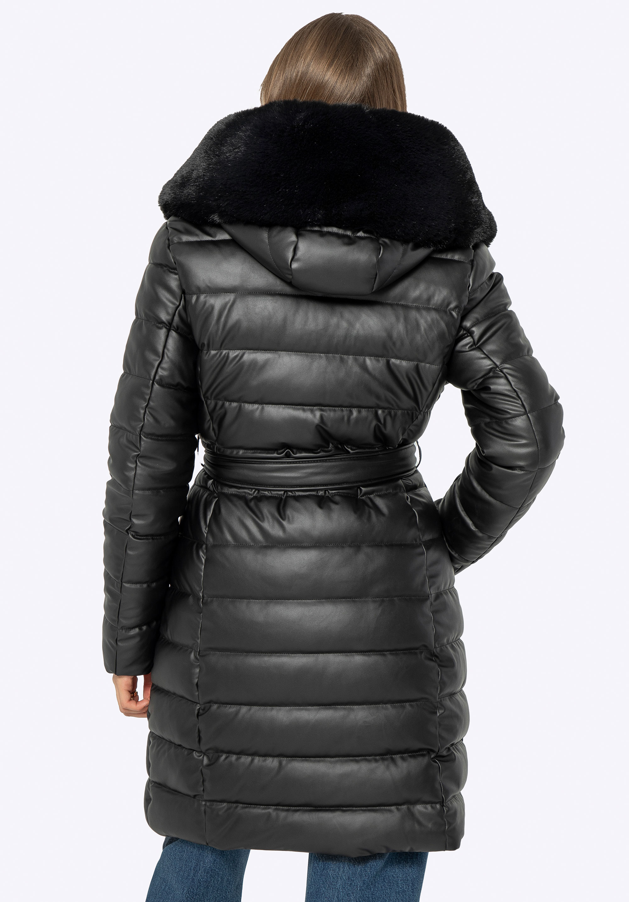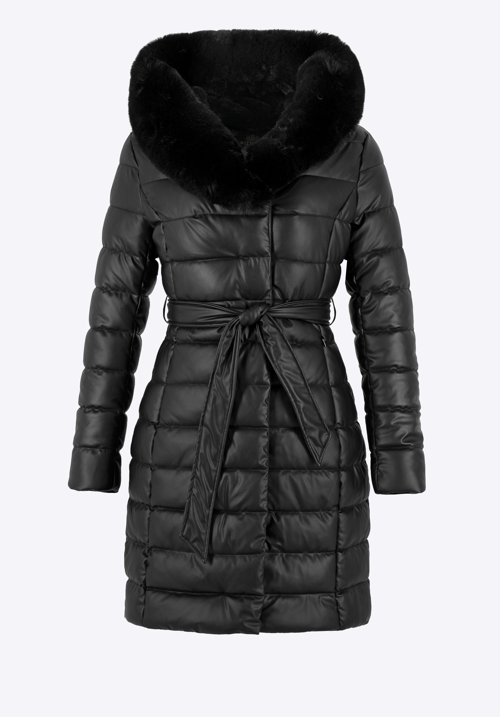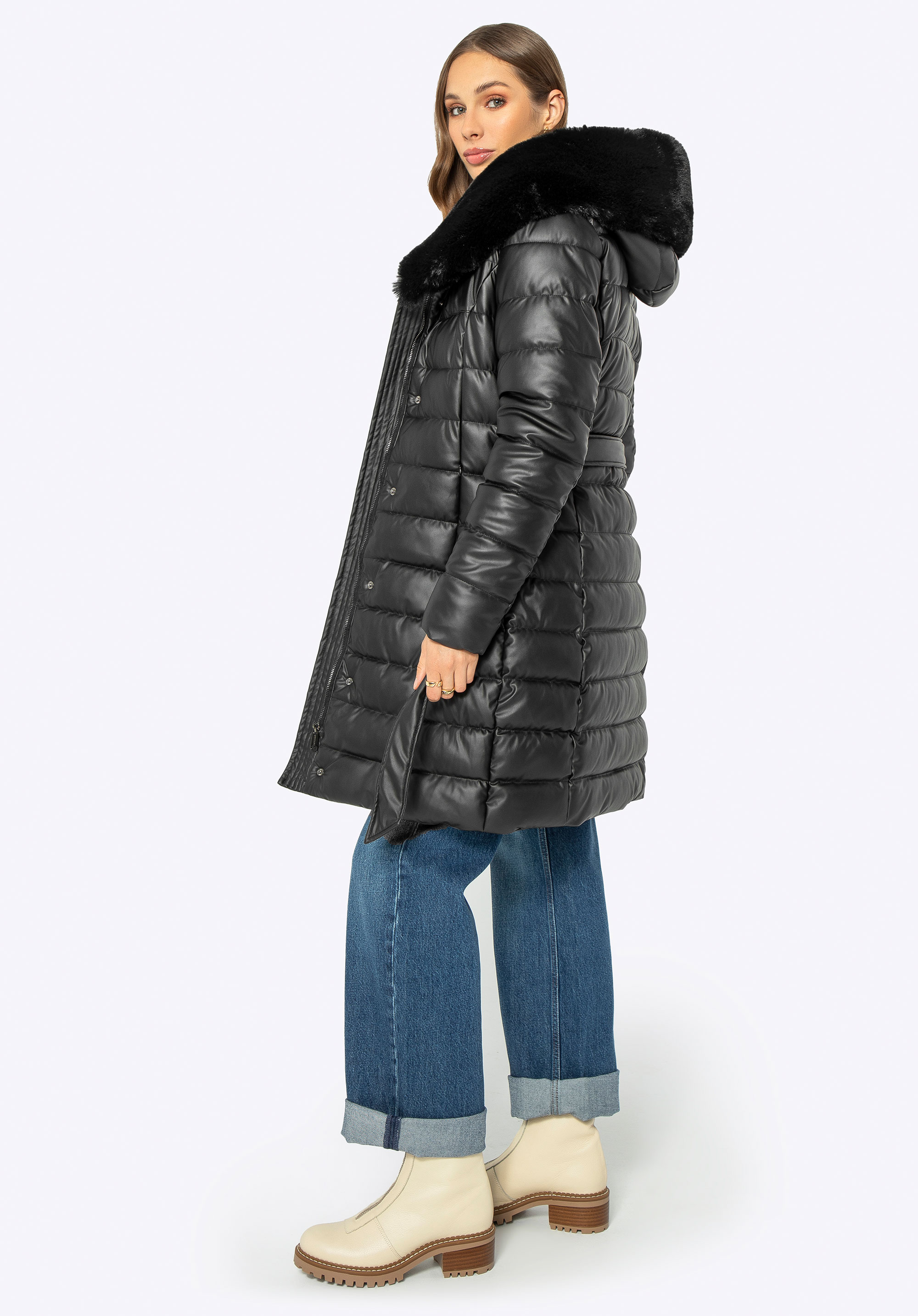 Jachetă lungă matlasată, cu glugă din blană artificială