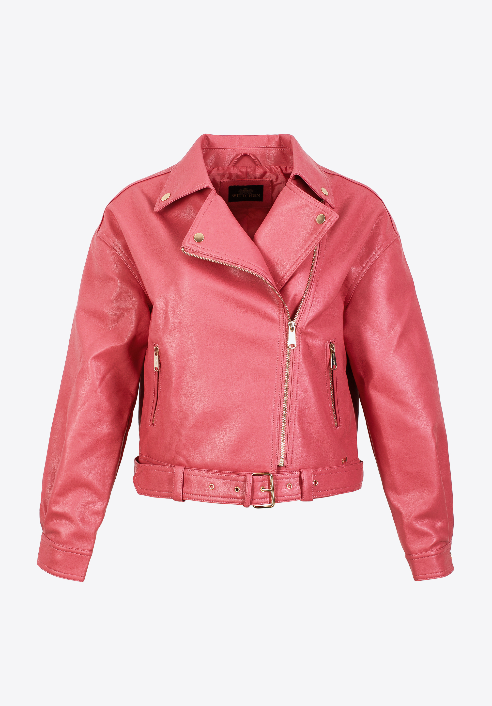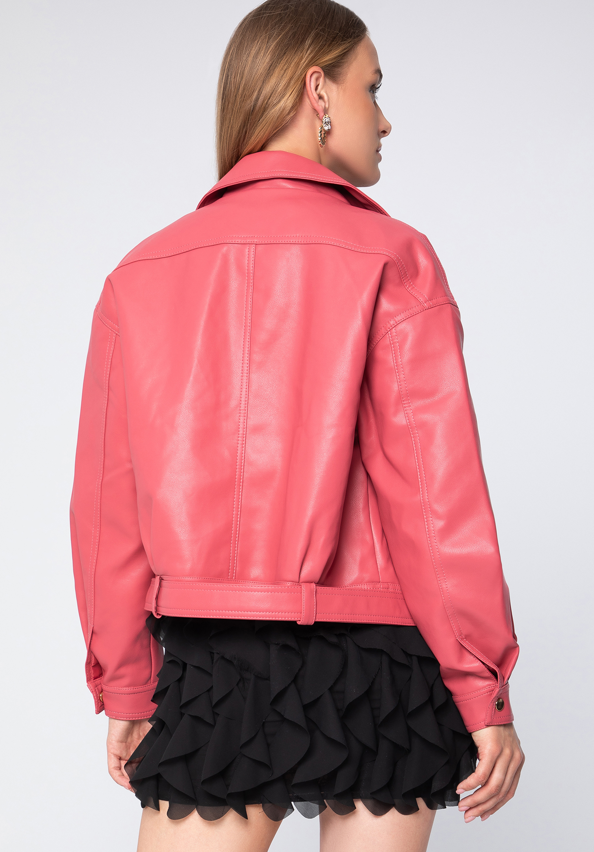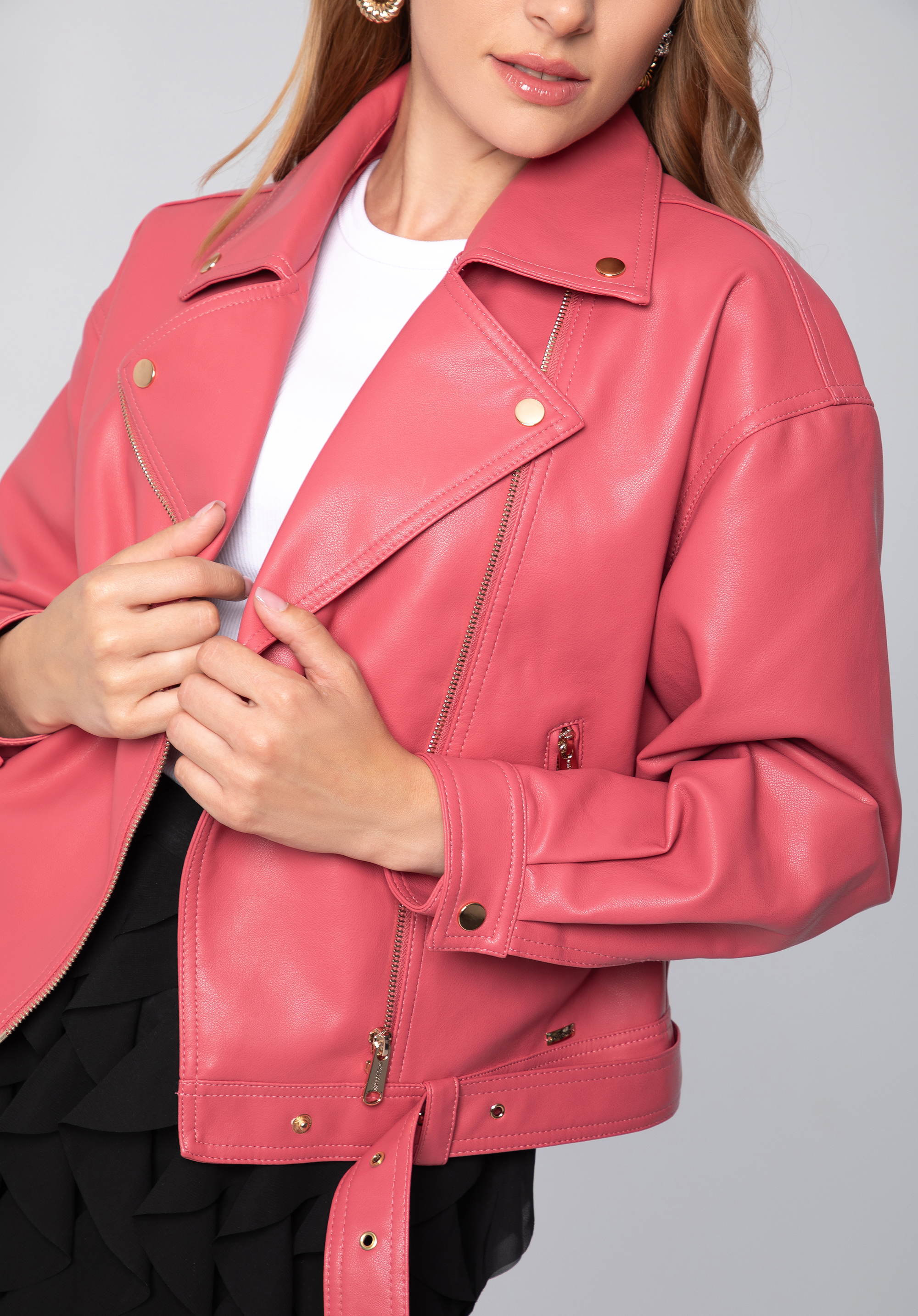Această jachetă unică este un clasic cu o notă modernă. Stilul de jachetă de motociclist cu guler caracteristic și fermoar asimetric este completat de mâneci unice cu balon. Croiala oversize îți va diversifica stilul: atât rochia ta preferată, blugi boyfriend, cât și un tricou. Jacheta de motociclist este confectionată din piele ecologică de înaltă calitate. Poți purta centura cu cataramă cum vrei: prinsă, desfăcută sau complet îndepărtată. Geaca de motociclist oversize de damă din piele ecologică cu curea va fi utilă pentru ieșirile cu prietenii, mersul la cinema sau vizitarea obiectivelor turistice în weekend.