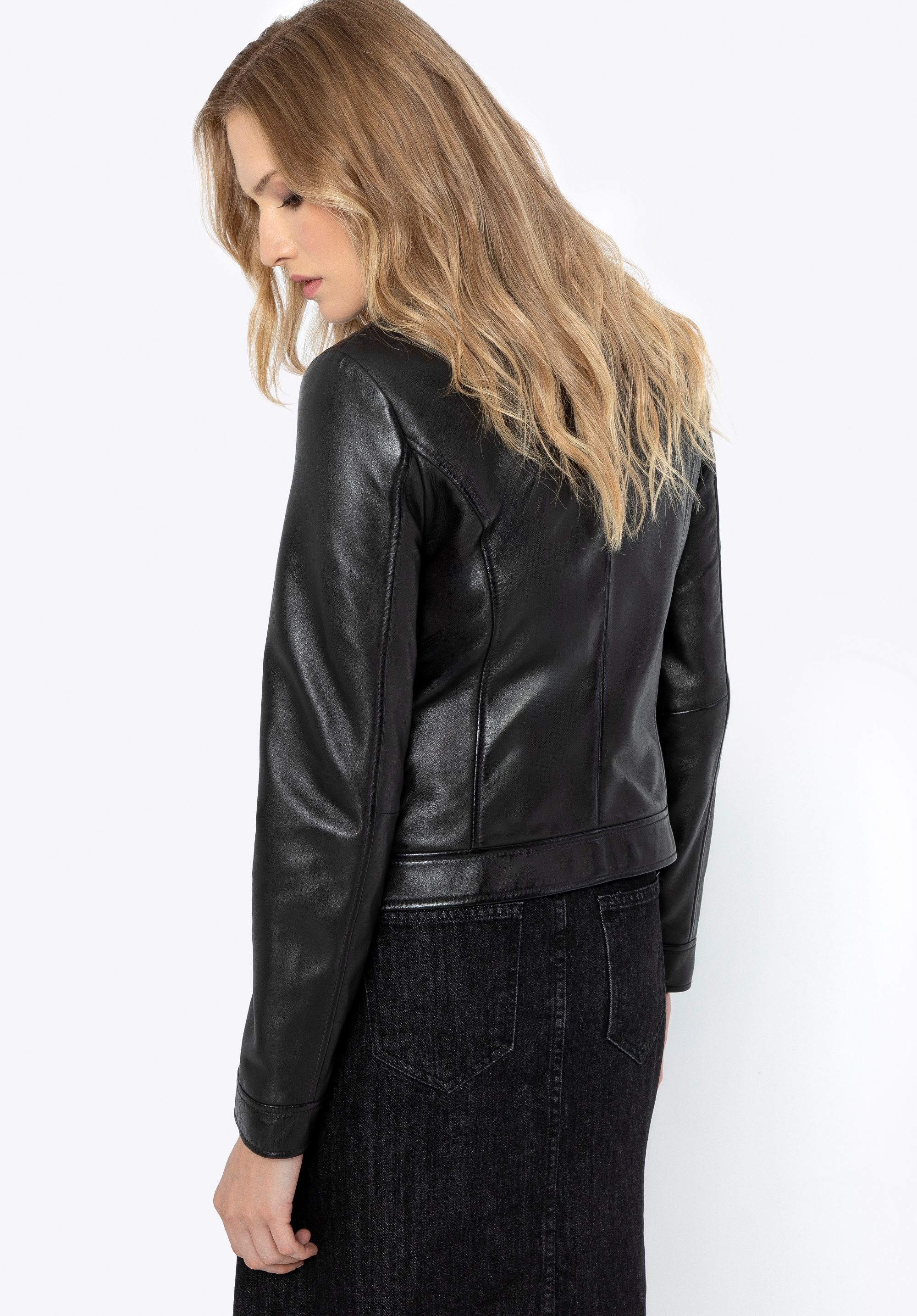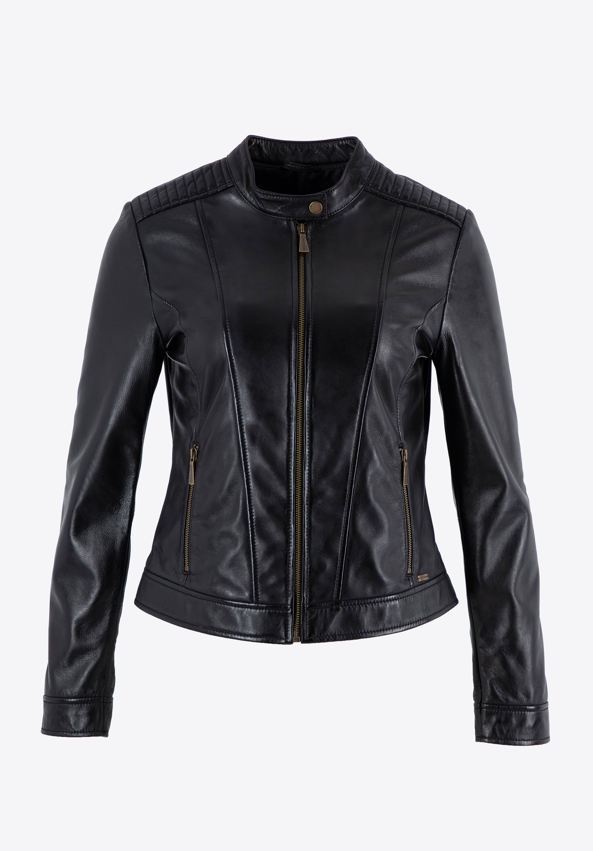 Această jachetă clasică de piele este un must-have pentru fiecare femeie care apreciază confortul și stilul atemporal. Fabricată din piele de oaie de înaltă calitate, moale și delicată, garantează o utilizare de lungă durată. O geacă de piele nu se demodează niciodată. În timp, va dezvolta finisajul vintage dorit de mulți. Acest material luxos are proprietăți respirabile, făcând jacheta confortabil de purtat. Designul ușor decupat adaugă libertate de mișcare, în timp ce potrivirea pe măsură îți accentuează partea feminină. Se închide cu fermoar drept de culoare alamă care completează frumos culoarea jachetei. Acest model are două buzunare cu fermoar în faţă, perfecte pentru depozitarea articolelor esenţiale. Gulerul îți evidențiază frumos gâtul, iar cusăturile de pe umeri vor adăuga o notă distinctă chiar și celei mai simple ținute.