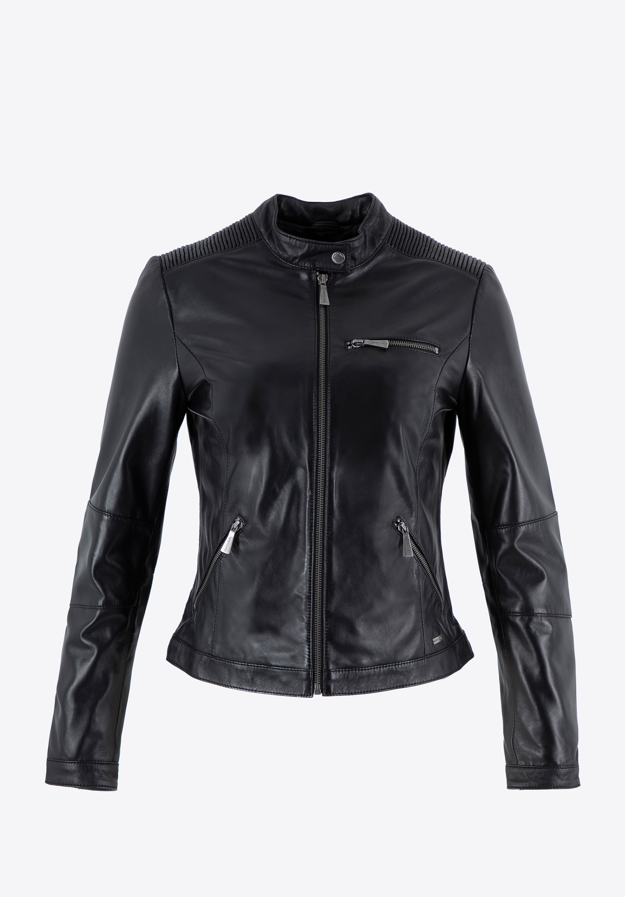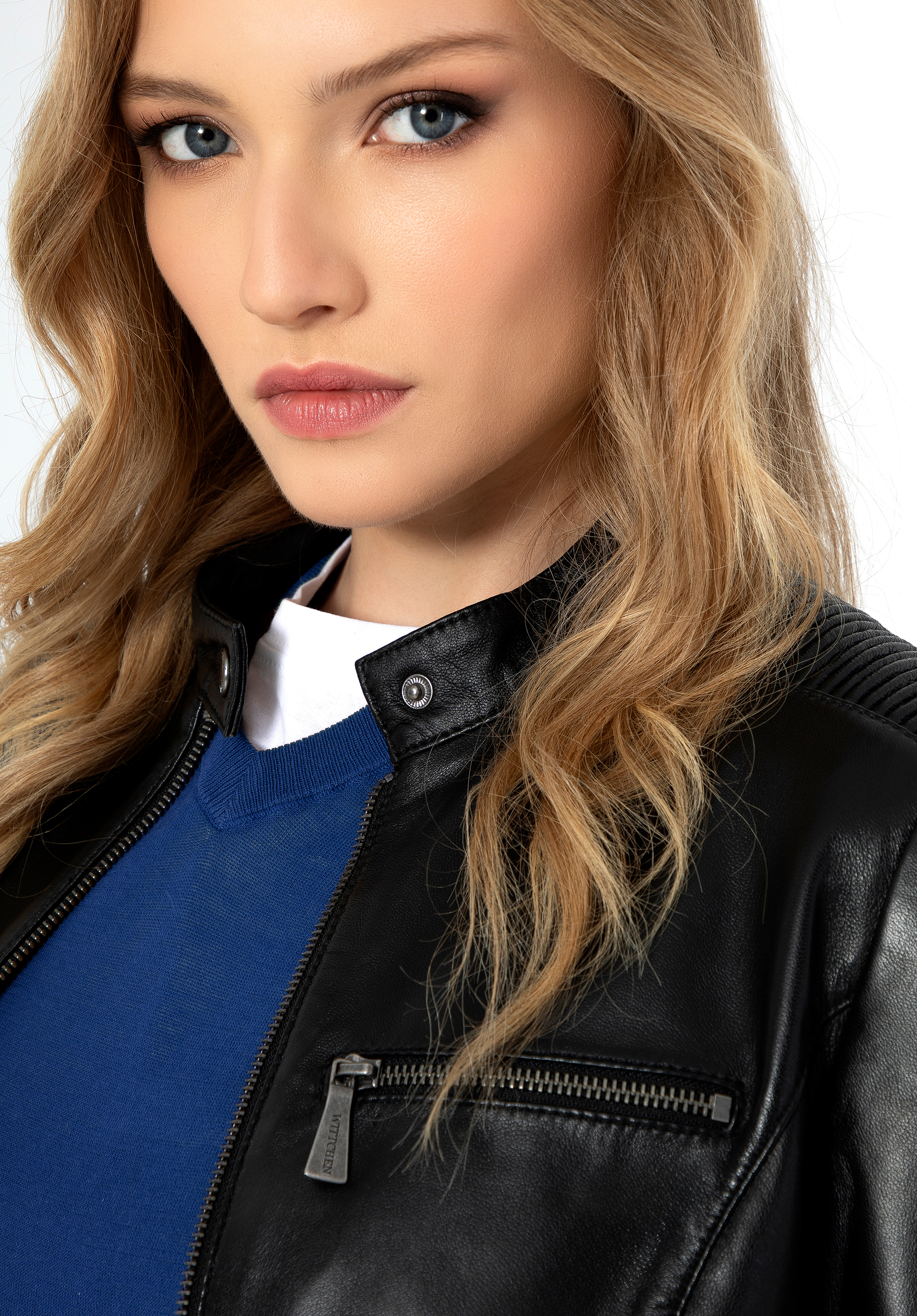 O jachetă de piele este un element indiscutabil de modă. Posibilitățile sale de stil s-au extins de-a lungul anilor, deoarece continuă să domnească pe podiumurile de modă globale. Este purtat de toate femeile care apreciază confortul, aspectul elegant, funcționalitatea și designul clasic. Fabricat din piele de oaie de înaltă calitate, îți va asigura confortul pentru multe sezoane. Potrivirea pe măsură a jachetei îți va accentua cu siguranță silueta. Jacheta are cusături elegante pe umeri, sporind aspectul său contemporan și dinamic. Are o închidere frontală cu fermoar și două buzunare înclinate în față. Un buzunar suplimentar mai adânc la piept combină atât stilul, cât și caracterul practic. Toate buzunarele sunt asigurate cu fermoare argintii elegante. Pentru un plus de versatilitate, mânecile au detalii cu fermoar cu închidere cu butoane, permițându-ți să le sufleci pentru un aspect mai casual.