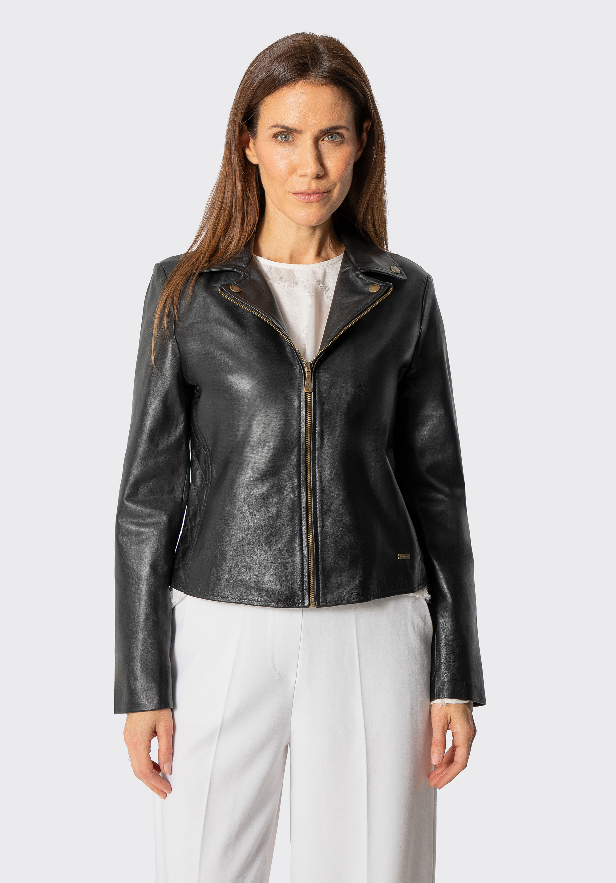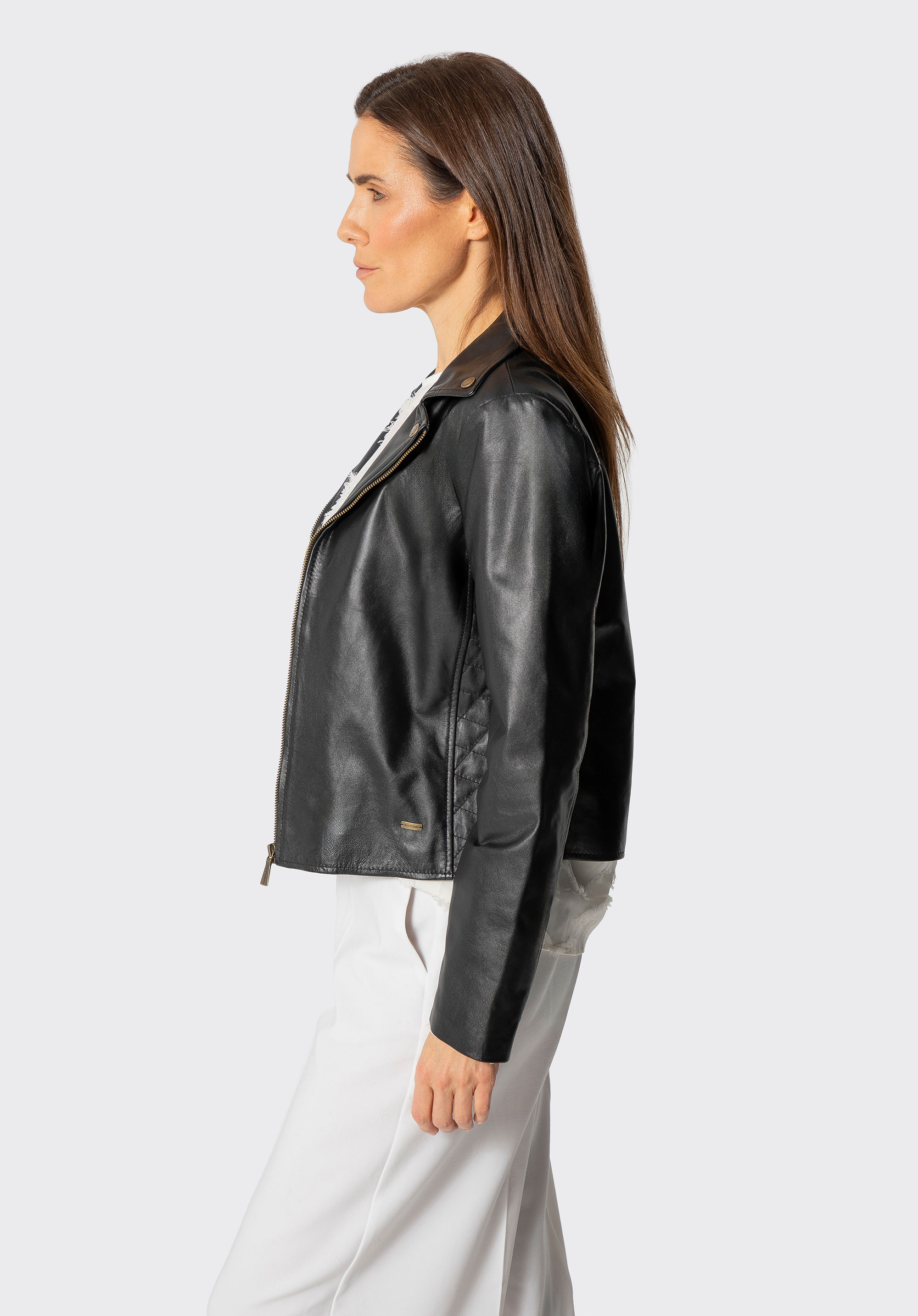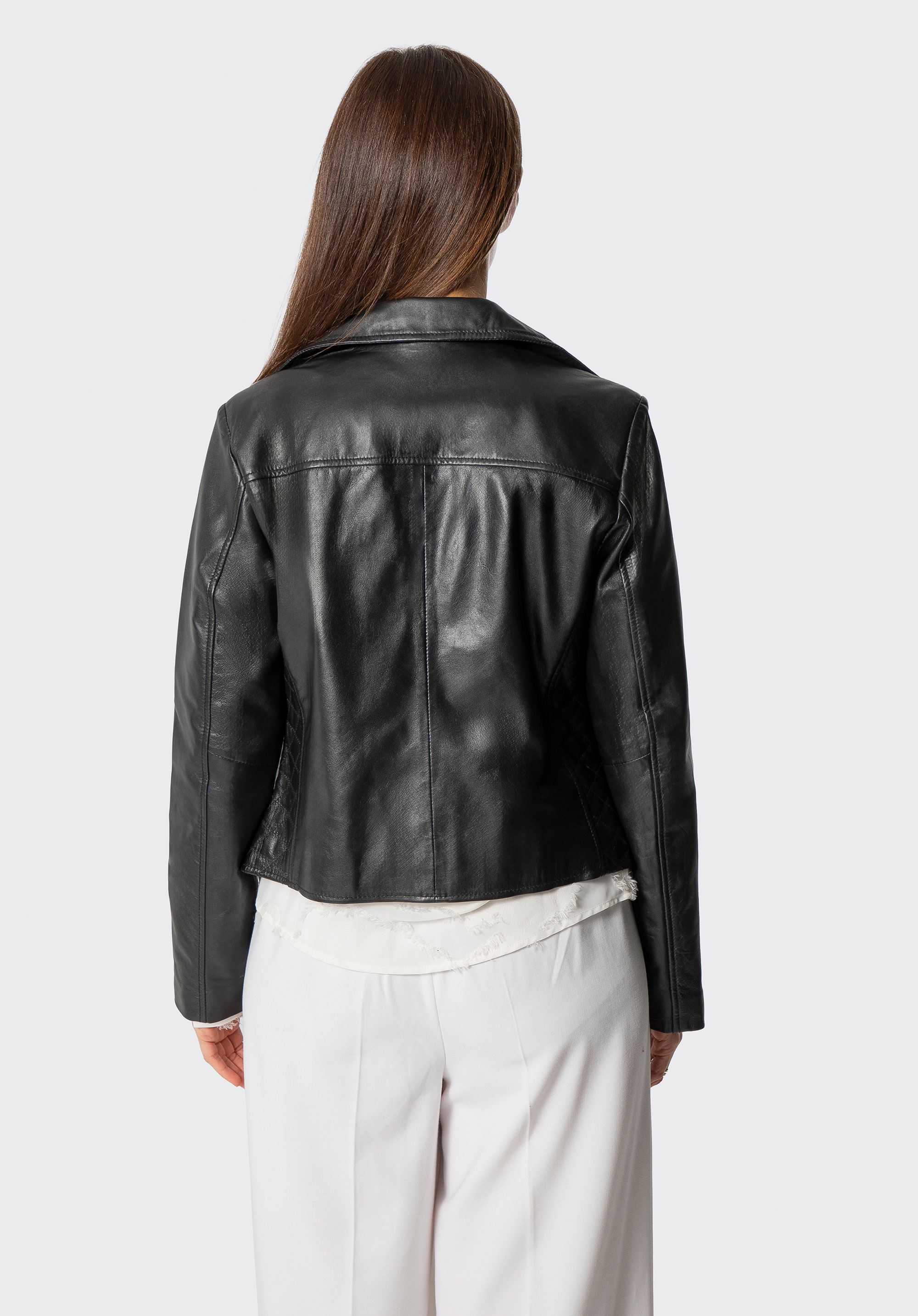 Cauți o geacă care să dea caracter ținutelor tale și să îți sublinieze silueta? Tocmai ai găsit-o! Executată din piele naturală de oaie moale, uimește prin durabilitate și confortul în purtare. Croiul cintrat modelează frumos figura, iar cusăturile geometrice pe laterale îi adaugă o expresie modernă. Închiderea cu fermoar și detaliile metalice subtile – inclusiv logo-ul producătorului pe lateral și nasturii cu logo – îi subliniază stilul excepțional.