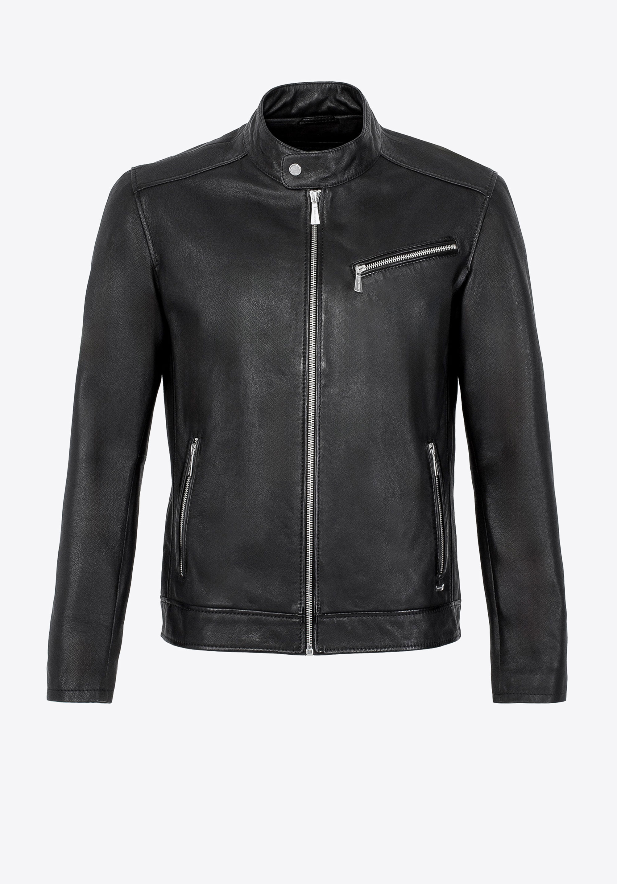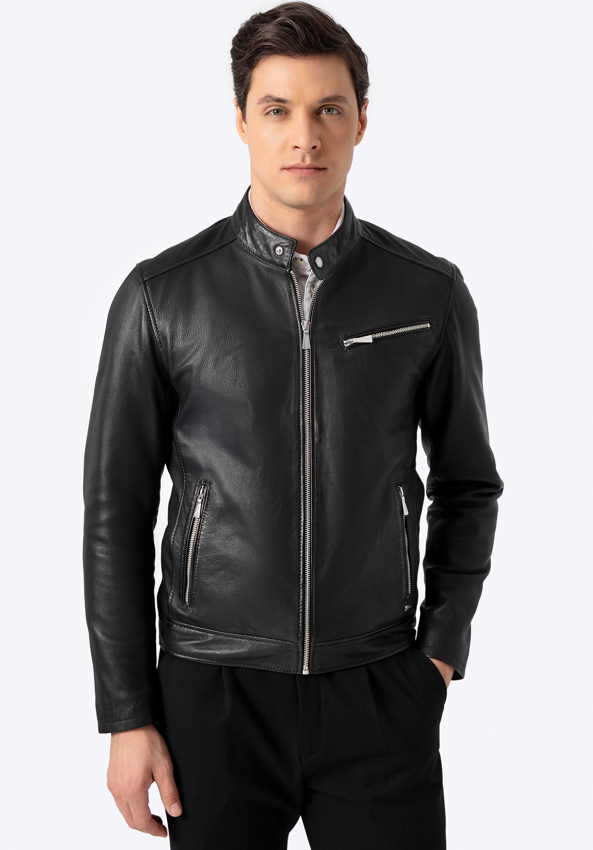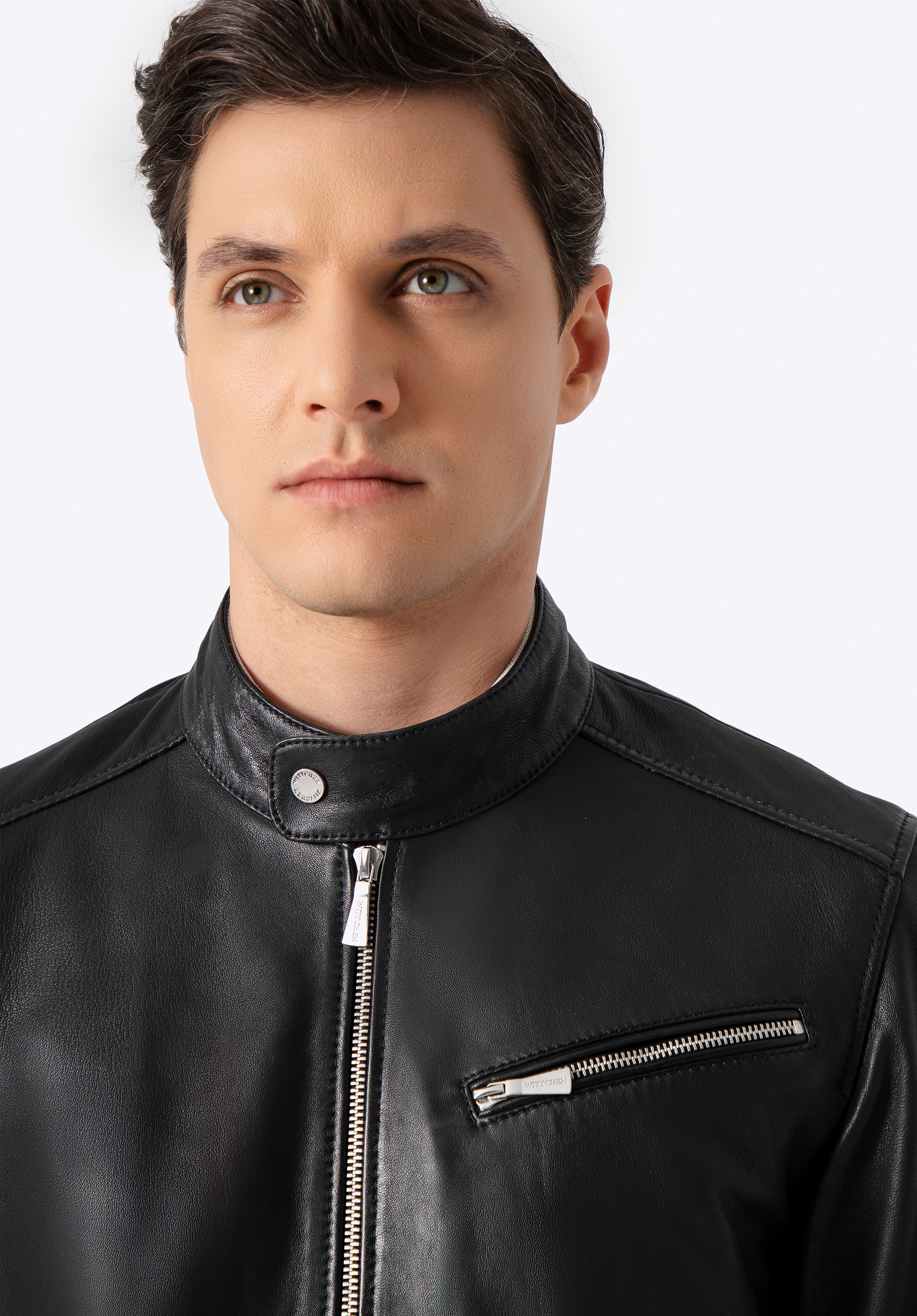 Acest model nu este doar o jachetă – este o declarație de stil. Confecționată din piele naturală de oaie de înaltă calitate, atrage atenția nu doar prin croiala sa impecabilă, ci și prin detaliile lucrate cu grijă până la cel mai mic amănunt. Logo-ul metalic al producătorului, discret plasat pe lateral, adaugă caracter, iar fermoarele inscripționate subliniază luxul acestei creații. Jacheta se închide cu un fermoar metalic solid, iar gulerul tip „stójka” (înalt), cu capse, îi oferă o notă modernă, inspirată de stilul moto.