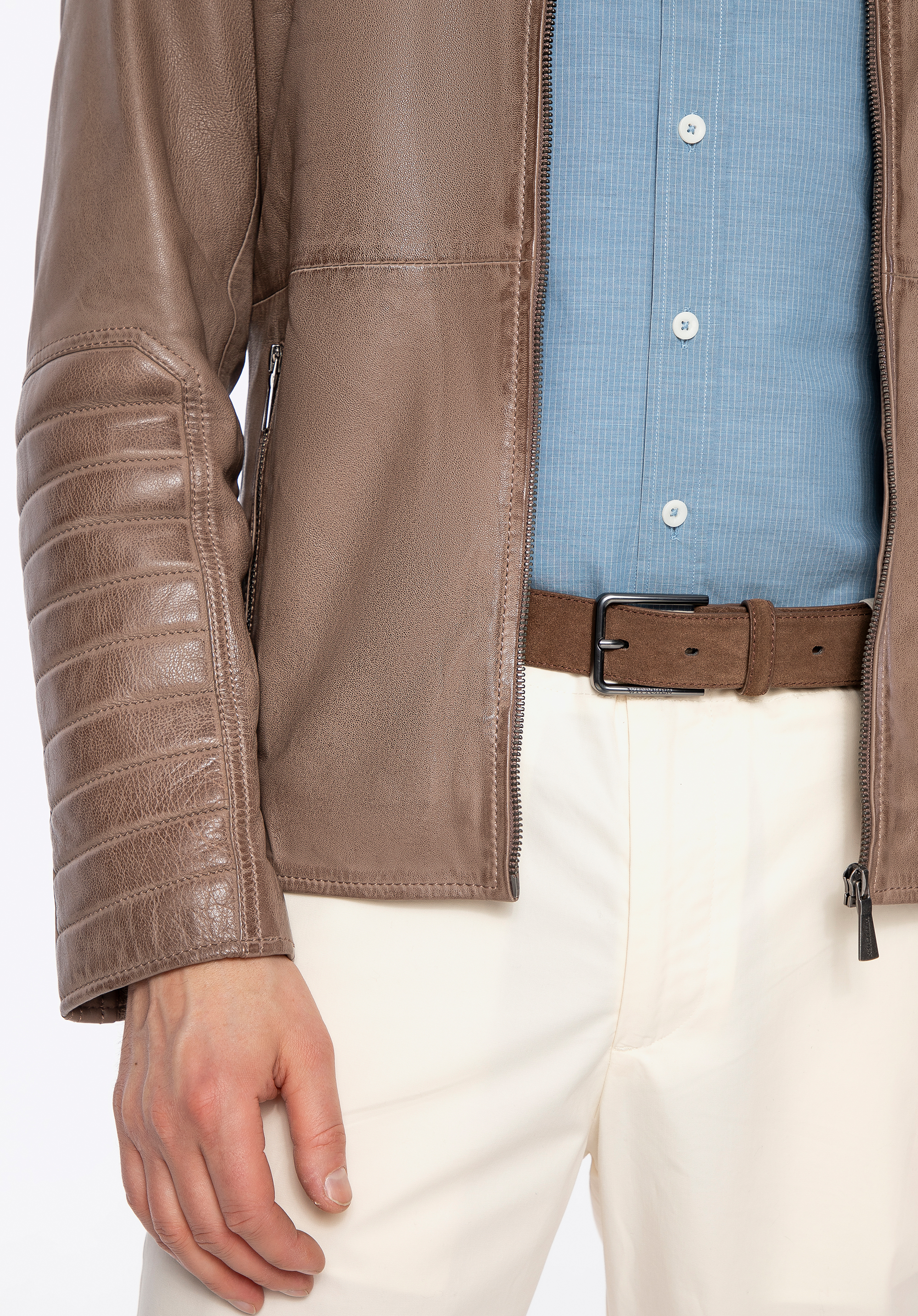 Ieși în evidență prin stil atemporal și eleganță rafinată. Această jachetă pentru bărbați , realizată din cea mai fină piele de oaie , are o textură moale și o potrivire perfectă . Logo-ul metalic pe lateral, fermoarele cu semnătură și matlasarea precisă îi evidențiază caracterul exclusivist. Detaliile rafinate, cum ar fi buzunarele funcționale – două buzunare exterioare cu fermoar și două buzunare interioare (unul cu fermoar, unul deschis) – combină luxul cu caracterul practic. Este alegerea perfectă pentru bărbații care apreciază calitatea de încredere și designul atemporal.