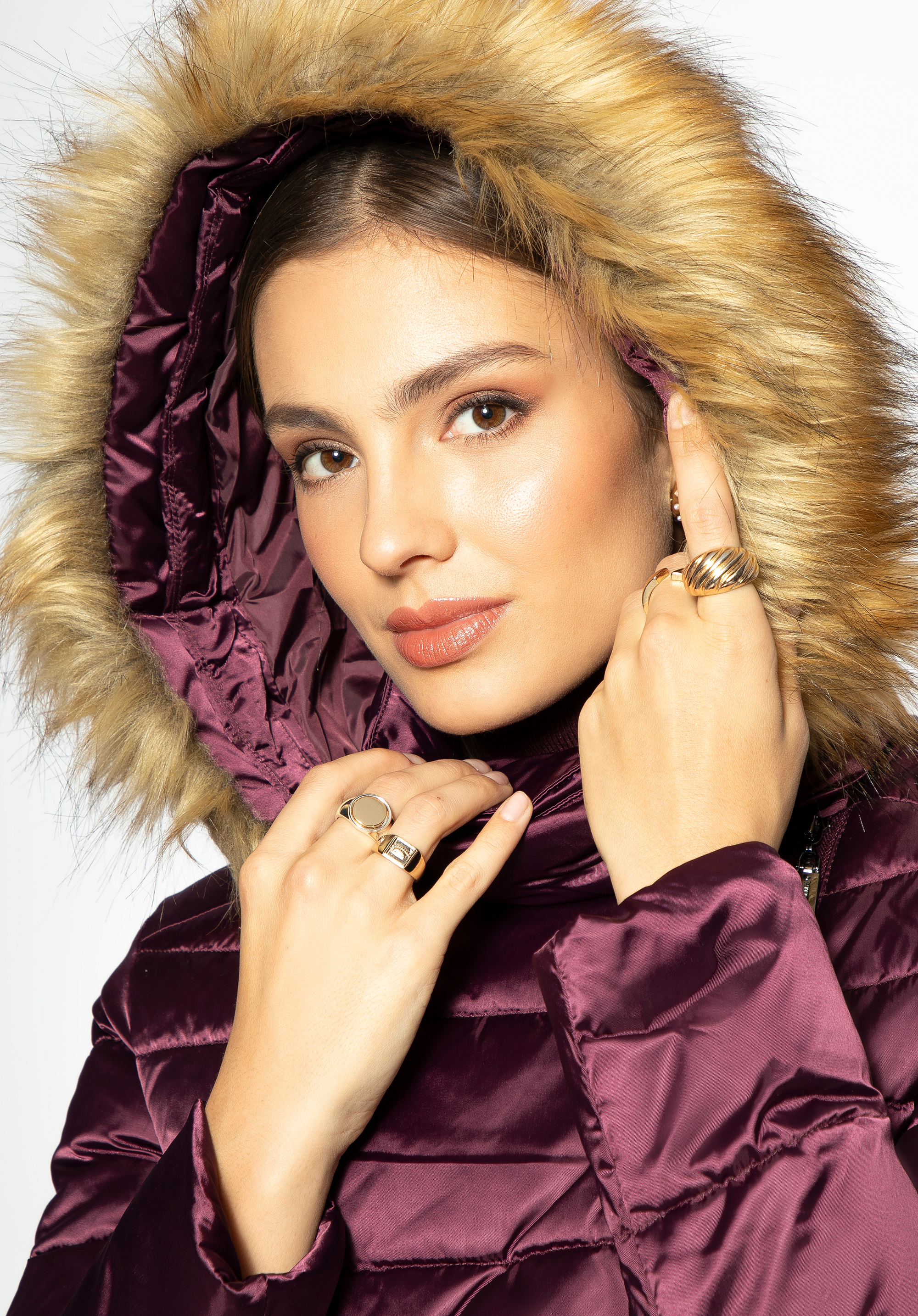 fabricată din nailon plăcut la atingere, ușor lucios.Gluga este împodobită cu blană artificială.