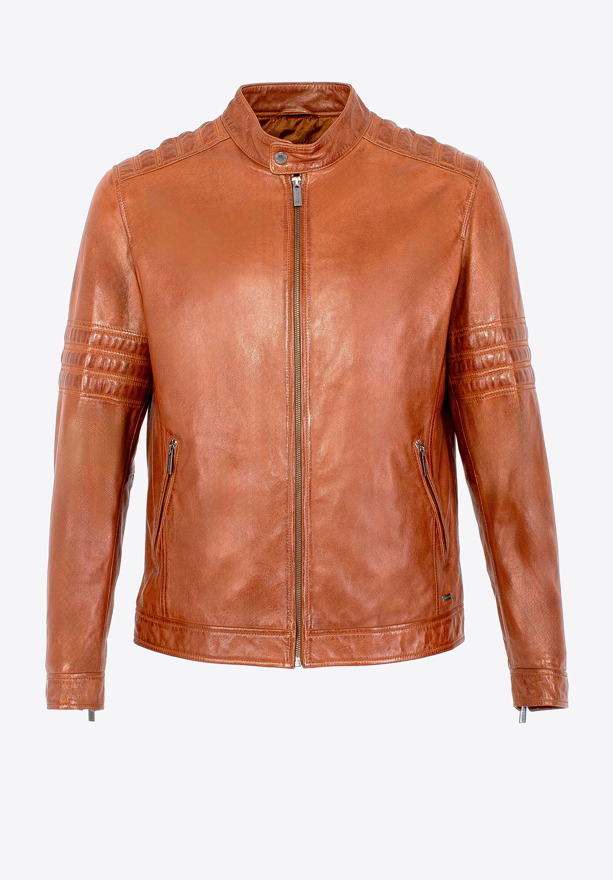Pregătește-te să-ți îmbunătățești garderoba! Această geacă pentru bărbați din piele naturală de oaie combină designul atemporal cu detaliile moderne care vă îmbunătățesc stilul. Accentele metalice, inclusiv logo-ul mărcii, îi conferă un caracter distinctiv. Cusăturile decorative matlasate de pe umeri și mâneci adaugă o notă robustă, masculină, în timp ce manșetele reglabile cu fermoar asigură o potrivire perfectă.