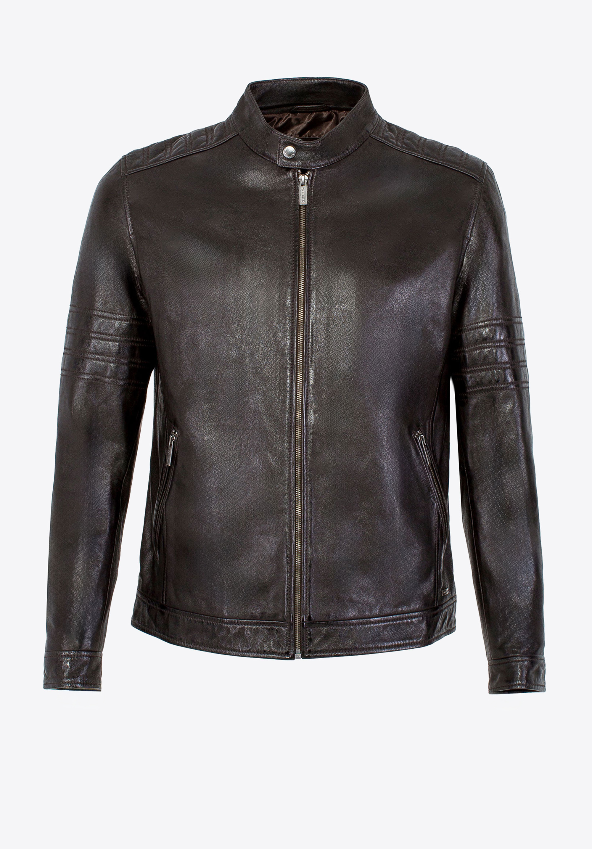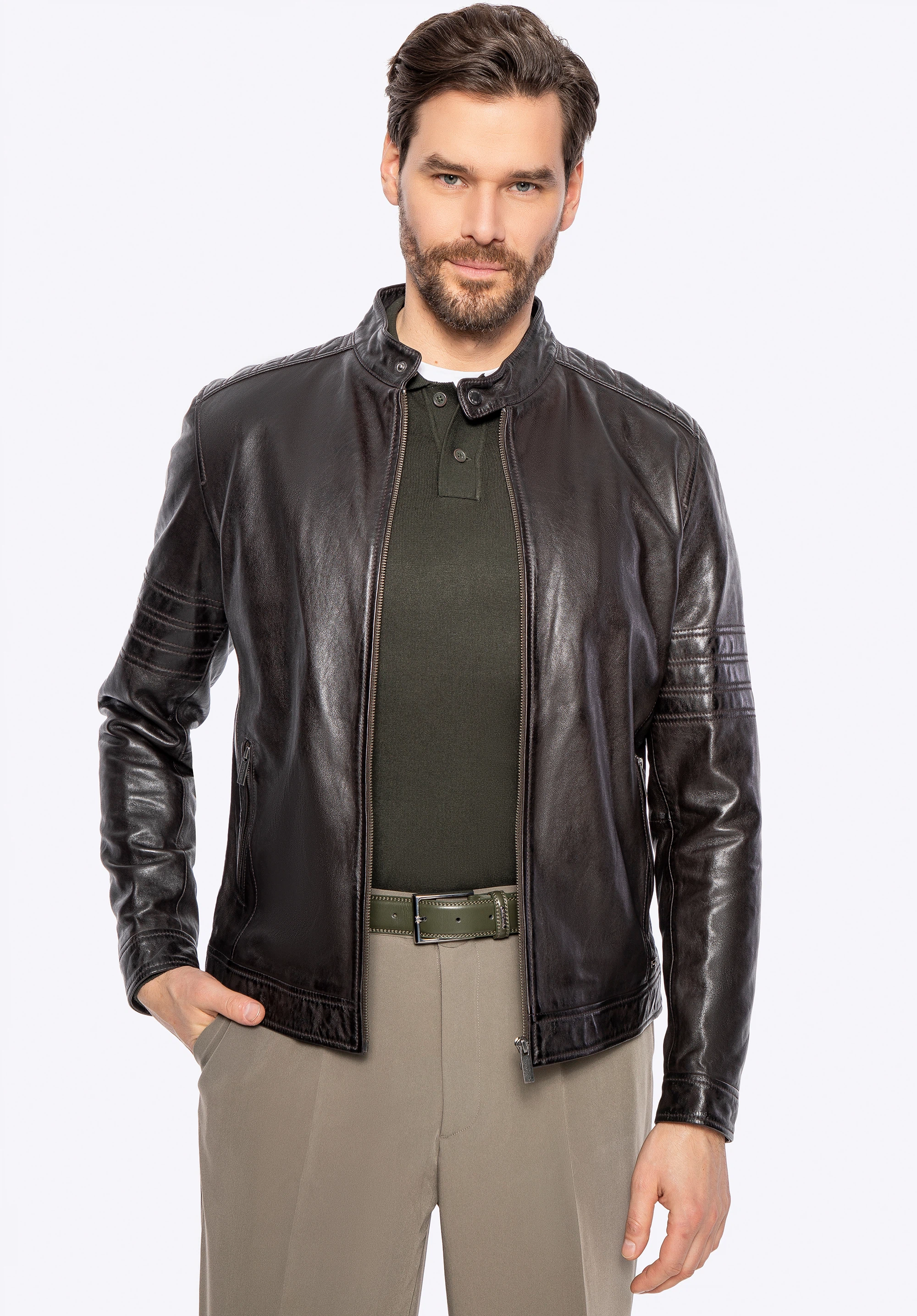 Pregătește-te să-ți îmbunătățești garderoba! Această geacă pentru bărbați din piele naturală de oaie combină designul atemporal cu detaliile moderne care vă îmbunătățesc stilul. Accentele metalice, inclusiv logo-ul mărcii, îi conferă un caracter distinctiv. Cusăturile decorative matlasate de pe umeri și mâneci adaugă o notă robustă, masculină, în timp ce manșetele reglabile cu fermoar asigură o potrivire perfectă.