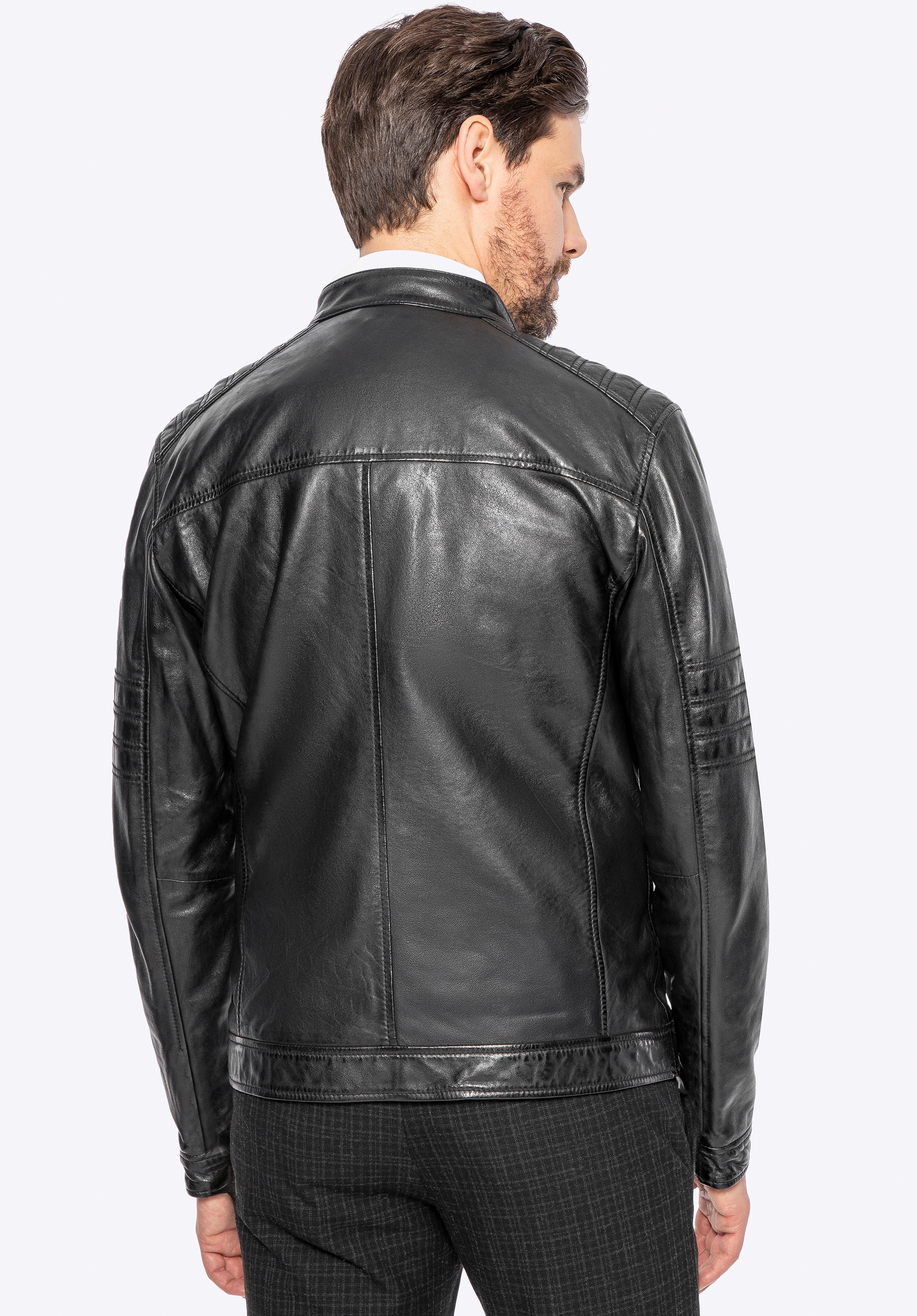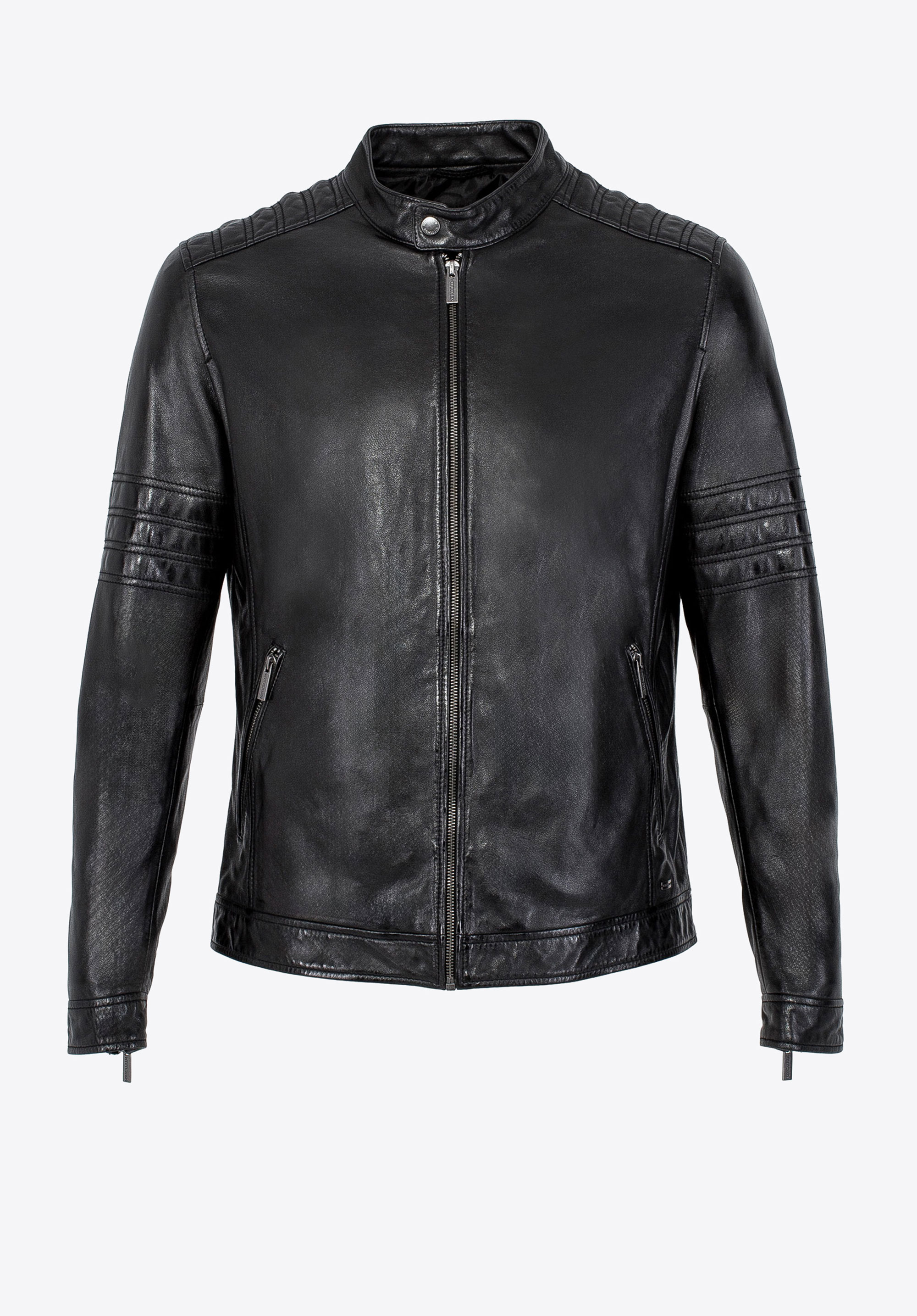 Pregătește-te să-ți îmbunătățești garderoba! Această geacă pentru bărbați din piele naturală de oaie combină designul atemporal cu detaliile moderne care vă îmbunătățesc stilul. Accentele metalice, inclusiv logo-ul mărcii, îi conferă un caracter distinctiv. Cusăturile decorative matlasate de pe umeri și mâneci adaugă o notă robustă, masculină, în timp ce manșetele reglabile cu fermoar asigură o potrivire perfectă.