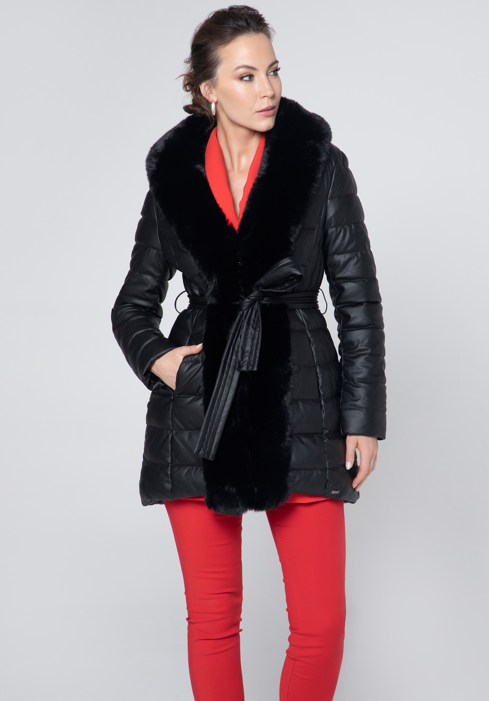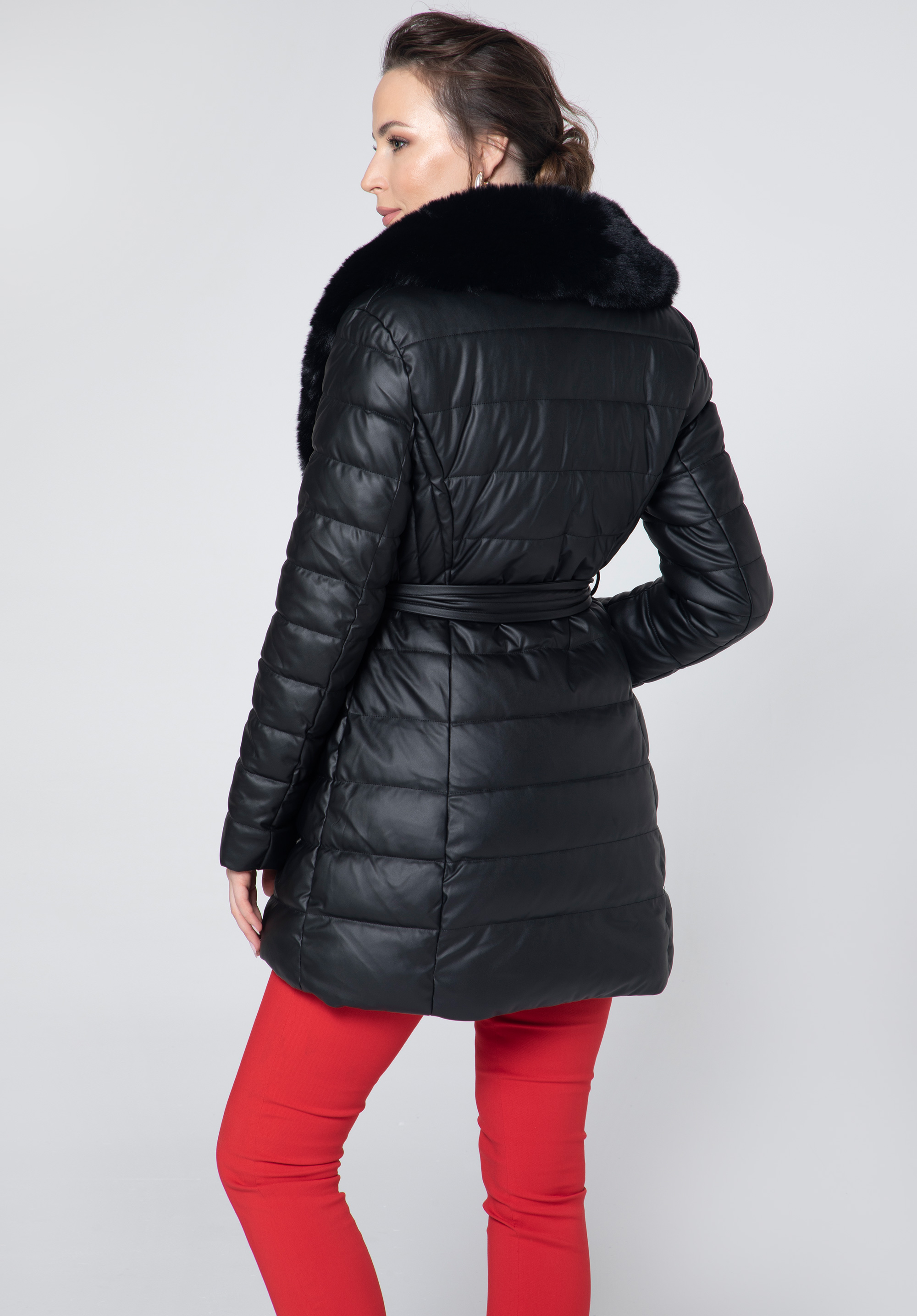 Această geacă de damădin piele ecologică matlasată cu blană dovedește că hainele de iarnă pot fi chic și călduroase.