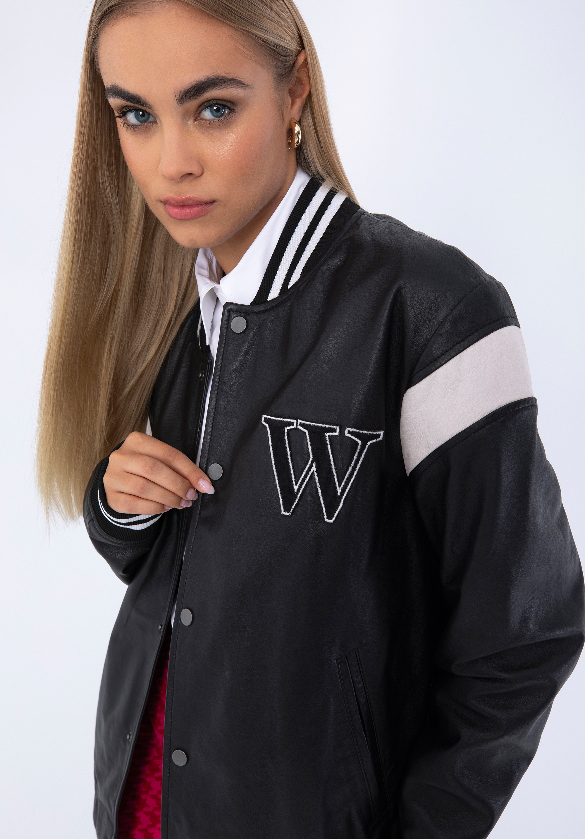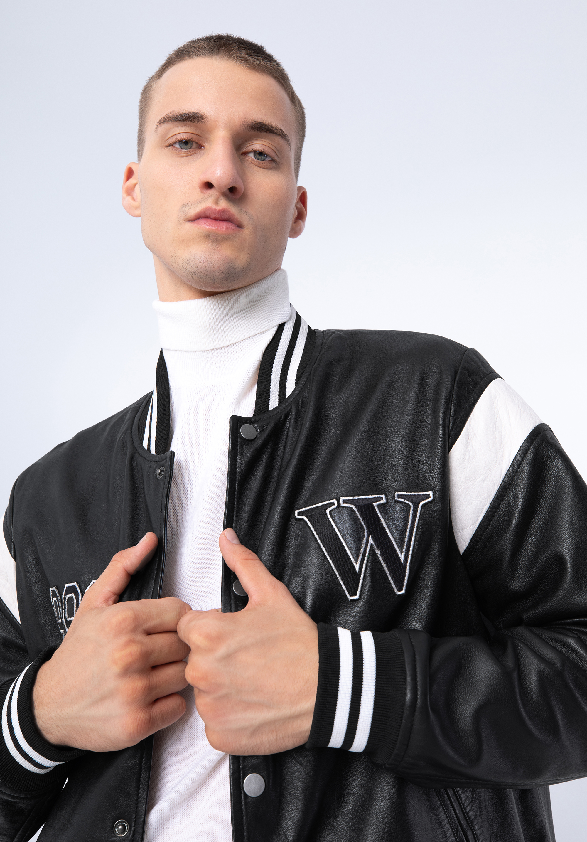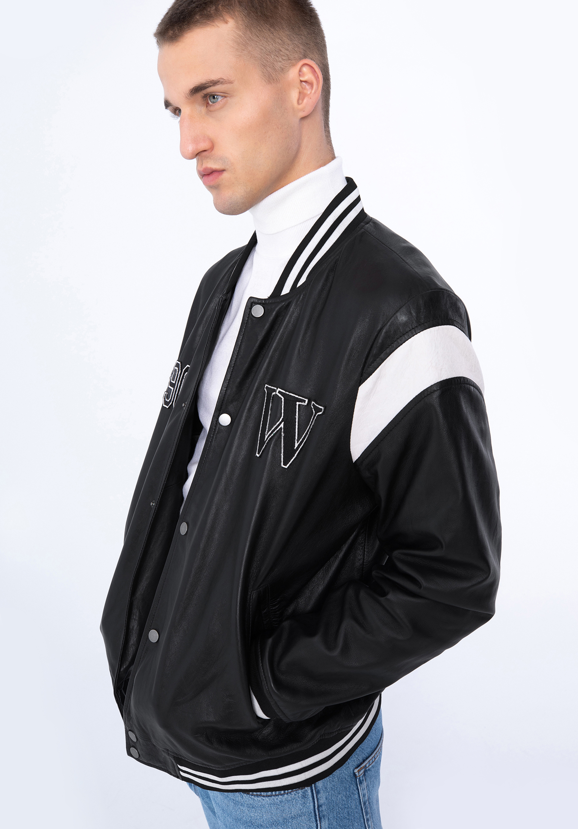 Adăugați notă finală ținutei voastre cu această jachetă de baseball. Având detalii la manșete , un guler de baseball și detalii de tip letterman cu „W” , acest stil este perfect pentru a se suprapune peste pulover atunci când vremea se răcorește. Fabricat din piele naturală de calitate premium , acest stil oferă un plus de căldură și adaugă un plus pentru potrivirea ta. Poartă-l cu blugi și bluză pentru o atmosferă casual.