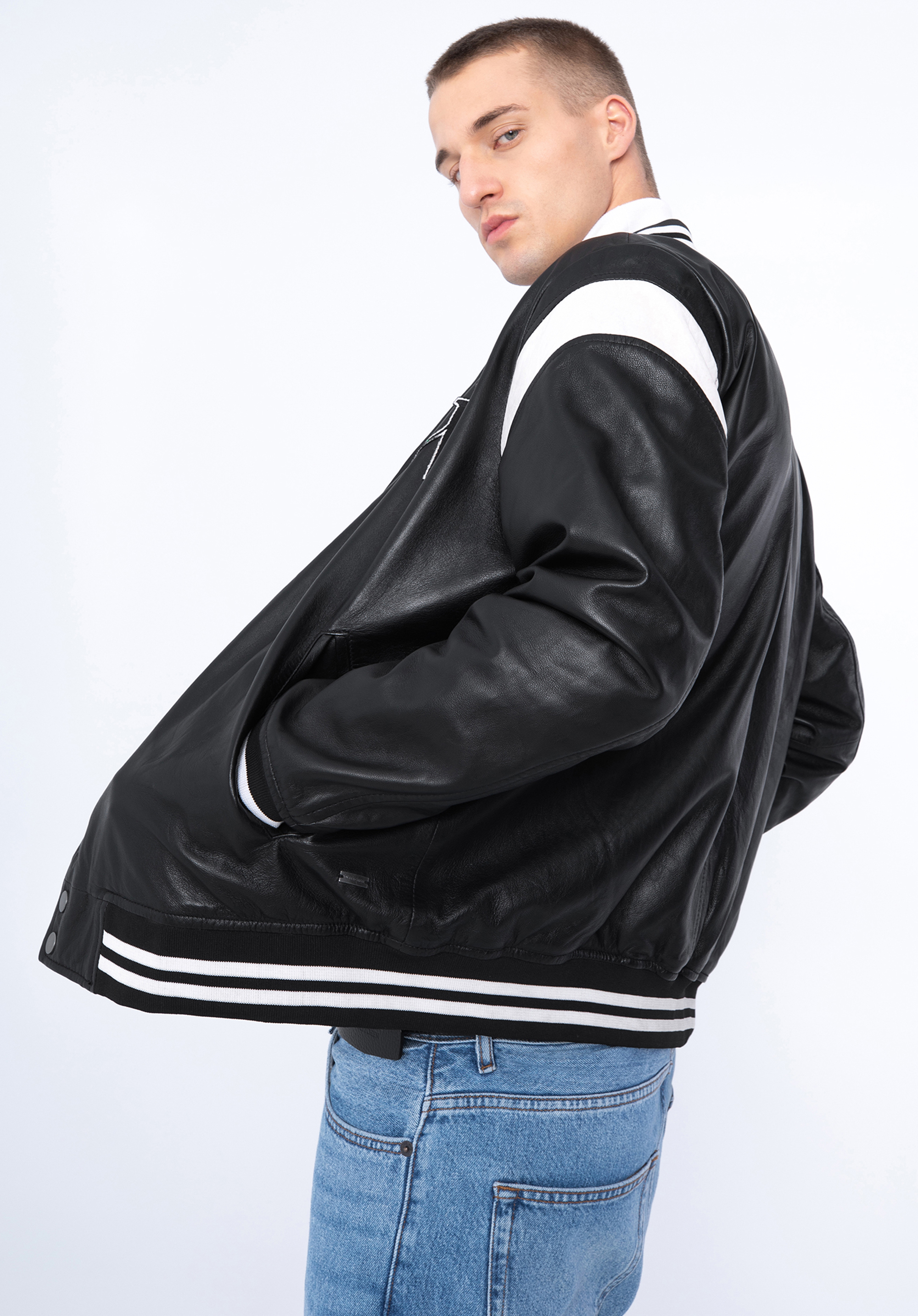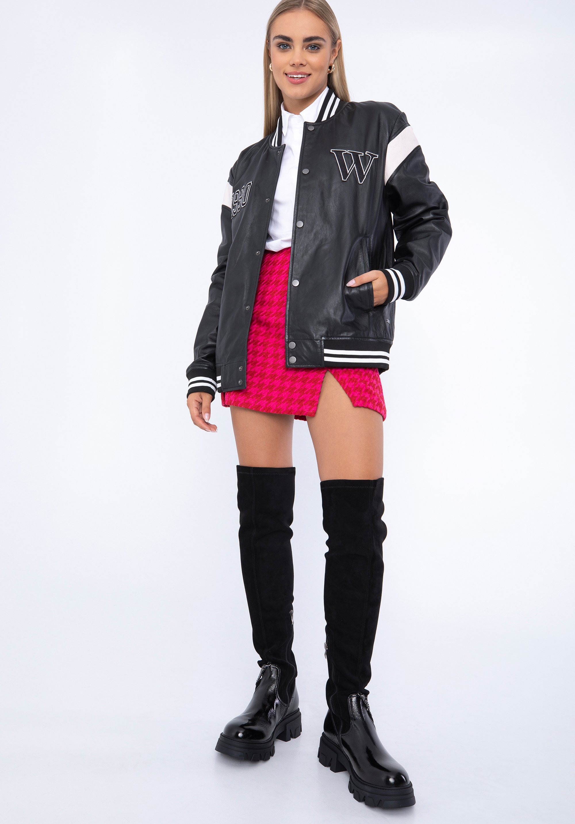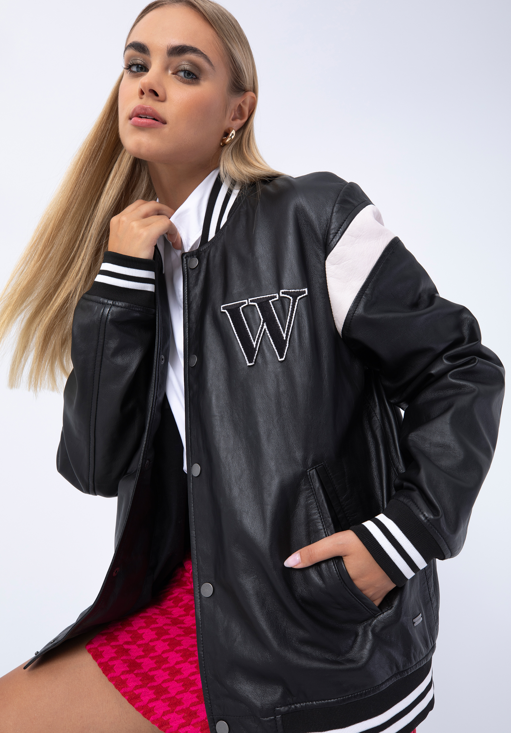 Adăugați notă finală ținutei voastre cu această jachetă de baseball. Având detalii la manșete , un guler de baseball și detalii de tip letterman cu „W” , acest stil este perfect pentru a se suprapune peste pulover atunci când vremea se răcorește. Fabricat din piele naturală de calitate premium , acest stil oferă un plus de căldură și adaugă un plus pentru potrivirea ta. Poartă-l cu blugi și bluză pentru o atmosferă casual.