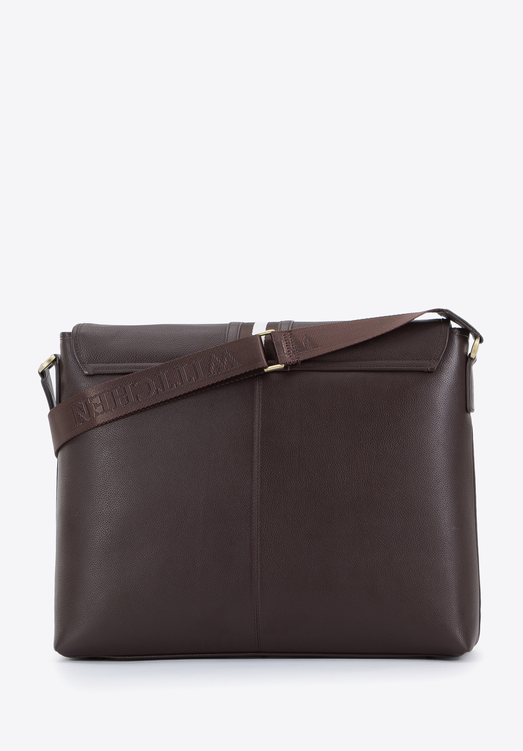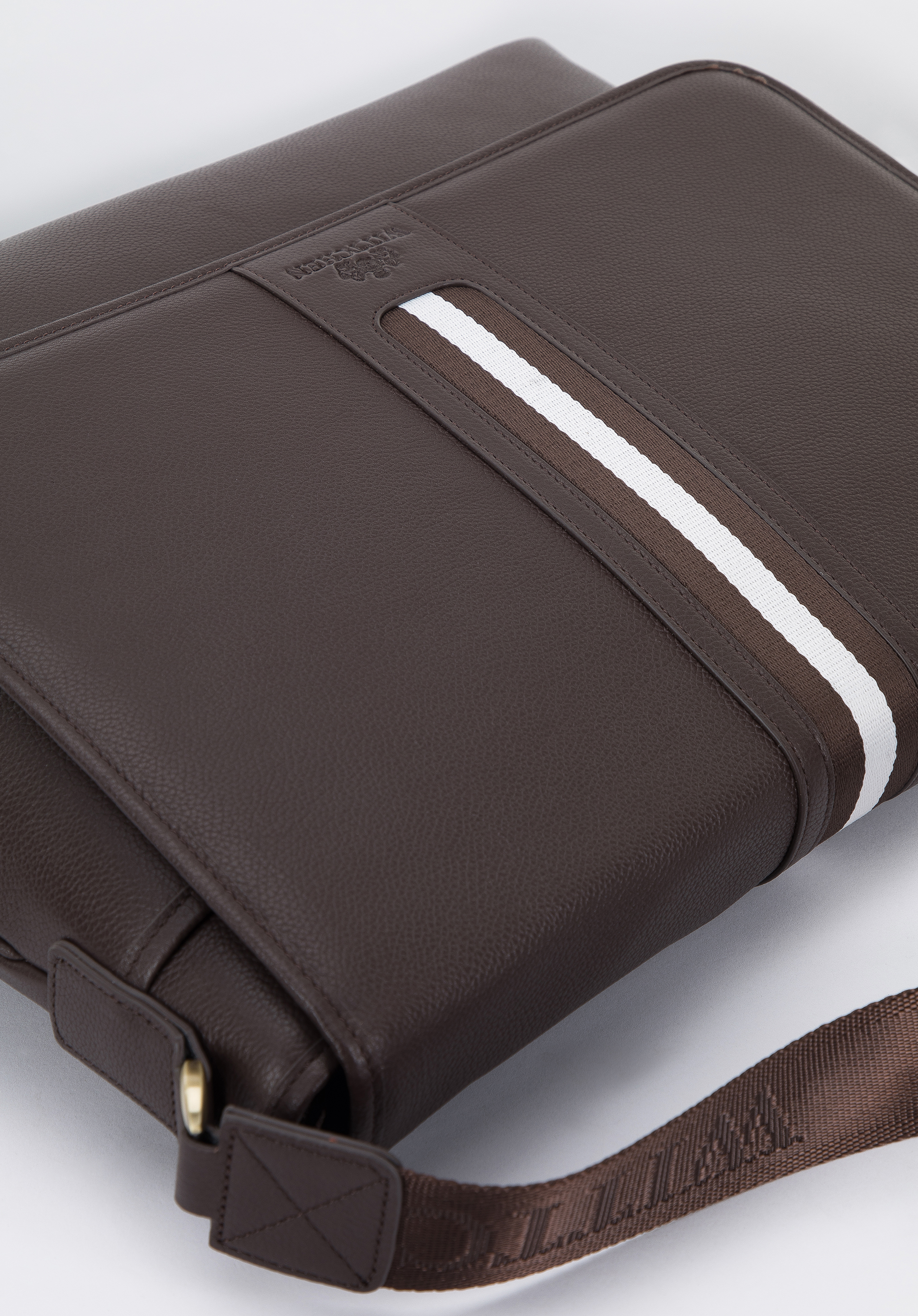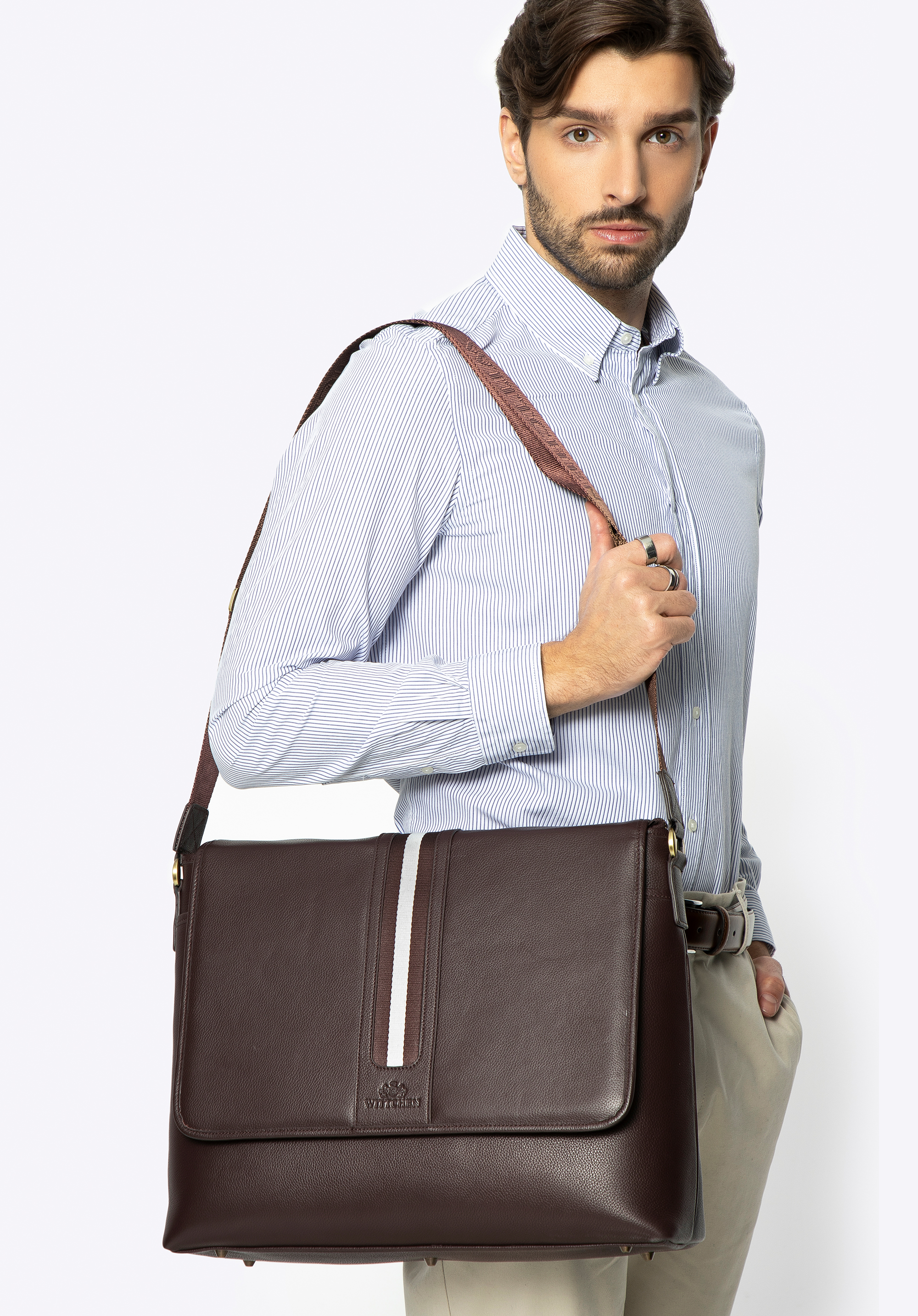 Această geantă pentru laptop este un accesoriu elegant pe care il poți purta in fiecare zi. Fabricat din piele naturală de înaltă calitate, acest accesoriu are un detaliu cu dungi frontale pentru un plus de stil sportiv . Deschizându-se la un interior bine organizat , această geantă pentru laptop va potrivi documente de dimensiunea A4, precum și un portofel, telefon, calendar și câteva articole. În plus, are un buzunar căptușit în care poate încăpea un dispozitiv electronic cu dimensiunea maximă de 25 cm x 36 cm. Geanta pentru laptop de 15,6" pentru bărbați este un accesoriu atemporal pe care îl poți purta atât la serviciu, cât și după muncă.