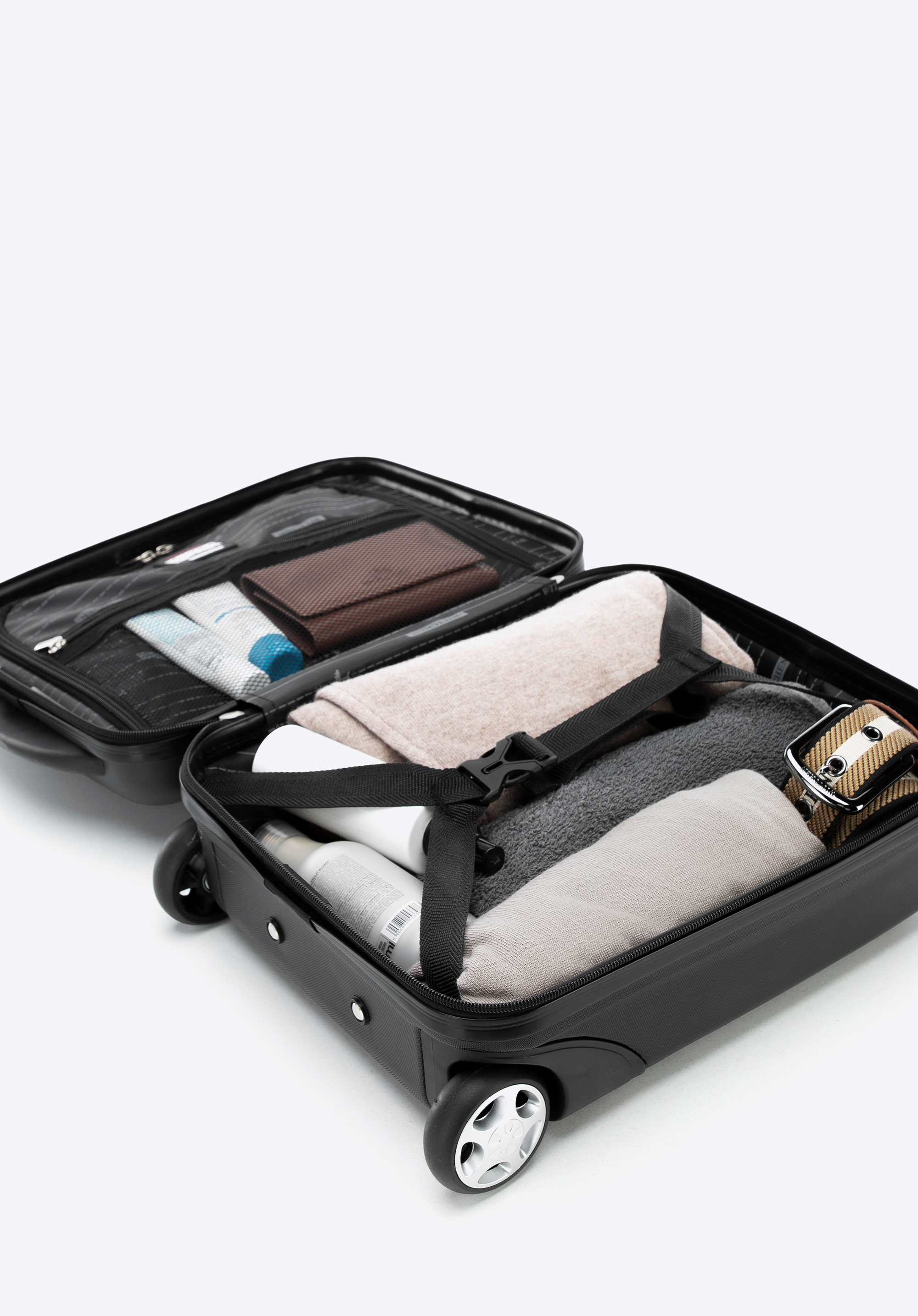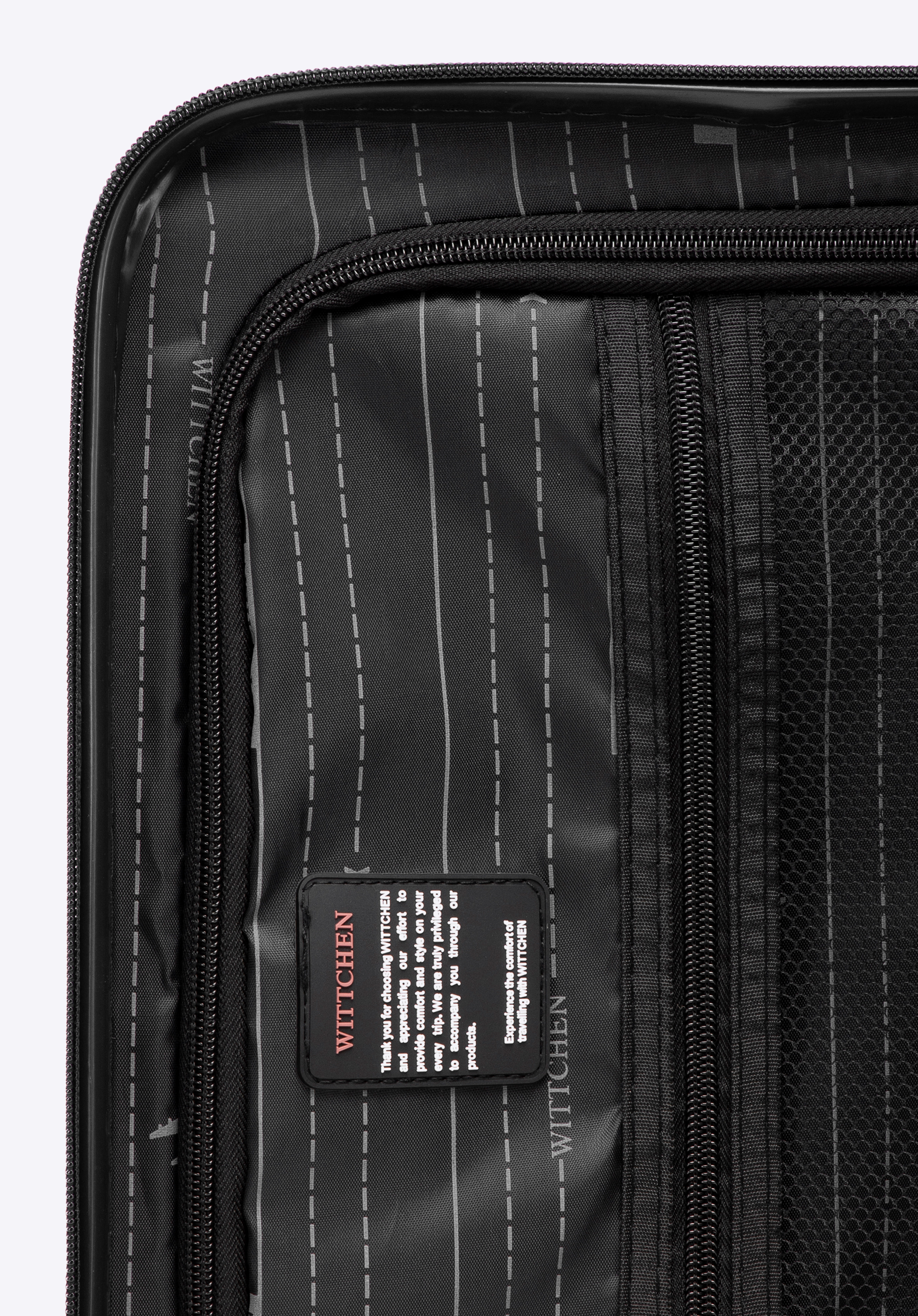 - Interior: Valiza include curele reglabile pentru a-ți asigura bunurile și un buzunar din plasă pentru articole mai mici, facilitând organizarea și oferind acces rapid la elementele esențiale.
