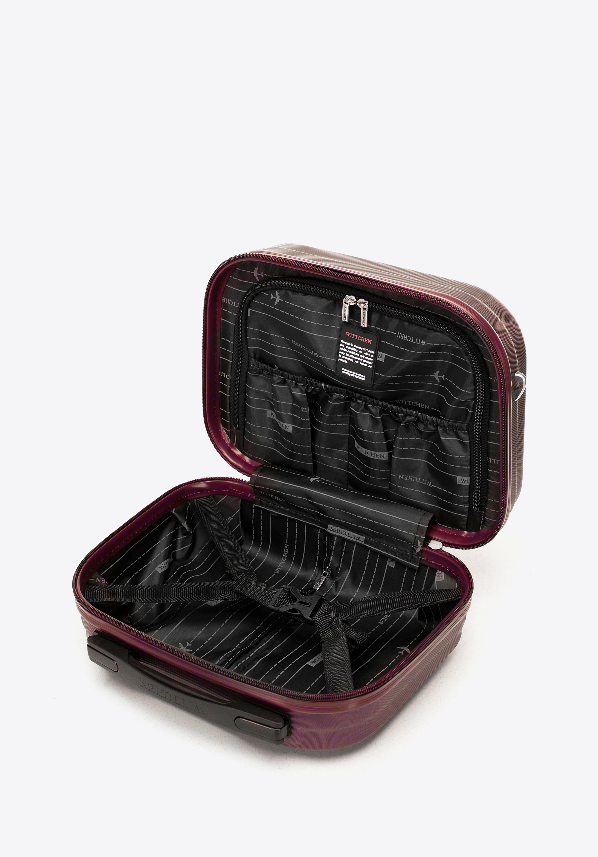Geanta noastră cosmetică din colecția Skyspeed Line este o alegere elegantă și funcțională pentru cei care apreciază ordinea din mers. Fabricată din ABS durabil și dotată cu patru picioare robuste și o închidere cu fermoar, aceasta păstrează conținutul în siguranță și cosmeticele ușor accesibile. Interiorul cu căptușeală cu logo, bretele pentru fixarea obiectelor și o curea de valiză fac din geanta de cosmetice completarea perfectă pentru valizele WITTCHEN.