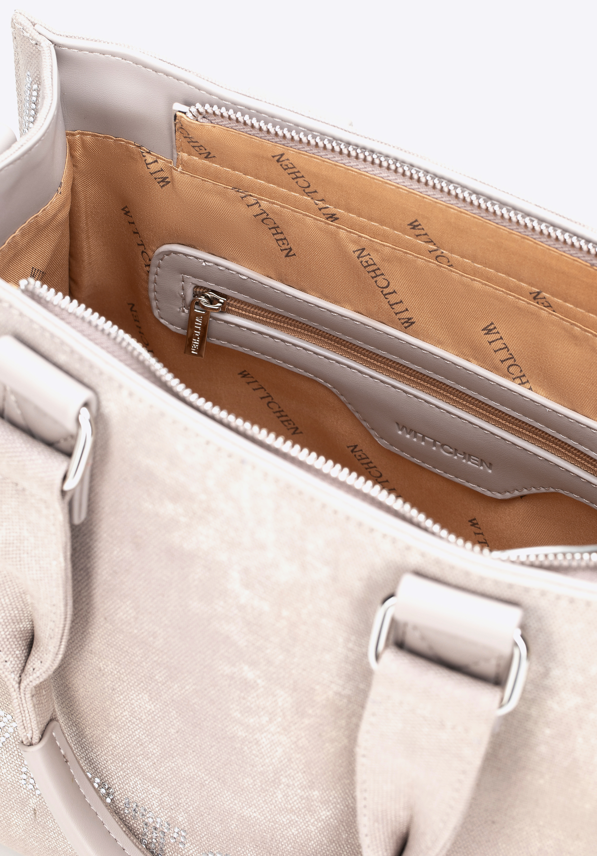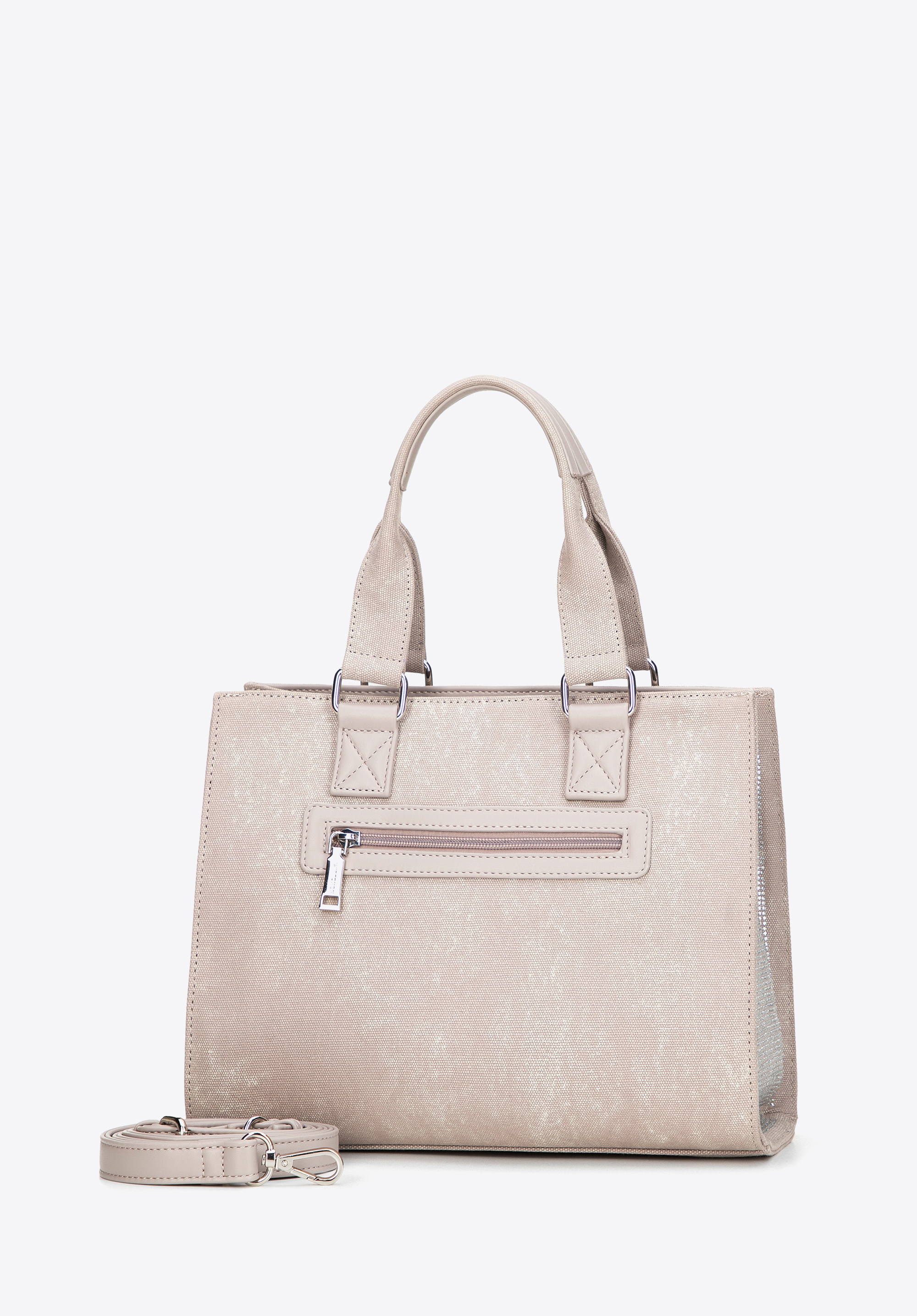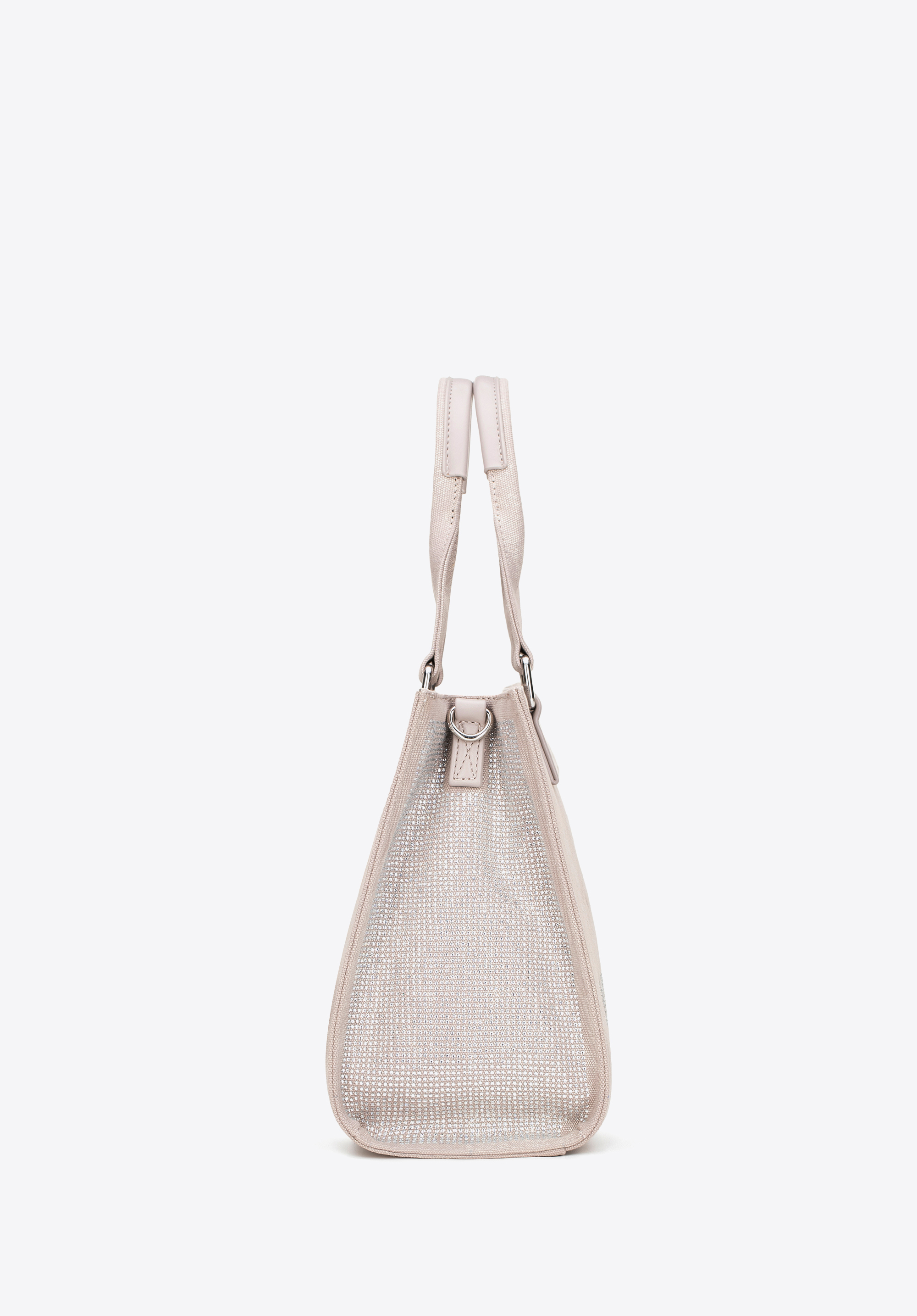 Optează pentru o geantă care combină eleganța, caracterul practic și o notă subtilă de strălucire. Două mânere o fac ușor de purtat în mână, în timp ce cureaua detașabilă și reglabilă îți permite să o porți pe umăr pentru o versatilitate mai mare. Lateralele împodobite cu strasuri îi conferă o notă ușoară și glamour, iar logo-ul brandului de pe partea din față îi evidențiază designul rafinat.
