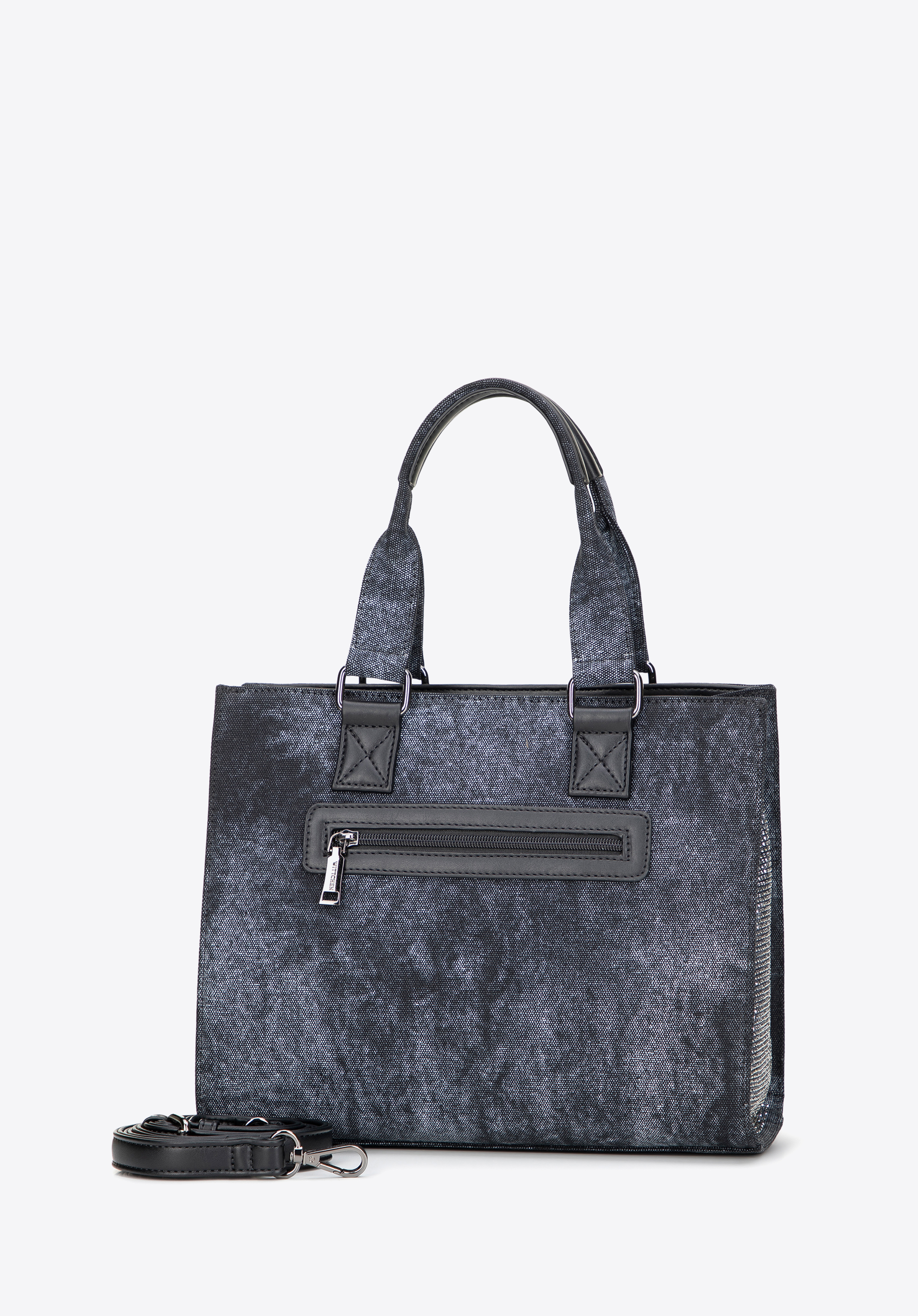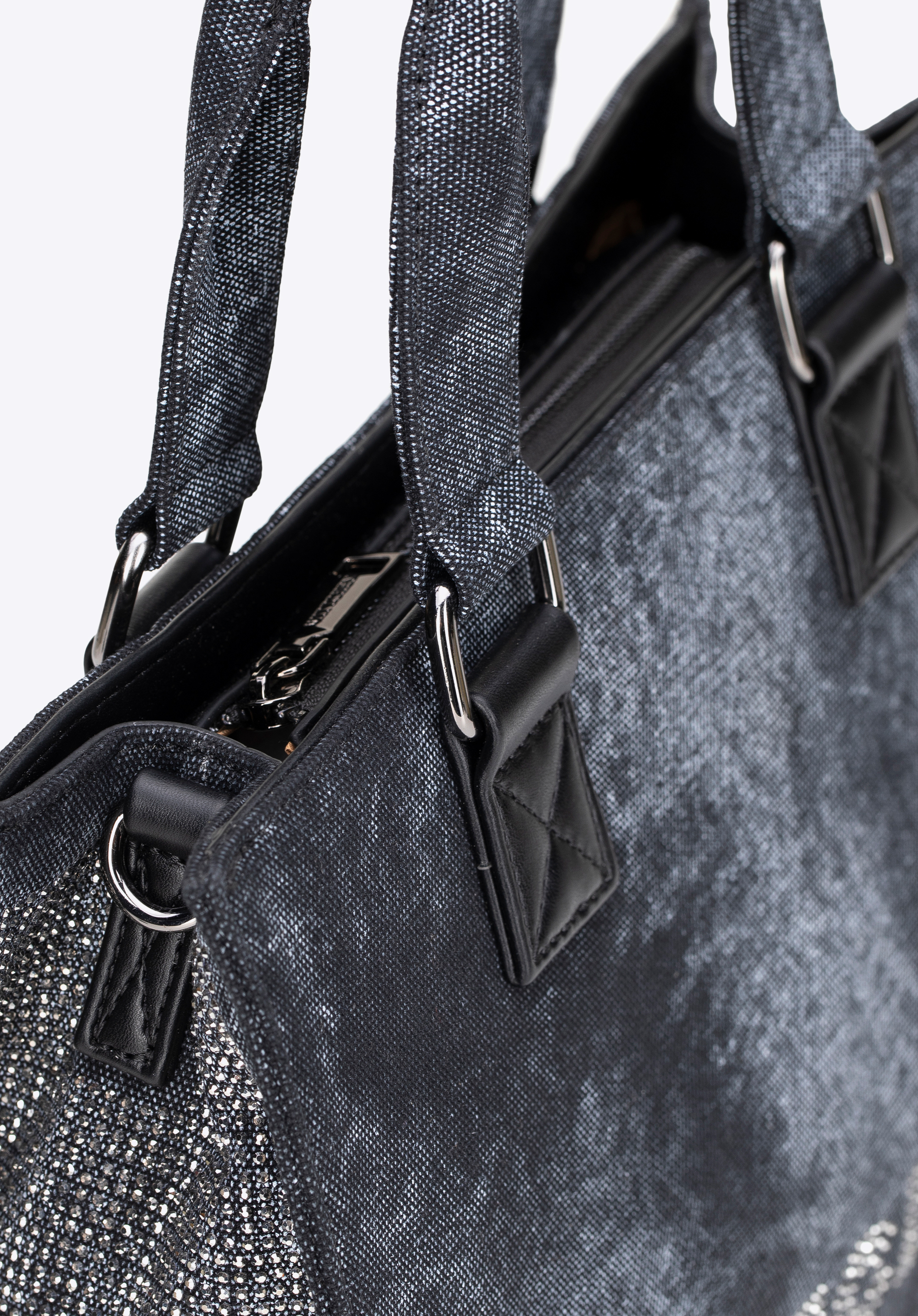 Optează pentru o geantă care combină eleganța, caracterul practic și o notă subtilă de strălucire. Două mânere o fac ușor de purtat în mână, în timp ce cureaua detașabilă și reglabilă îți permite să o porți pe umăr pentru o versatilitate mai mare. Lateralele împodobite cu strasuri îi conferă o notă ușoară și glamour, iar logo-ul brandului de pe partea din față îi evidențiază designul rafinat.
