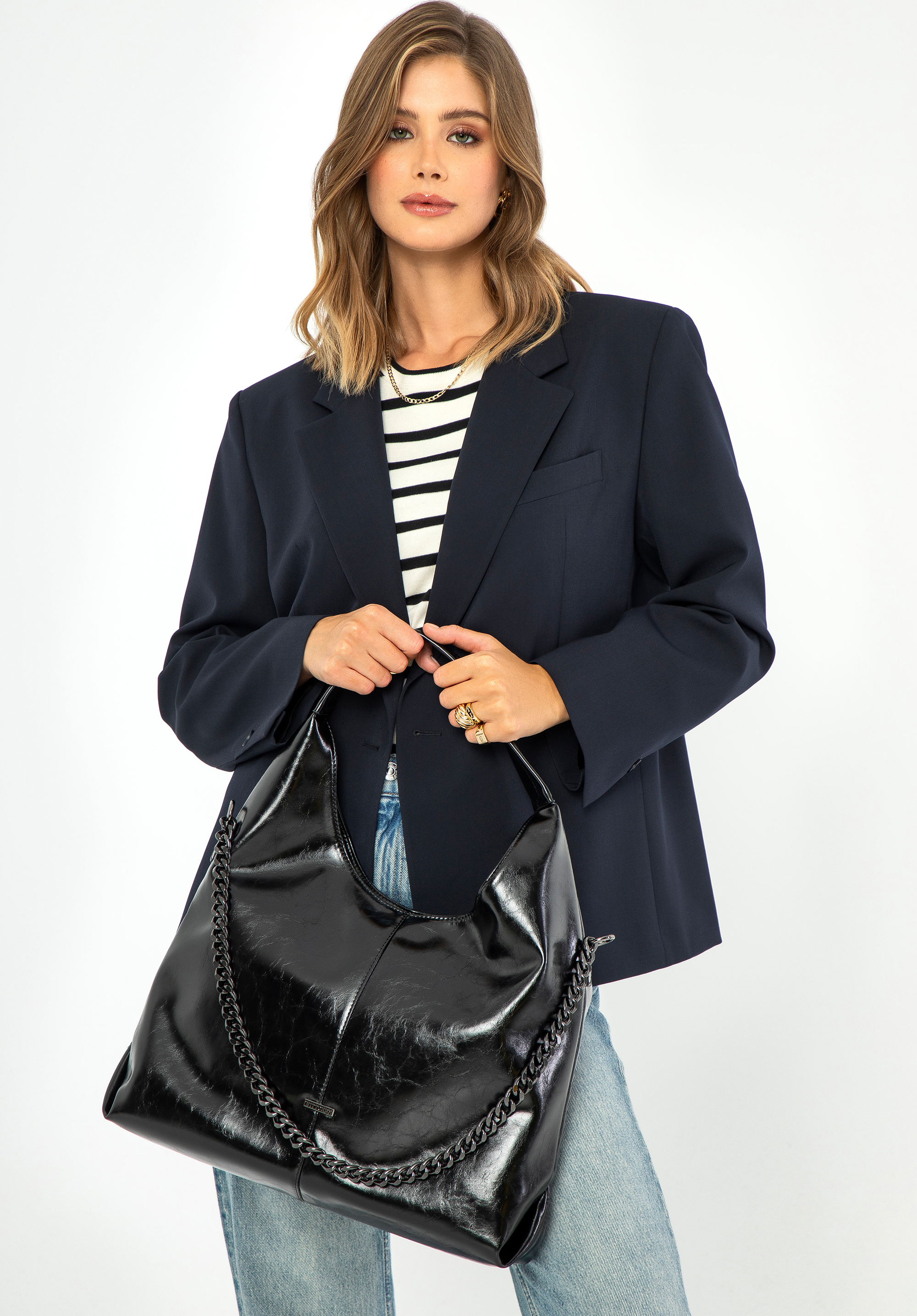 Îți prezentăm geanta noastră de mână unică din piele ecologică - accesoriul perfect pentru femeile moderne care apreciază eleganța și funcționalitatea. Lanțul decorativ de pe partea din față a genții îi conferă un caracter unic, făcând-o să iasă în evidență și îmbogățind orice styling.