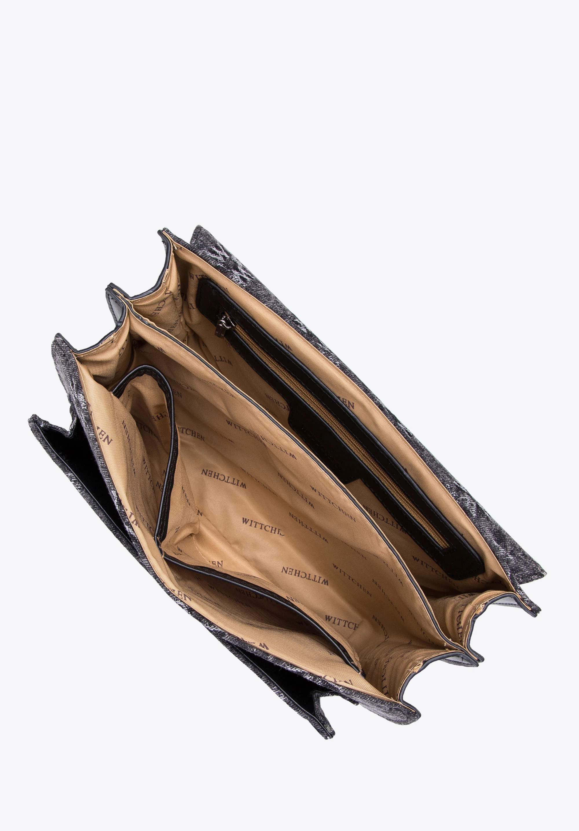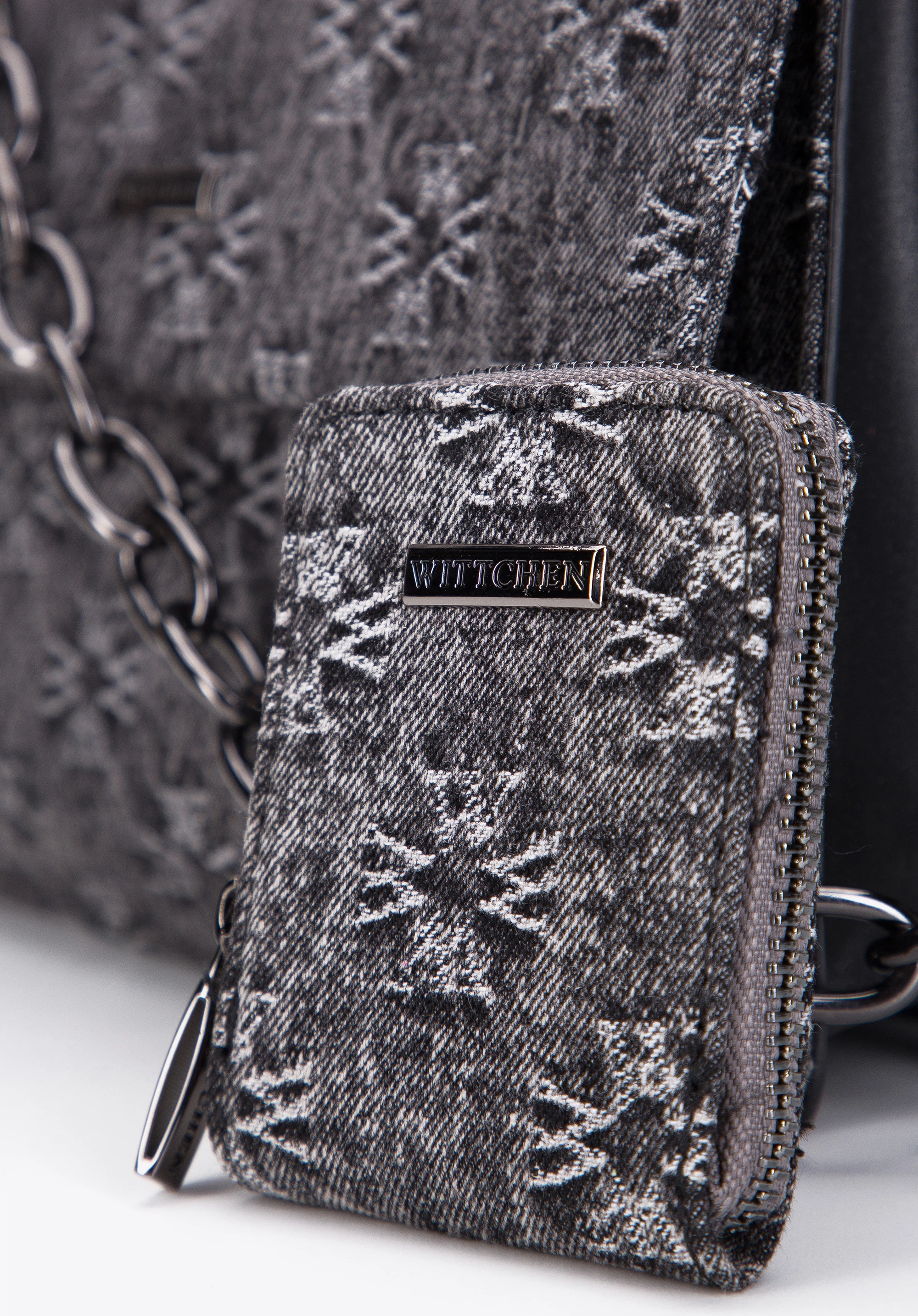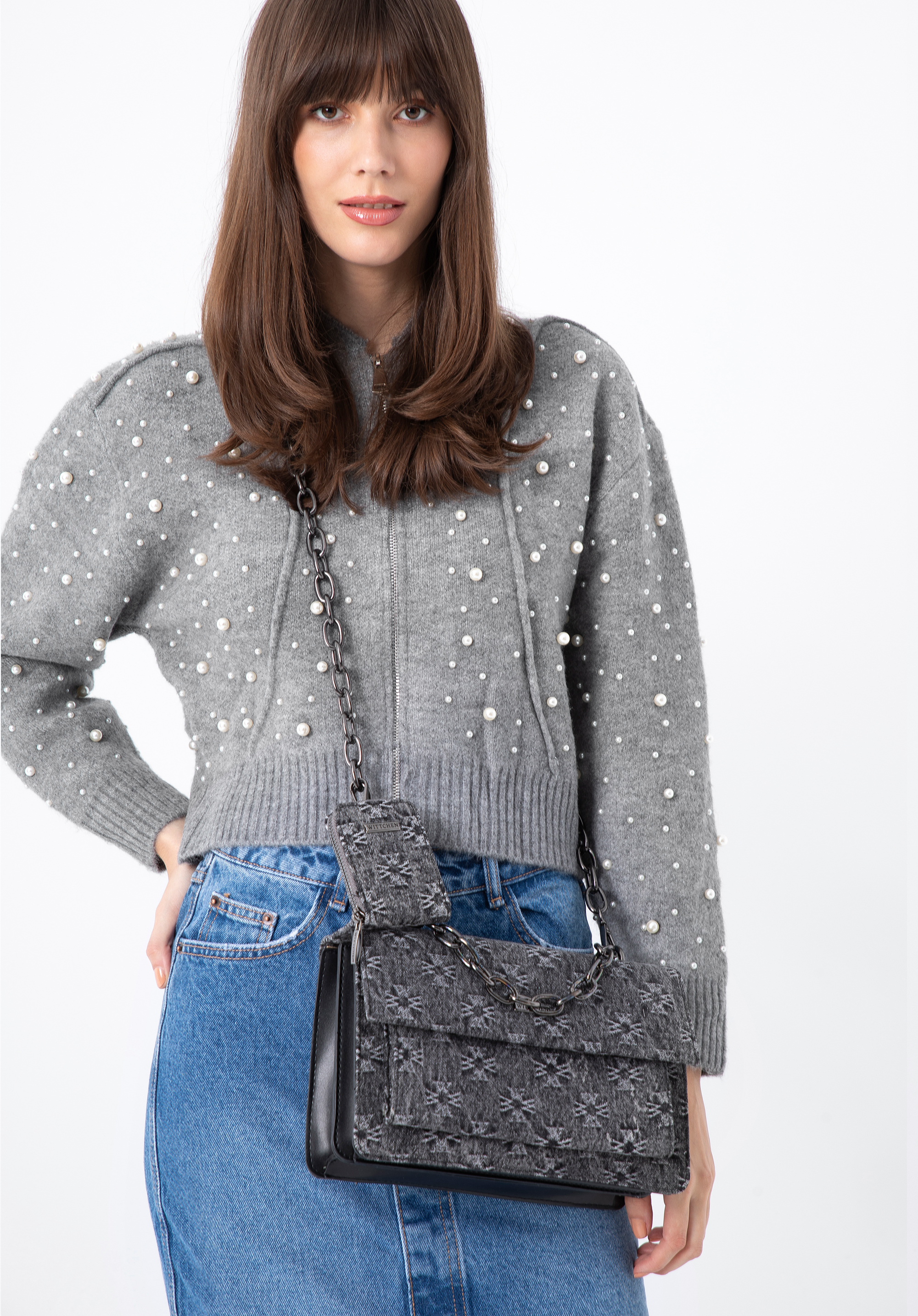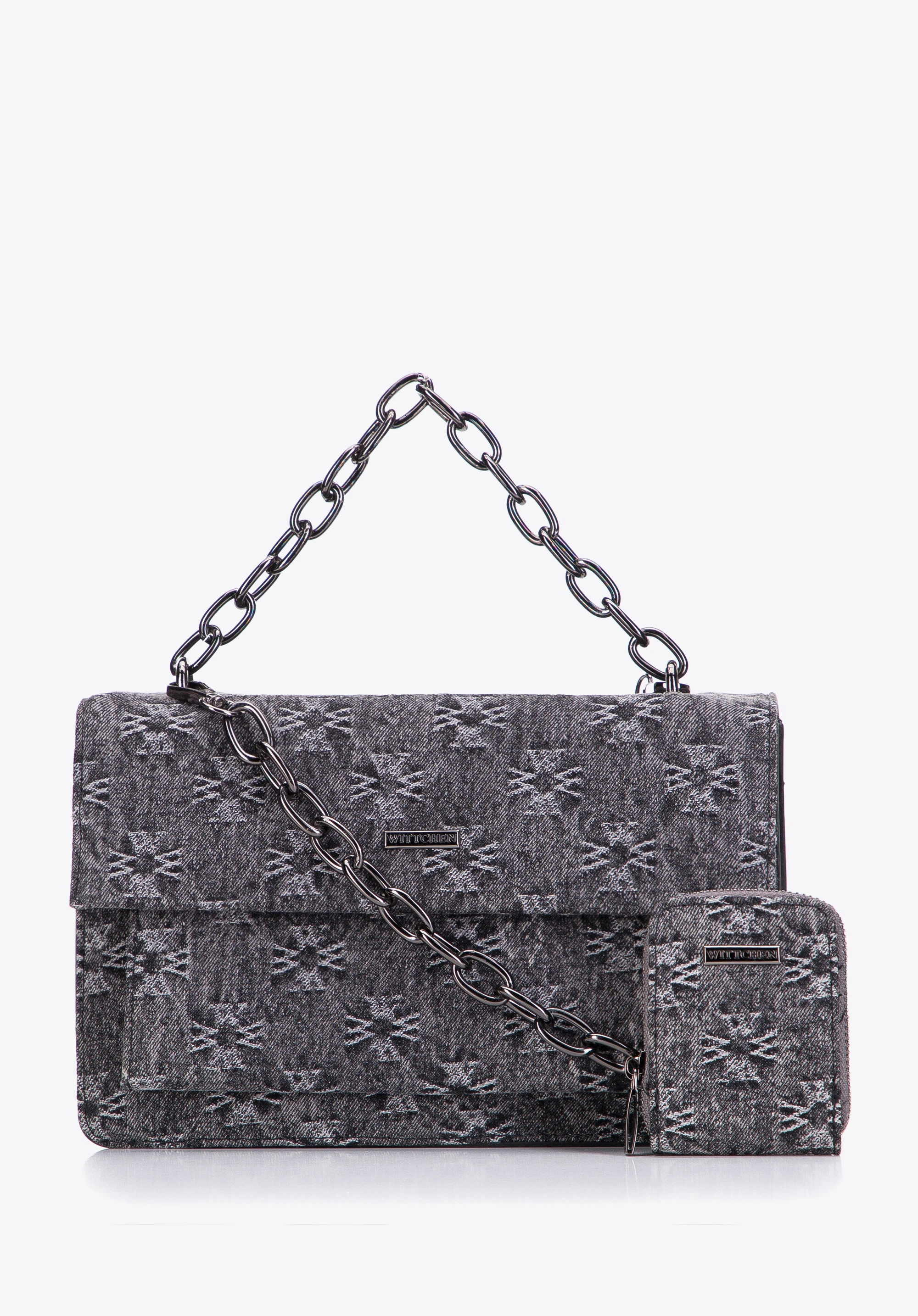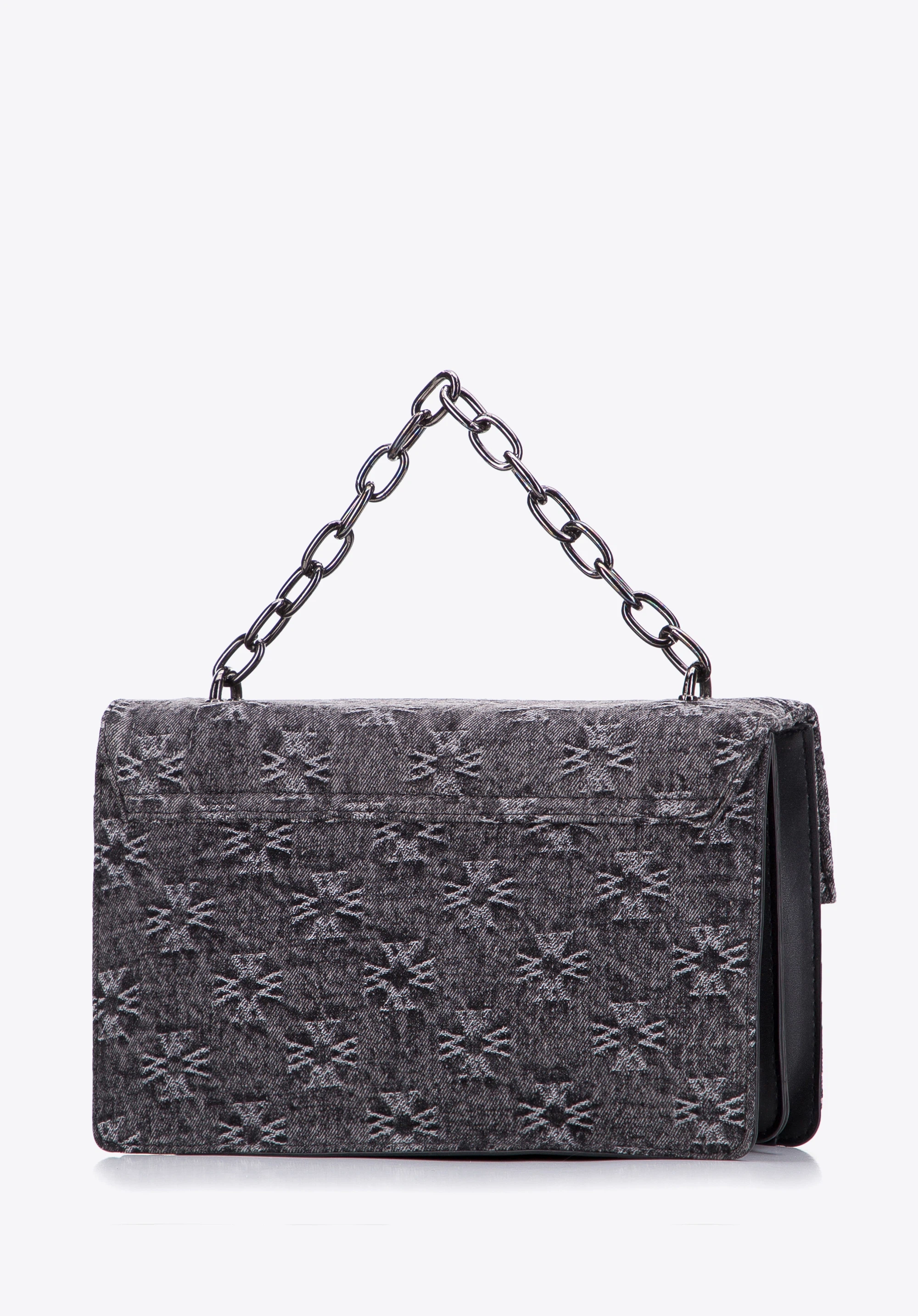 Geantă de damă din denim cu clapă monogramă gri