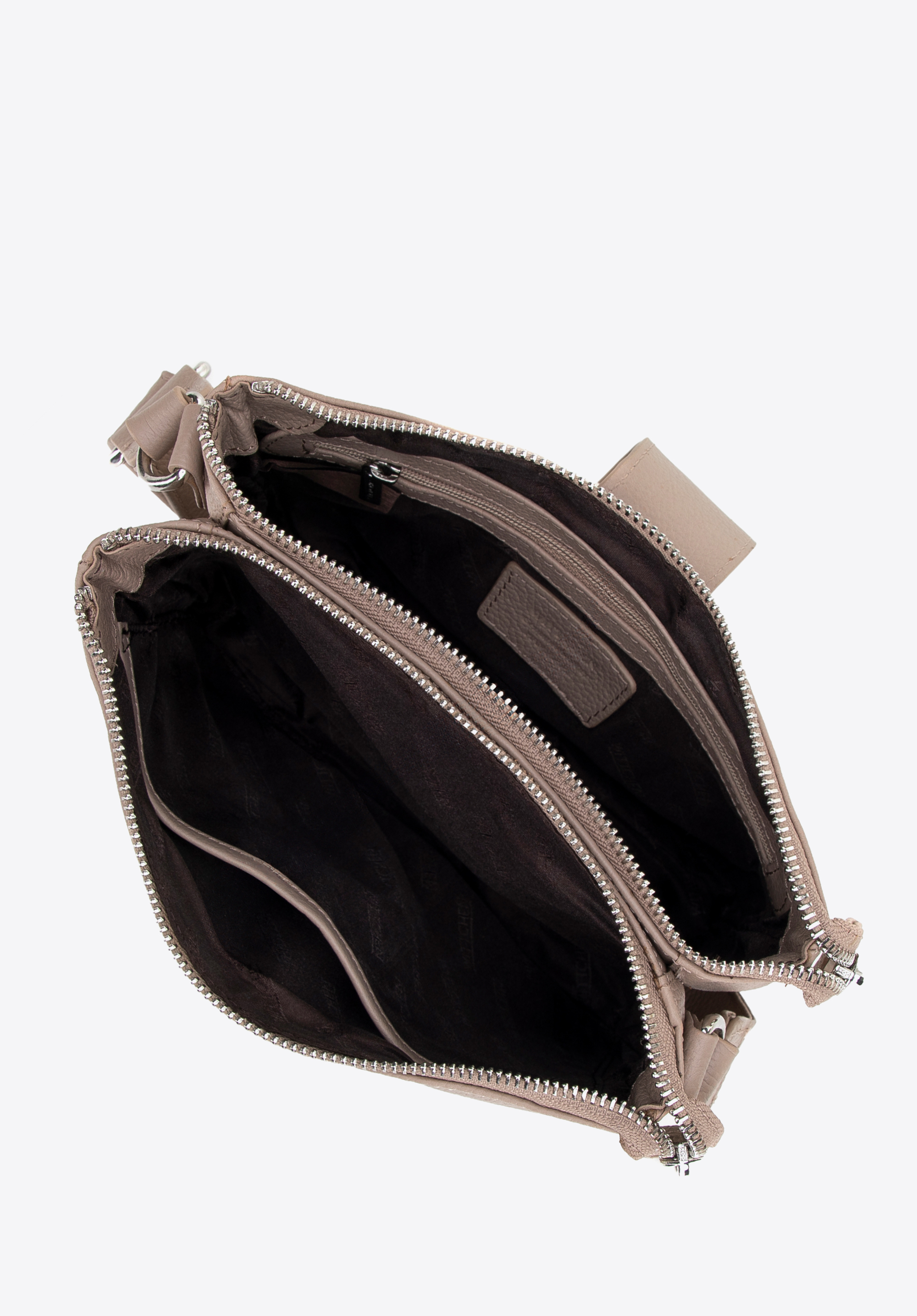Această geantă elegantă, realizată din cea mai bună piele naturală, este alegerea perfectă pentru femeile care apreciază atât stilul, cât și funcționalitatea în orice situație. Designul cu două compartimente cu fermoar și o curea magnetică suplimentară asigură o ordine excelentă și acces rapid la elementele esențiale. Un buzunar practic cu fermoar pe spate este ideal pentru obiectele mici pe care dorești să le păstrezi la îndemână.