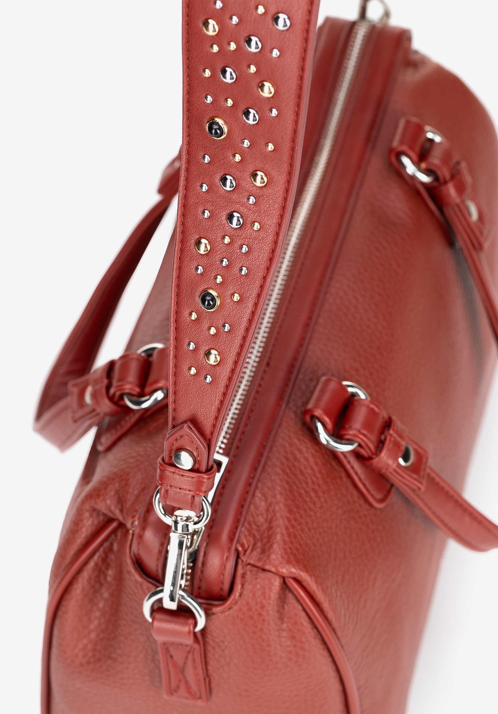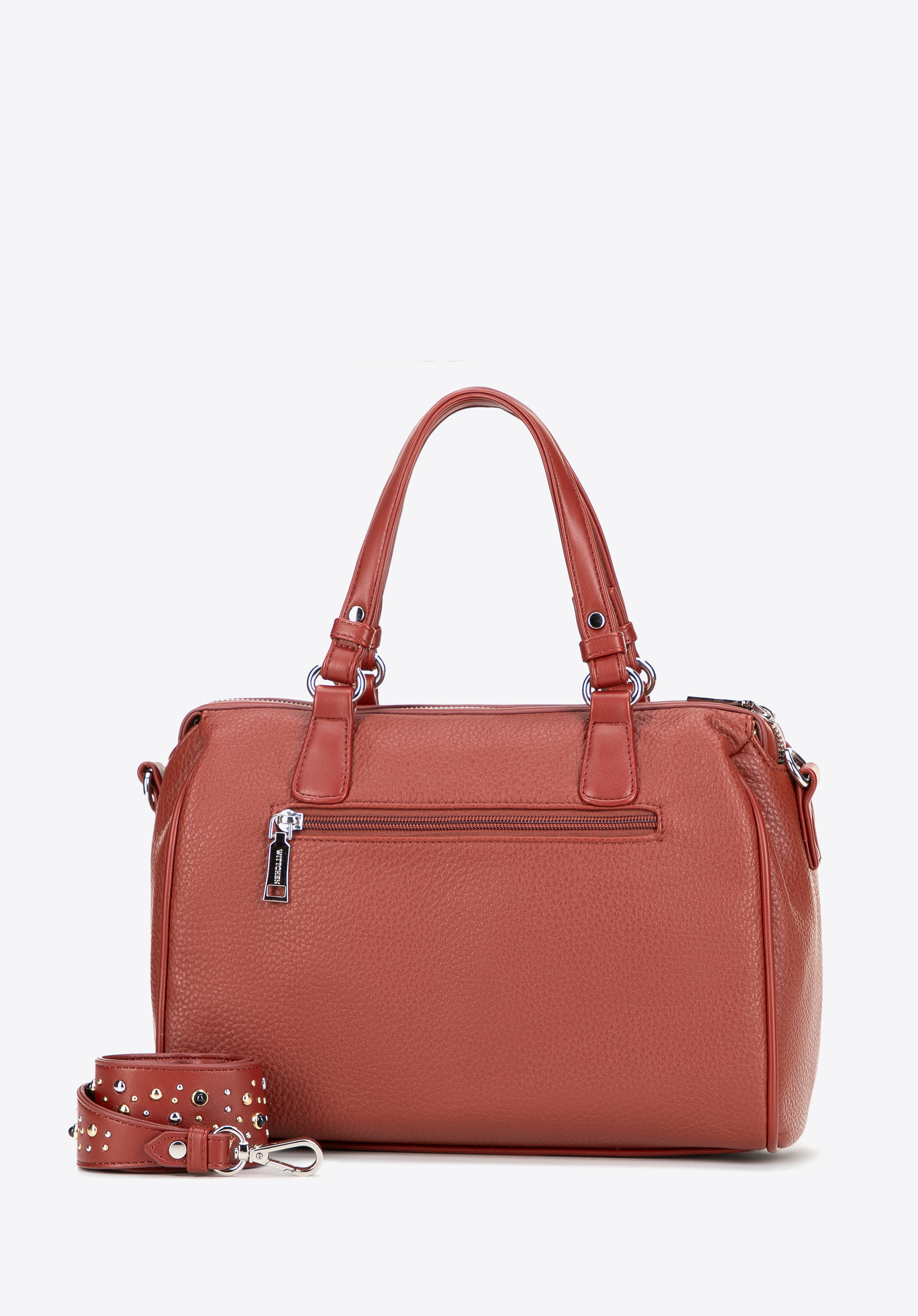 - Design: Geantă modernă cu curea decorativă cu ținte și un logo subtil al mărcii pe față și fermoare – adaugă o notă îndrăzneață și modernă ținutei tale.