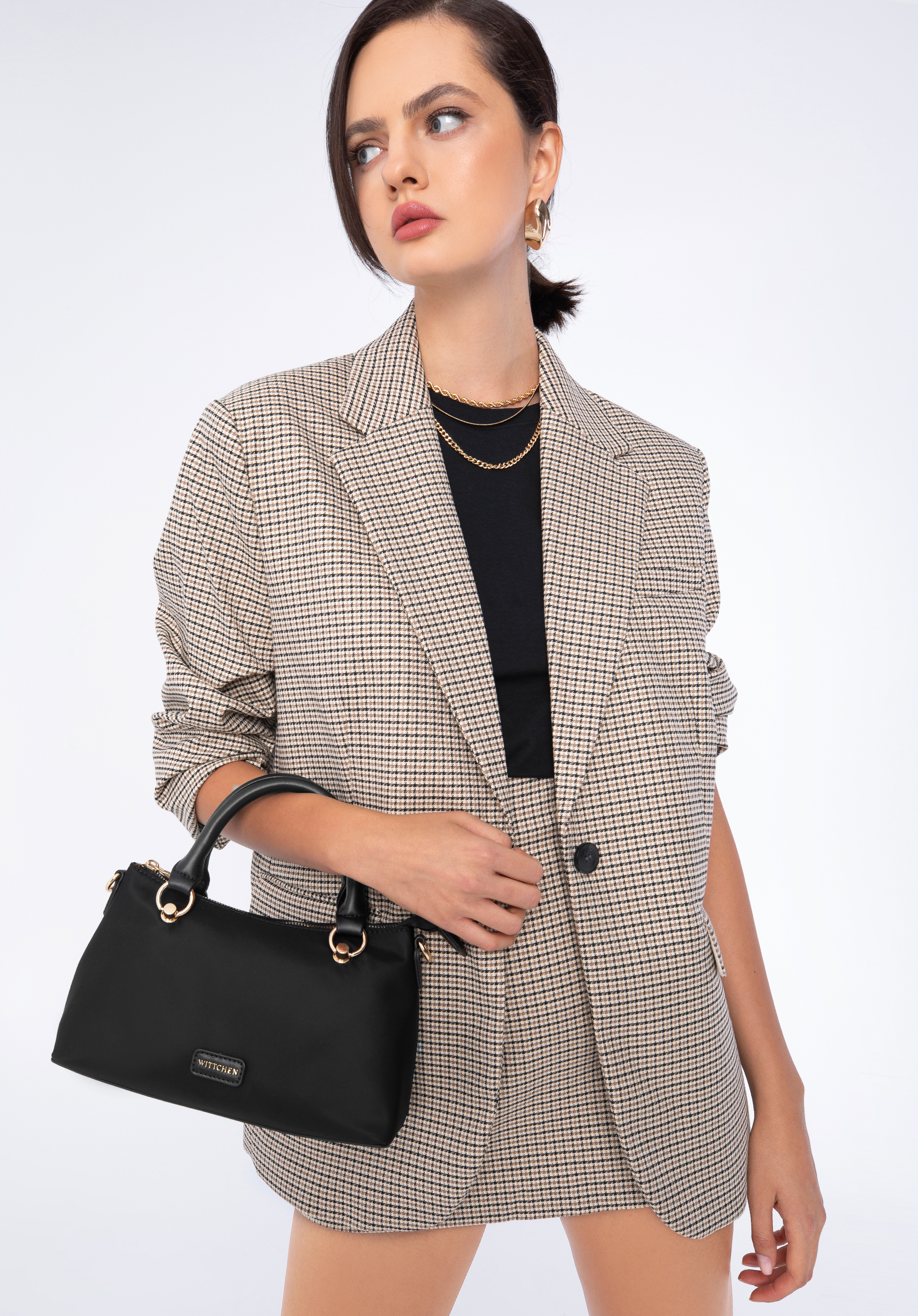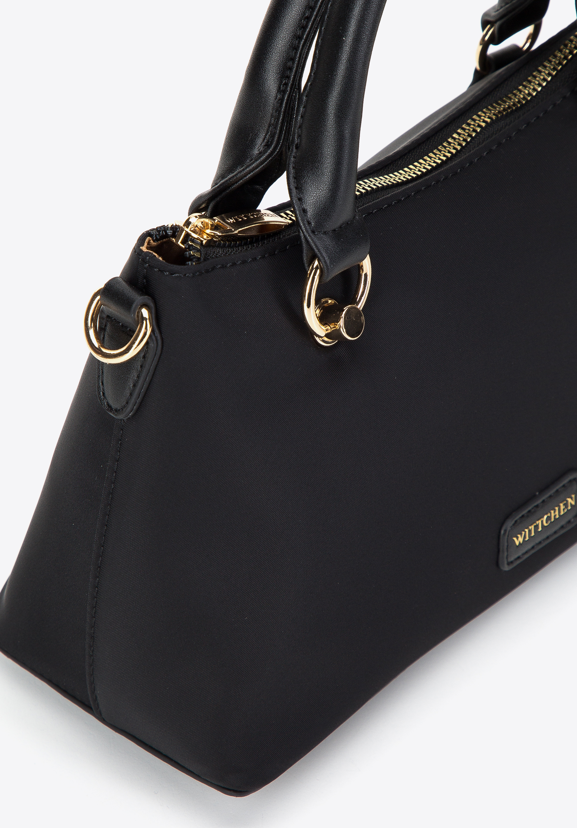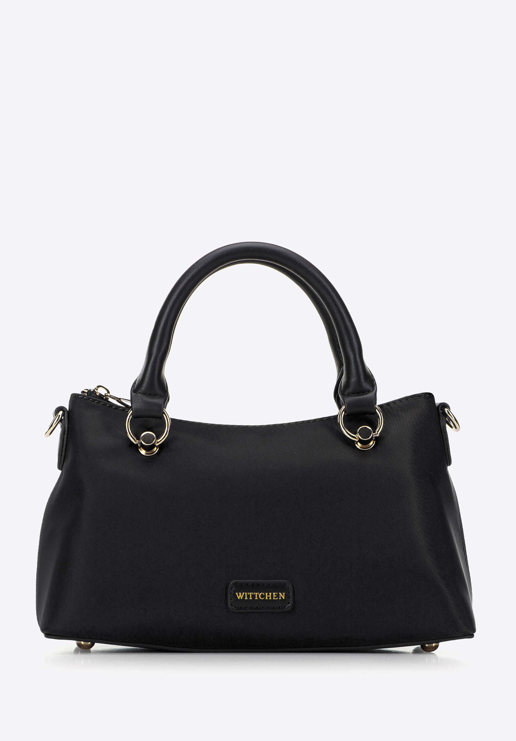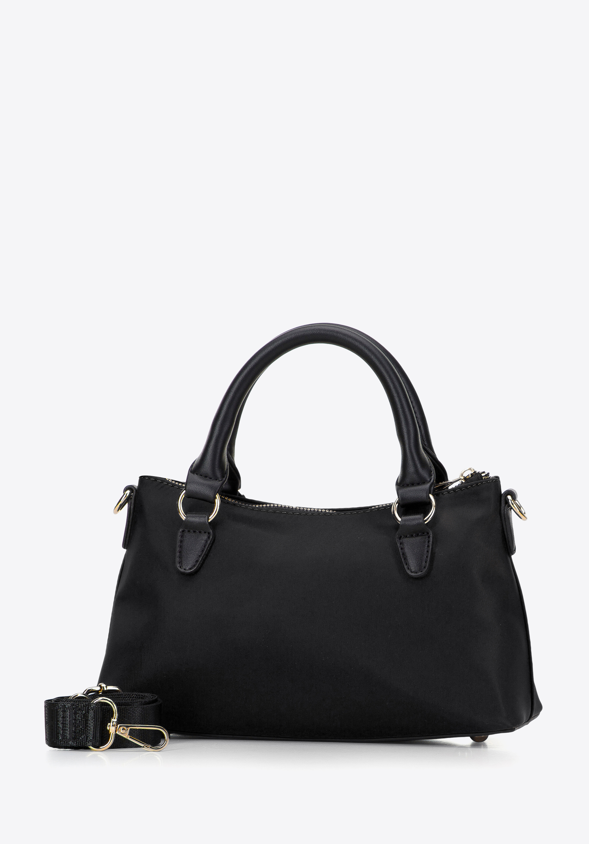 Această geantă de mână elegantă aduce un nou stil în colecția dvs. de accesorii. Prezintă o formă trapezoidală unică și un fund structurat cu picioare metalice de protecție. Confecționată din material din nailon lucios, această geantă de mână are mânere din piele artificială și catarame rotunde decorative. În interior veți găsi spațiu pentru telefon, suport pentru carduri, mănuși de rezervă și rujul preferat - perfect pentru o excursie cu prietenii, o plimbare sau un film. O puteți purta în mână sau puteți atașa cureaua de umăr reglabilă și o atârna pe umăr. Această mini geantă din nailon este o alegere excelentă pentru orice fan al accesoriilor elegante.