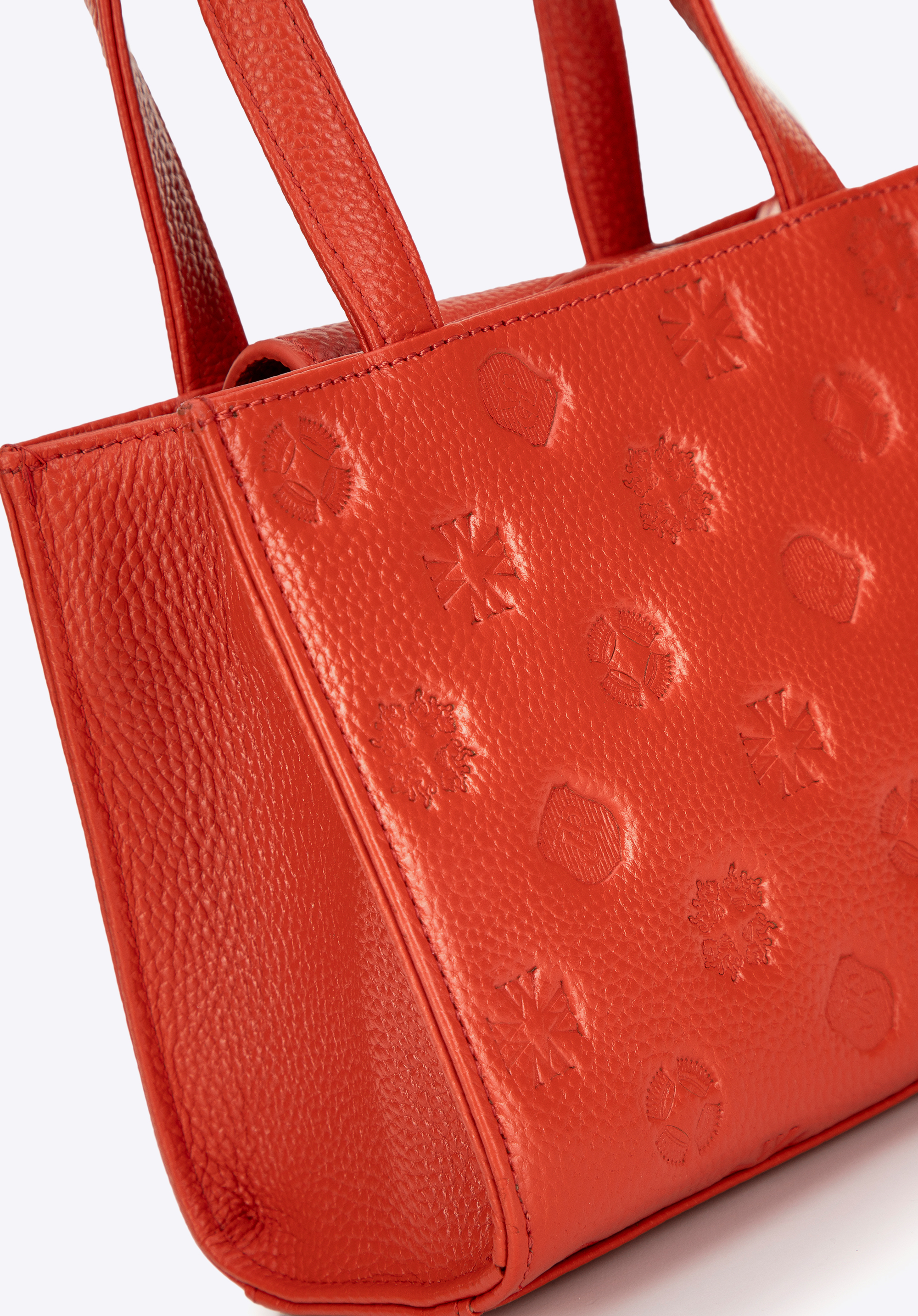 - Material: Pielea naturală embosată cu semnătura producătorului este un material elegant și durabil care subliniază caracterul luxos al genții.