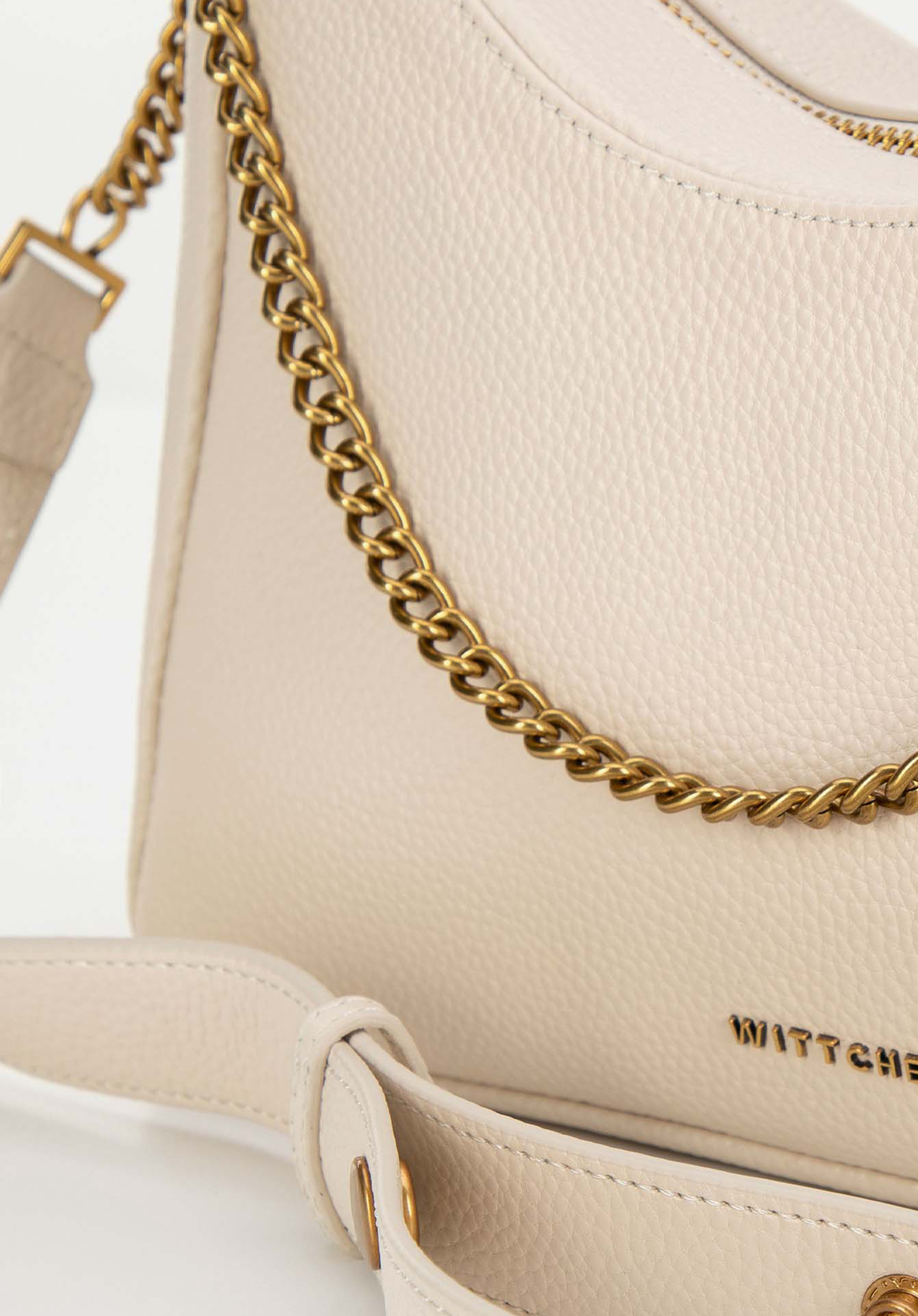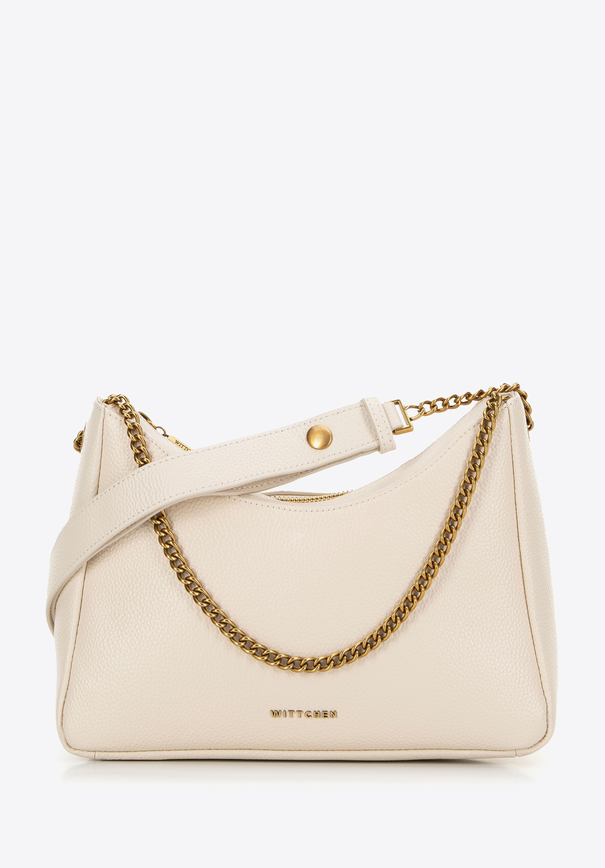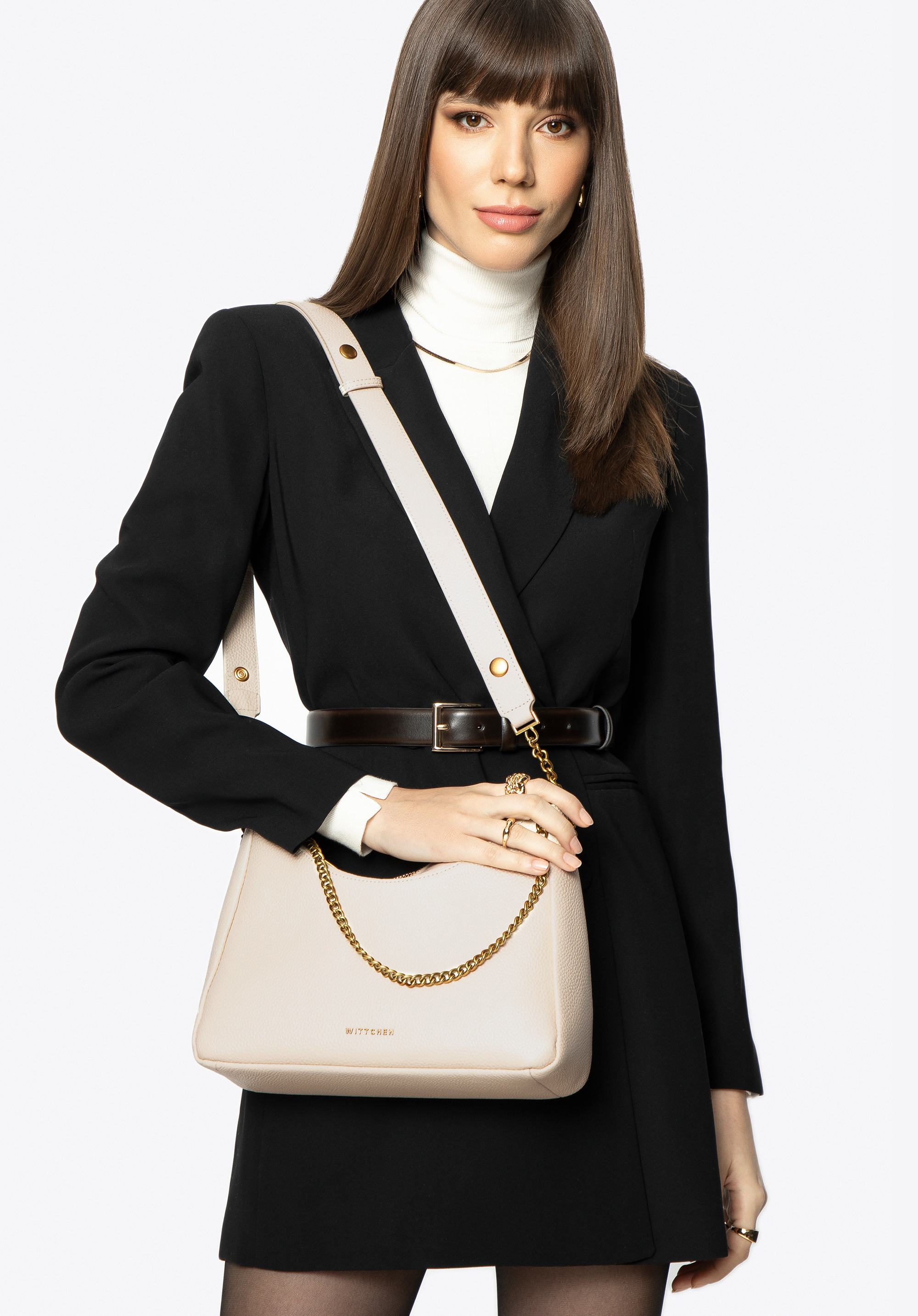 - Atingeri estetice: Un lanț de bijuterii și o curea lată cu nituri dau genții o notă unică și la modă.