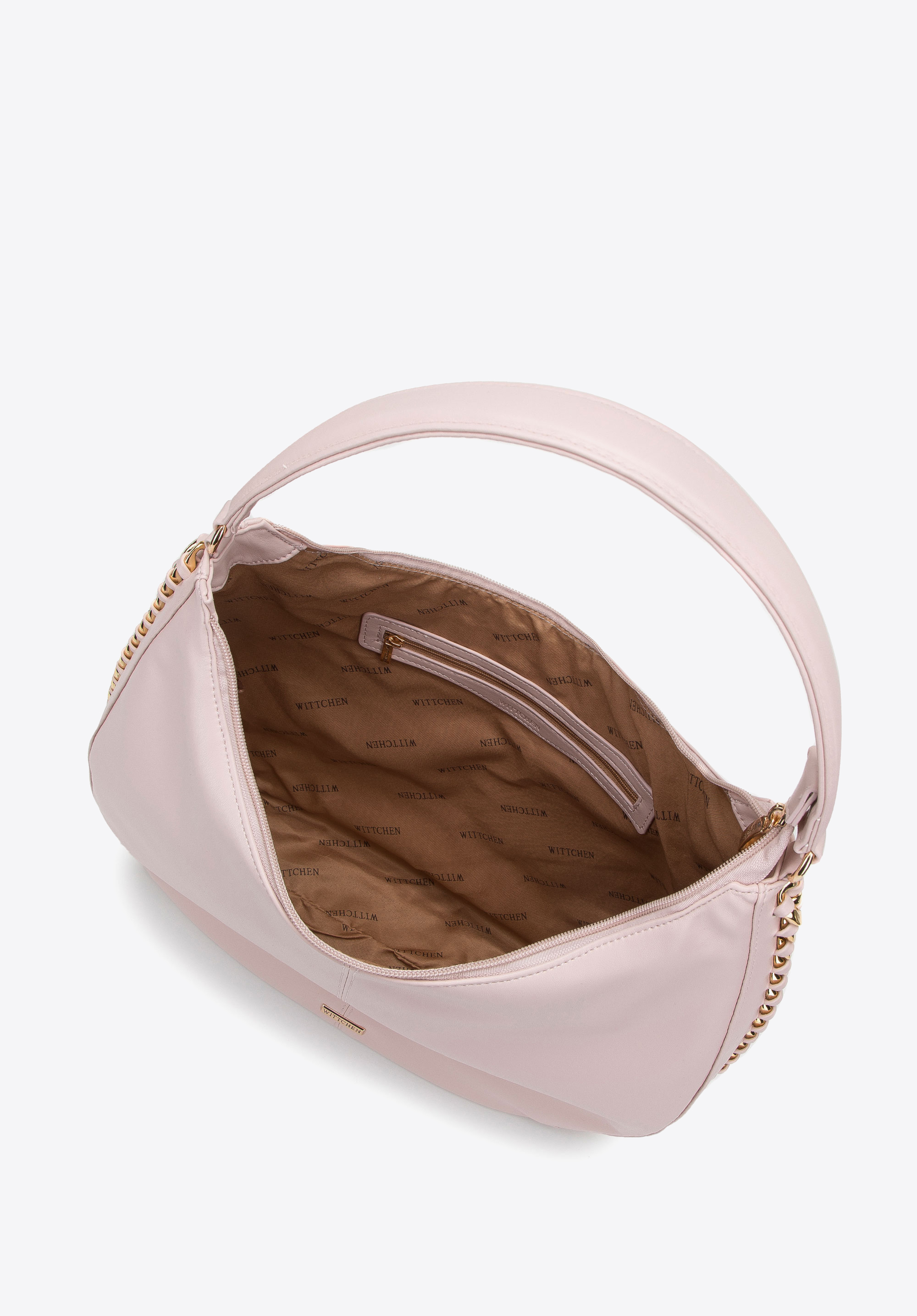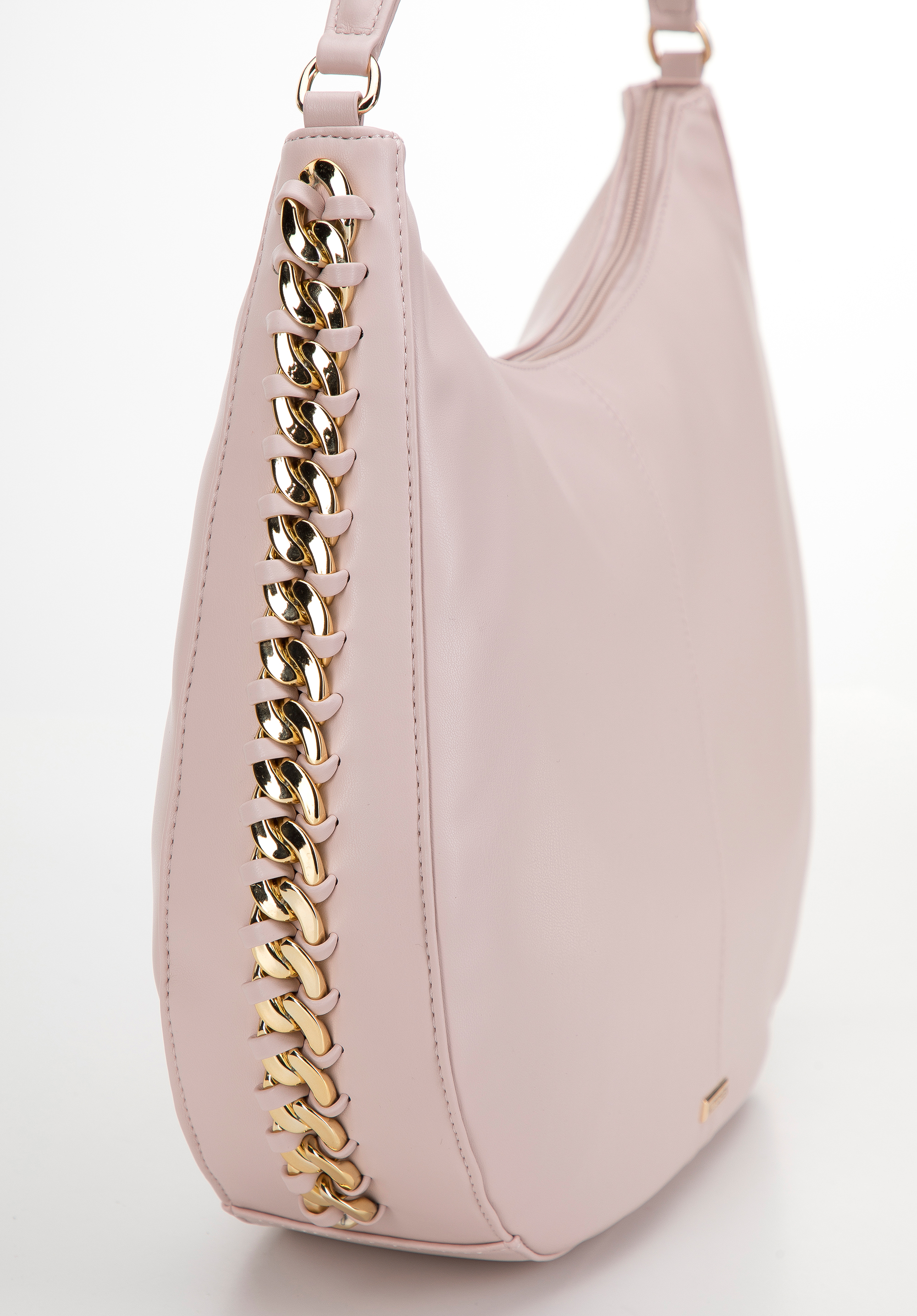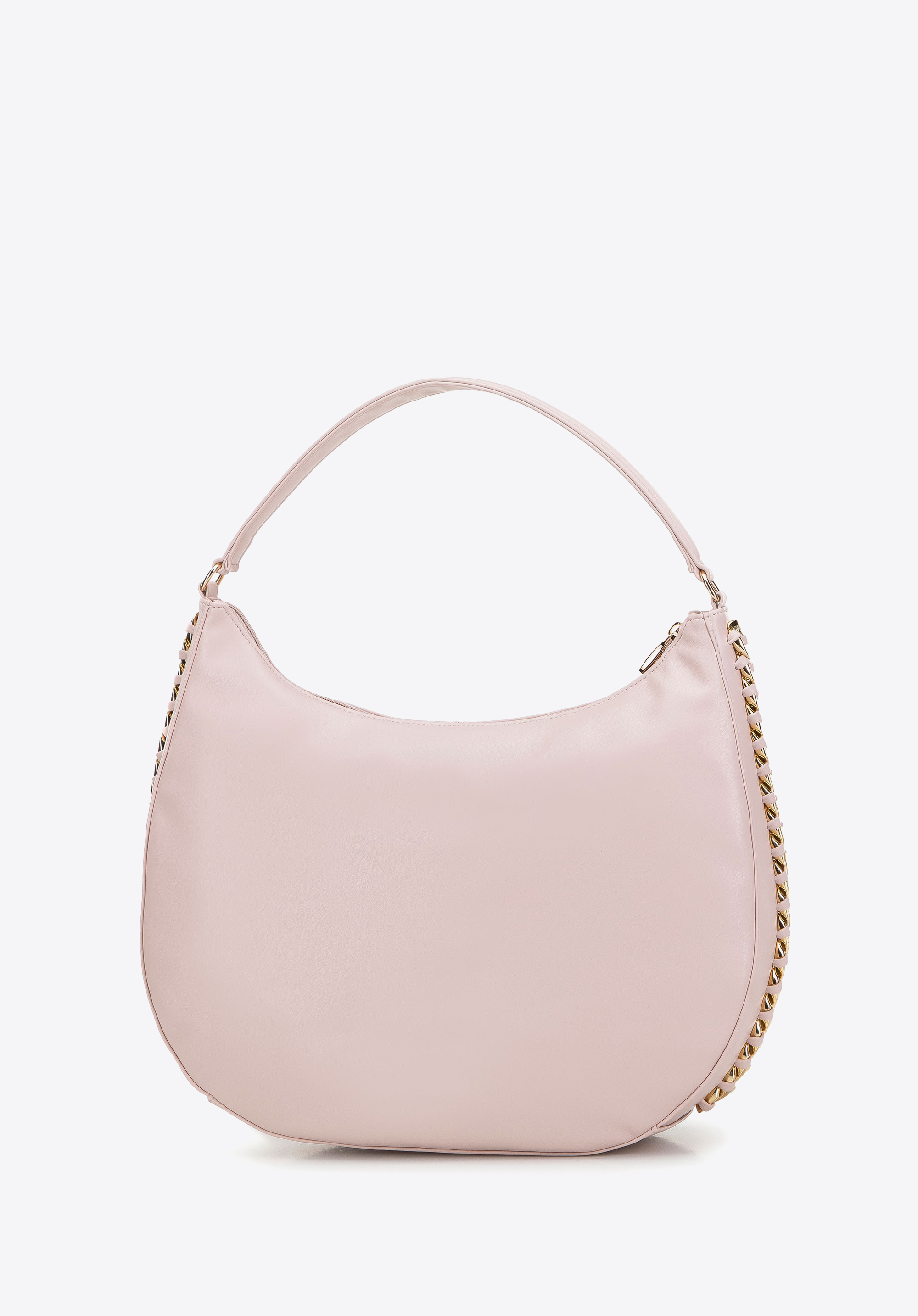 Această geantă mare de damă este perfectă pentru toți pasionații de stil clasic închis într-o formă modernă. Forma delicat rotunjită a acestei genți este împodobită cu un lanț gros strălucitor . Înăuntru poți încăpea aproape tot ce ai nevoie pentru întreaga zi plină: documente în format A4, calendar, portofel, geantă pentru cosmetice, cană termică, eșarfă de rezervă și câteva obiecte mici. O geantă hobo confecționată din piele artificială, cu o garnitură de lanț întrețesut, este o alegere excelentă pentru utilizarea de zi cu zi, atât pentru lucru, cât și după ore.