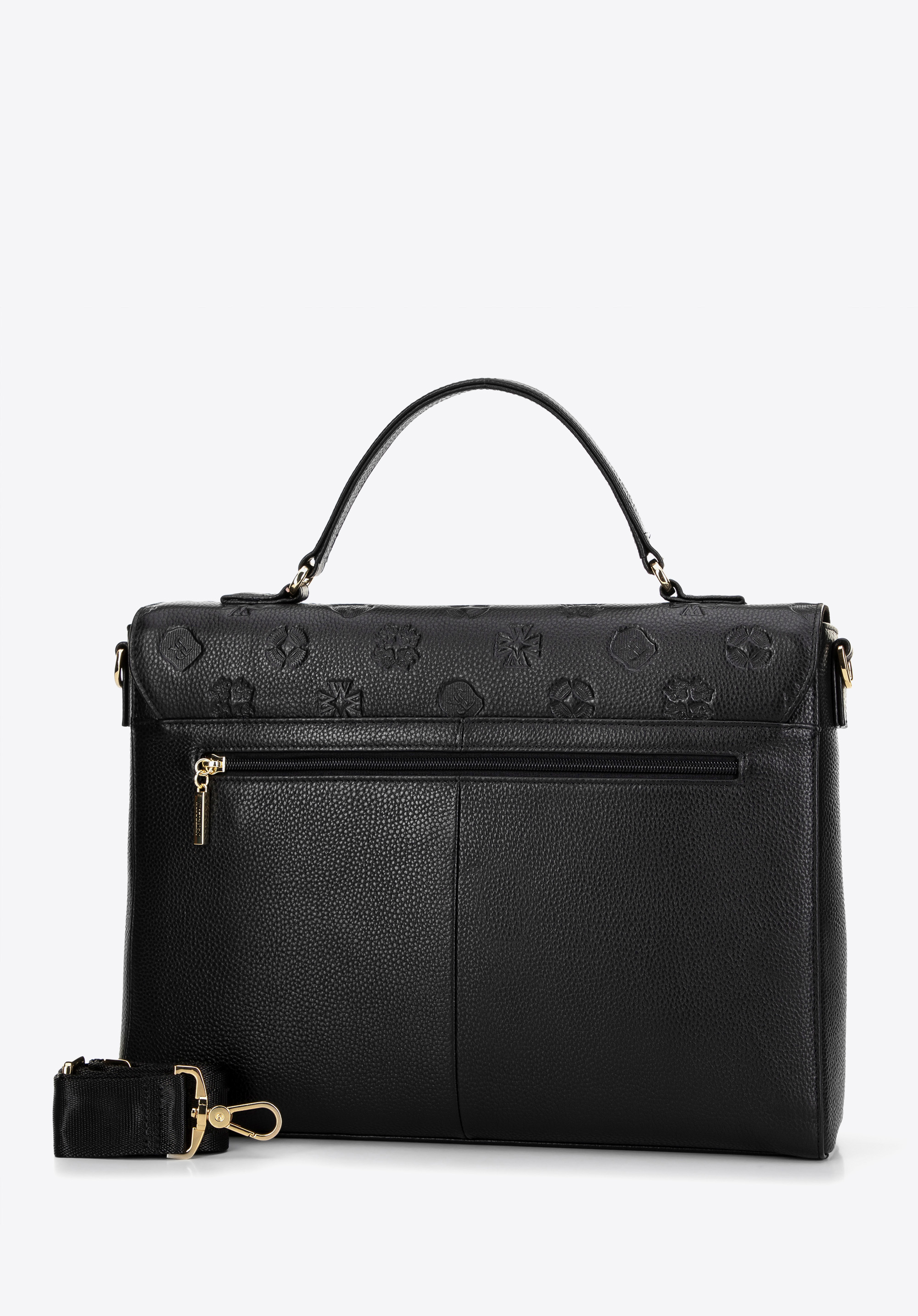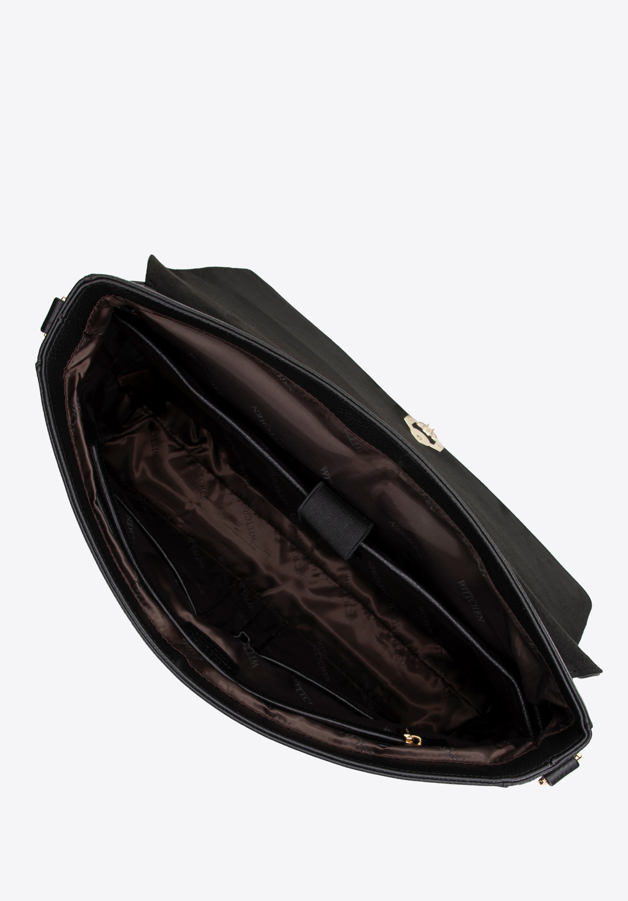 Bun venit în colecția Elegance, unde practicul se întâlnește cu luxul. Geanta noastră pentru laptop este concepută având în vedere profesioniștii moderni care apreciază atât eleganța, cât și confortul. Fabricat din piele pietrișată de înaltă calitate, vă va rezista multe sezoane viitoare. Monograma WITTCHEN elegantă, în relief, adaugă o notă personală, subliniind stilul unic al genții. Cu opțiunea de a atașa o curea de umăr, geanta nu este doar elegantă, ci și funcțională. Baza robustă garantează protecție pentru laptop și alte obiecte valoroase, în timp ce mânerul scurt permite transportul ușor. Interiorul cu un singur compartiment al genții este o capodopera de organizare: două buzunare mici deschise pentru obiecte mici, spațiu pentru două pixuri și un buzunar suplimentar cu fermoar vă vor ajuta să vă păstrați documentele în ordine. Un buzunar exterior suplimentar, ascuns sub clapă, oferă spațiu pentru articolele pe care doriți să le accesați cu ușurință. Un buzunar mare dedicat dispozitivelor electronice cu o curea elastică Velcro asigură transportul în siguranță al laptopului.