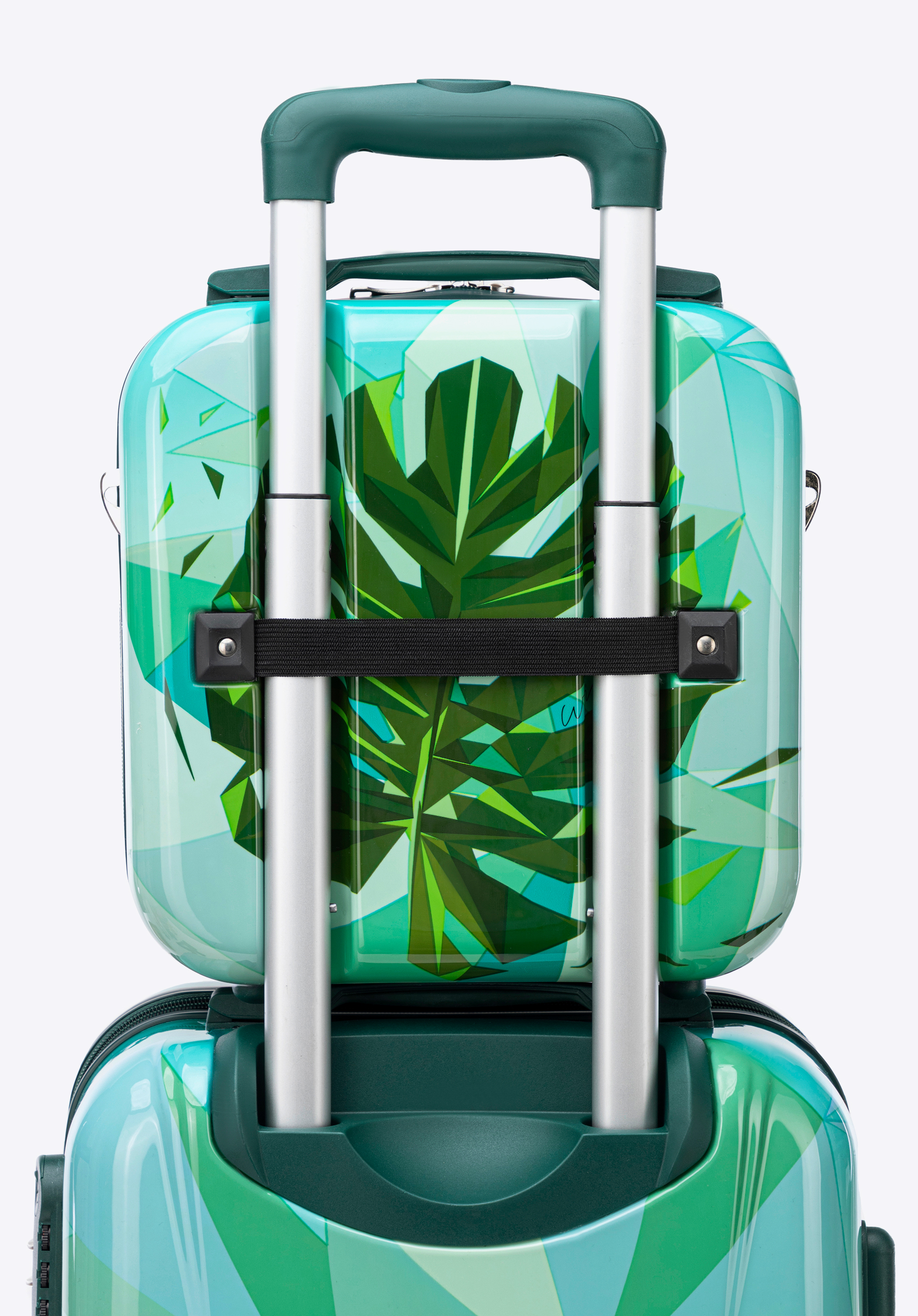 - pe spate o curea elastică care permite fixarea pe mânerul unei valize;