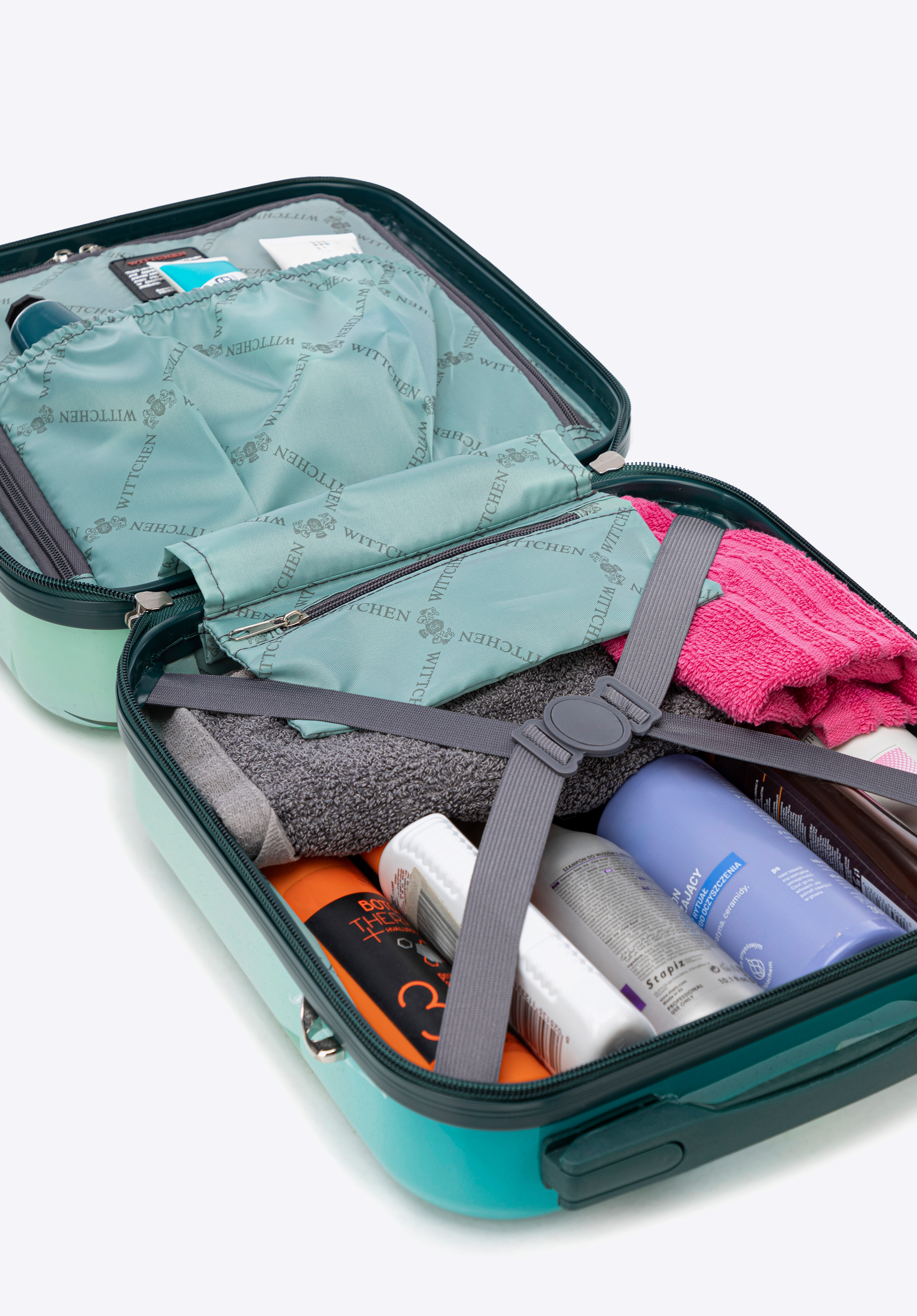 Sfatul nostru: geanta de toaletă are o curea elastică în spate, astfel încât să o puteți agăța de mânerul valizei atunci când călătoriți.