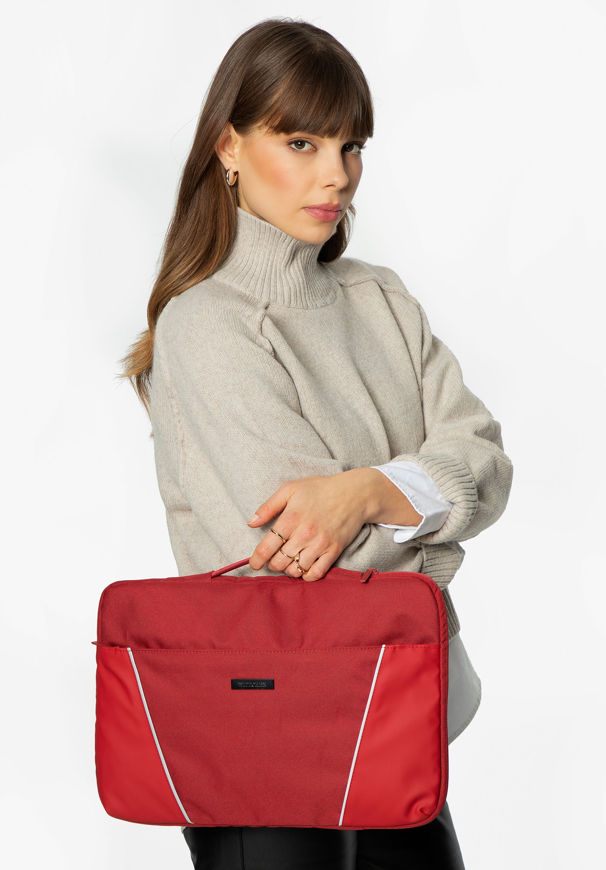 Această husă este un partener de încredere pentru fiecare profesionist, îmbinând funcționalitatea și eleganța într-o armonie perfectă. Mânerul său ergonomic din partea dreaptă facilitează transportul, asigurând un confort de neegalat. Cusăturile subtile și un logo estetic adaugă o notă sofisticată, accentuând perfect designul său elegant. Este o parte esențială a ținutei tale de zi cu zi care nu numai că protejează, ci și subliniază profesionalismul și stilul tău.
