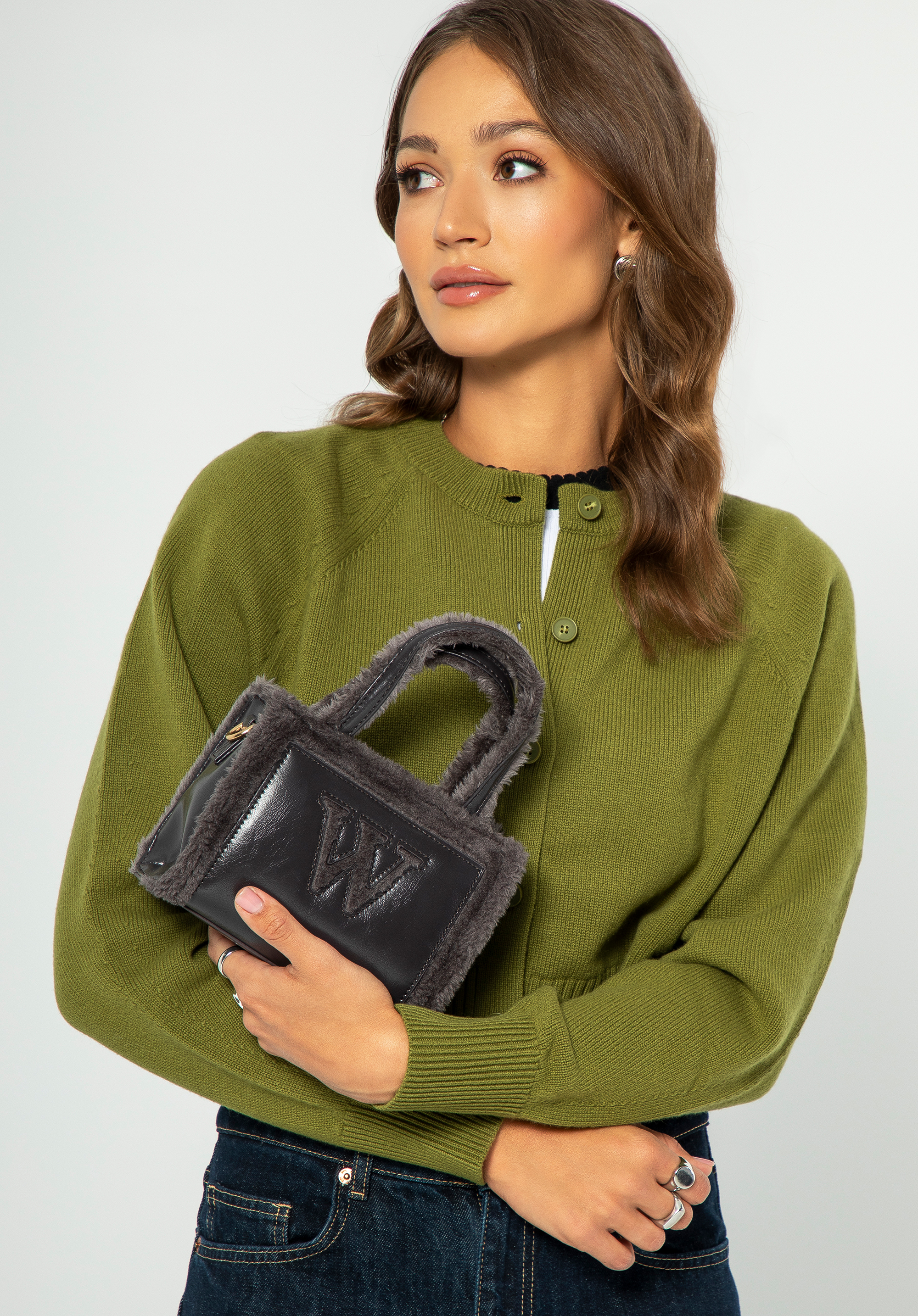 Îți prezint geanta noastră fermecătoare pentru femei, un amestec perfect de eleganță și funcționalitate. Fabricată din piele artificială de înaltă calitate, această mini geantă de mână se mândrește cu un caracter unic datorită deataliilor atente din blană artificială de-a lungul marginilor și mânerelor. Partea din față a genții tote este decorată cu o literă elegantă de blană „W” și un logo subtil al designerului pe lateral, subliniind stilul său distinctiv.