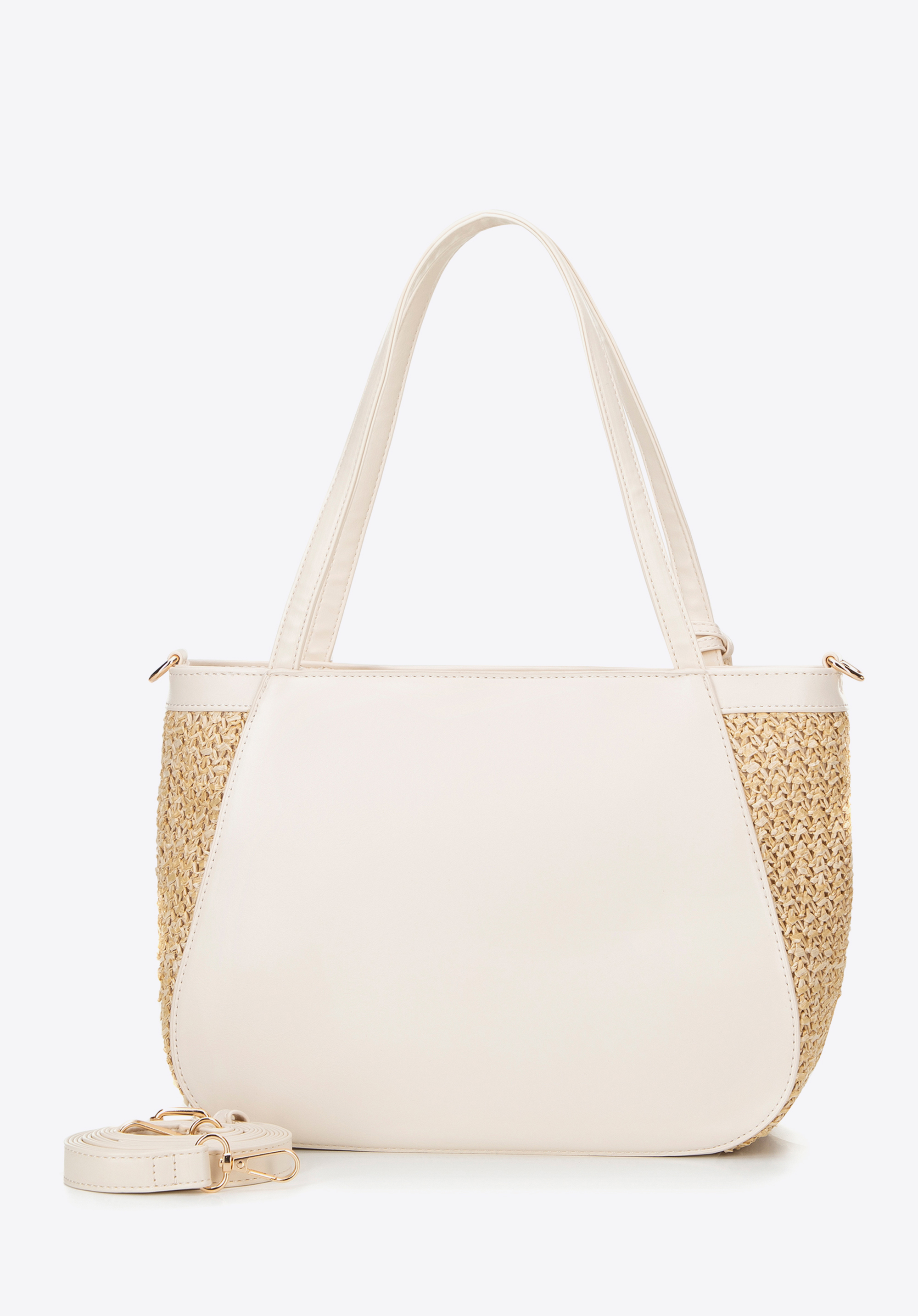 Această geantă elegantă, cu o împletitură unică, asemănătoare cu paiele, este o alegere perfectă pentru zilele de vară. Fabricat dintr-o combinație de piele artificială mată și împletitură decorativă , are o formă structurată, ușor rotunjită , care îmbină stilul și funcționalitatea. În ciuda dimensiunilor sale mici, poate găzdui cu ușurință un portofel, o geantă mică de cosmetice, o sticlă de apă și alte lucruri esențiale.